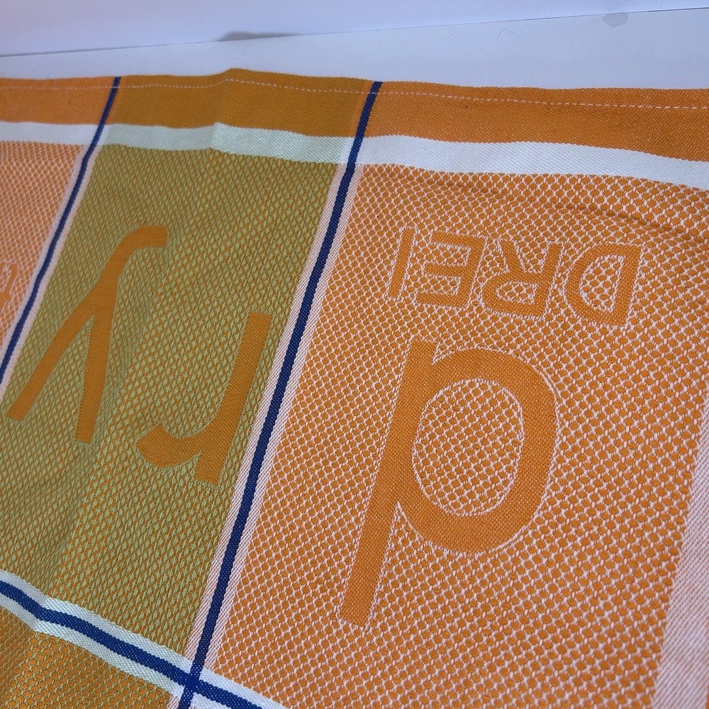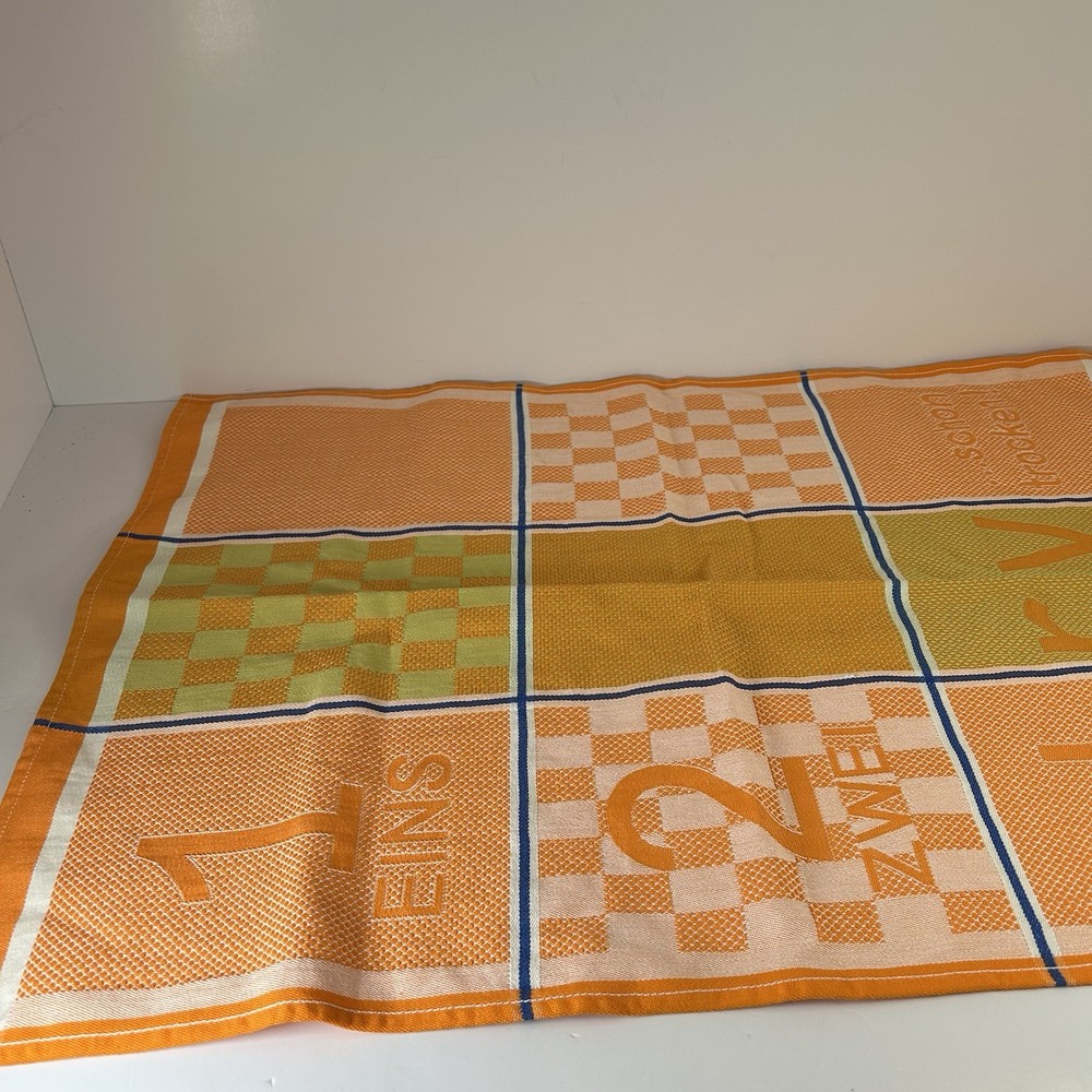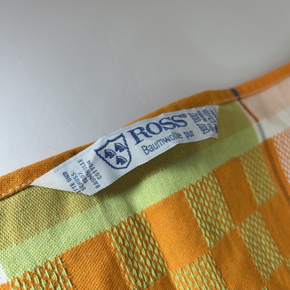 ROSS Germany 100% Cotton Tea Towel Orange Blue Stripe Writing Good overall condition. Fast shipper.