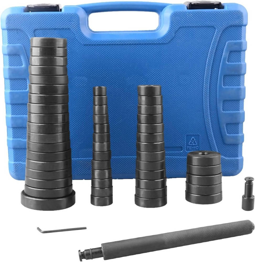 52 in 1 Custom Bushing Driver Set, Transmission Bushing Driver Removal Set Wheel Axle Bearing Race and Seal Installer Tool Kit Master Bushing Tool Set ---- deluxe custom driver kit, assist in the bearing race and seal replacement on your car, truck transmission, axle, wheel hub when installing new bearing seal back into your vehicles Universal Compatibility ---- our bearing and seal driver set has 50 interchangeable discs, giving you an amazing 2,450 different variations due to each of the 50 discs being interchangeable with each other. The discs go from 0.7 inches all the way to 2.55 inches in 1mm increments plus 2.9 inches. All discs are connected with a 0.47 inches shaft and screw which connects to a 7.08 inch handle, making the wheel bearing driver set complete and effect. Heavy Duty and Durability ---- heavy-duty carbon steel construction; black anodic oxidation for ultimate anti-rust performance, these components will stand up to heavy use and accidental drops. Perfect for off road weekend warriors, novices, and professional mechanics. Effective Press Kit ---- everything you need for a fast & effective removal and installation of wheel bearings on your cars or trucks; easily replaces wheel bearings with our multi-size bushing discs and heavy-duty long handle shaft Comes with the case ---- Each kit includes illustrated parts diagram making operation easily. It is equipped with 50pcs bushing discs, 1pc long handle shaft and necessary assemblies. Comes in a heavy duty, blow molded case for every parts, easy for storage and transport.