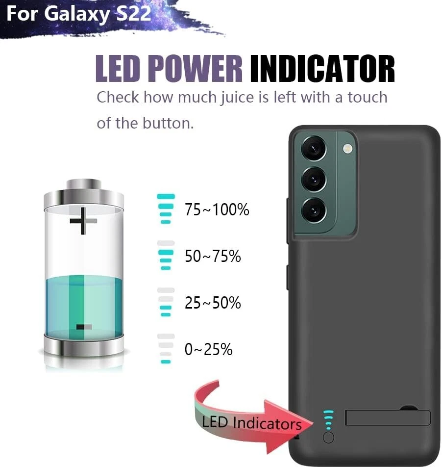 2-in-1 Charging & Protection : Simultaneously charges and protects your Galaxy S22. Includes built-in short-circuit and overcharge protection for added safety. Convenient Power Management : Integrated power switch lets you quickly turn charging on/off. LED indicators display battery status, with each light representing 25% power. Slim & Travel-Friendly Design : Compact and lightweight, perfect for travel or outdoor activities. Provides easy access to phone buttons and ports without removing the case. Durable & Protective : Made of high-quality materials for a comfortable grip and 360º protection against bumps, scratches, and dust. Note: Screen protector not included. Extended Battery Life : Equipped with a powerful 4800mAh lithium-ion battery to provide up to 100% extra juice for long trips or busy days. Compatibility : Exclusively designed for Galaxy S22 (6.1"). Not compatible with Galaxy S22+ or Galaxy S22 Ultra. Type-C wired headphones, Android Auto, quick charging, wireless charging, and Samsung Pay are not supported while using the case