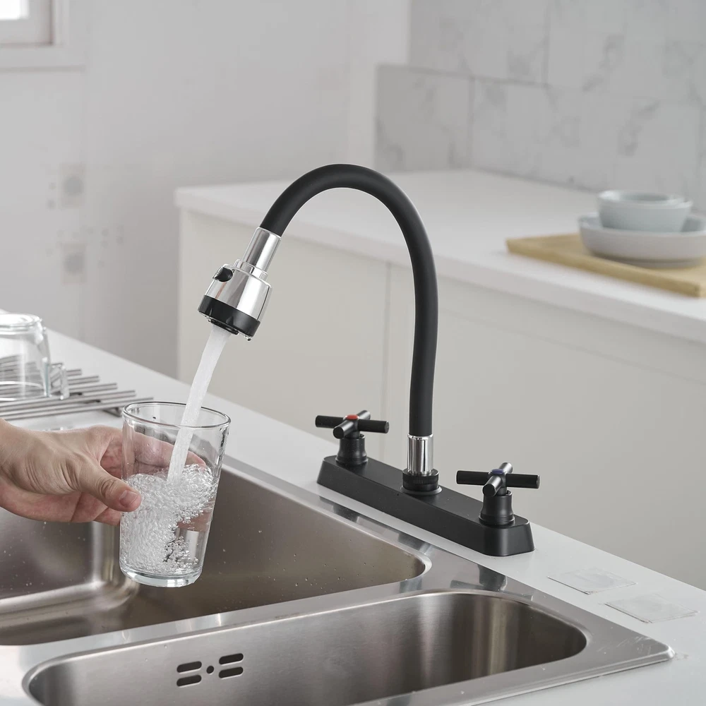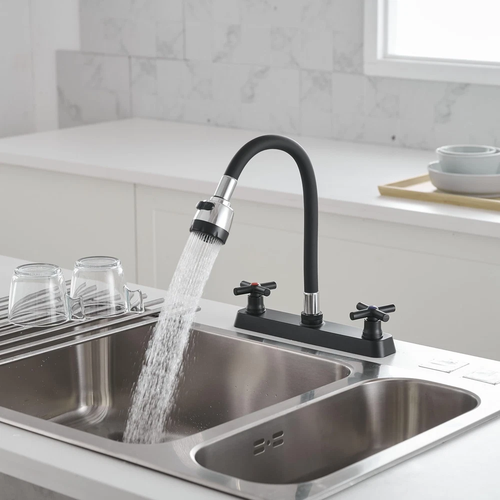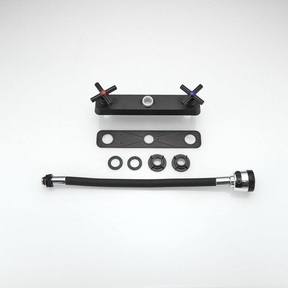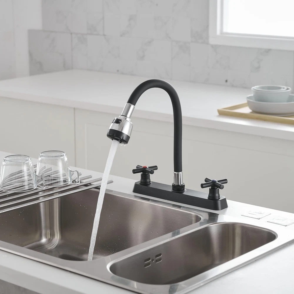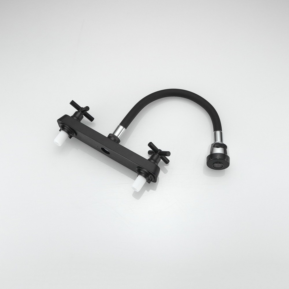The valves are 8 inches apart for standar rv sink Design for faucet, chrome finish, ABS made main body, Silicone arch Package Includes Faucet 24 inch (60 cm) long Hot & Cold Water Hoses Mounting Hardware Movable and Bendable: The RV kitchen faucet designed with 360 degree rotatable tap head and flexible arch allow the rv faucet to rinse the entire sink! It is very easy to move and bend to any spot in the sink and quick to change from a spray to a stream Sleek Design for RV Sink: RV kitchen sink faucet is constructed of silicone arch and lightweight ABS plastic 8-inch body, replacement faucet for RVs, motorhomes, campers, trailers; Black finish easy to match most sink Versatile Water Flow: Enjoy the convenience of two water flow modes: Shower Mode and Bubbler Mode. Easily switch between the two modes for different washing tasks. Enjoy a comfortable and customized washing experience with just a simple turn of the knob. Easy Temperature & Flow Control: The classic cross knob switch design provides effortless operation and allows you to easily adjust the water temperature and flow according to your preference. Easy Installation: Camper faucet kitchen with 1/2 threaded male inlet shanks; Compatible with most standard RV kitchen sink; Easily install without plumber