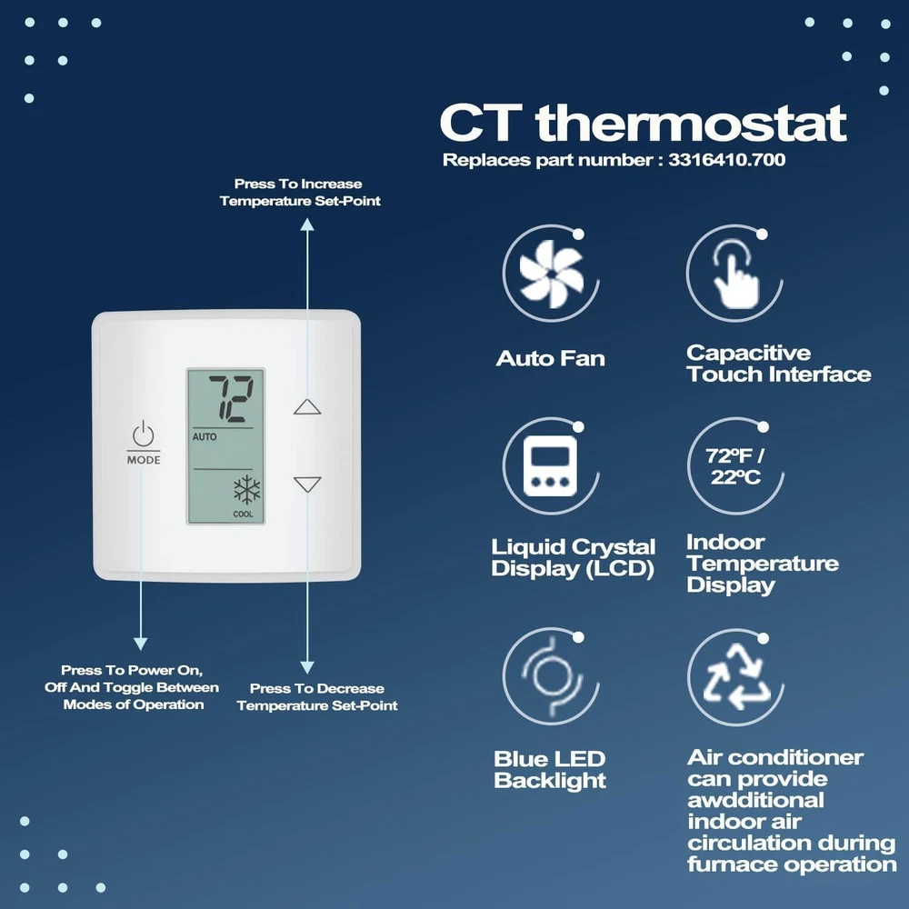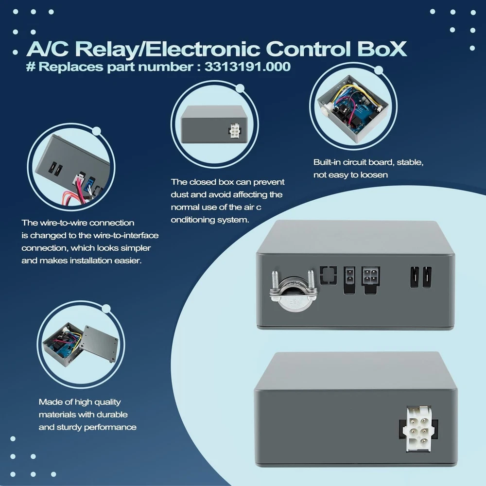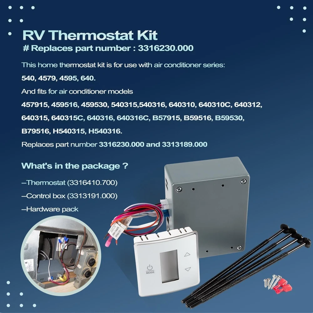 FITMENT: This home thermostat kit is for use with air conditioner series: 540, 4579, 4595, 640. And fits for air conditioner models 457915, 459516, 459530, 540315,540316, 640310, 640310C, 640312, 640315, 640315C, 640316, 640316C, B57915, B59516, B59530, B79516, H540315, H540316. Replaces part number 3316230.000 and 3313189.000 FEATURES: RV Thermostat Kit (3316230.000) Fits for Dometic Single Zone LCD Touch RV Air Conditioner Thermostat with Control Kit, for Cool/Furnace Modes 3316410.700 FITMENT: This home thermostat kit is for use with air conditioner series: 540, 4579, 4595, 640. And fits for air conditioner models 457915, 459516, 459530, 540315,540316, 640310, 640310C, 640312, 640315, 640315C, 640316, 640316C, B57915, B59516, B59530, B79516, H540315, H540316. Replaces part number 3316230.000 and 3313189.000 FEATURES: 1)Excellent Feature-- This thermostat can be installed the wall of your RV or trailer, single zone controls cool/furnace. LCD digital display screen, easy to see your temperature, mode and set point. Polar white capacitive touch case with control board, you can gentle taps on three input areas of the control give you access to all the climate control features including low/ high/ auto fan speed control and auto/ on mode fan control. 2)LCD Thermostat-- This LCD thermostat for campers is constructed with high-quality materials, ensuring durability and reliable performance. The large custom LCD display provides easy readability, while the blue backlight enhances visibility in low-light conditions. The Single Zone LCD Thermostat allows centralized control of interior heating and cooling. 3)Package Include-- Includes thermostat (3316410.700) and control box (3313191.000), and hardware pack. 4)Satisfaction Guarantee-- If you have any inquiries regarding the RV Thermostat Kit (3316230.000), please do not hesitate to contact us. We offer a 30-day refund guarantee and a 12-month warranty for quality-related issues. PRODUCT DESCRIPTION: PACKAGE INCLUDES: Thermostat (3316410.700) Control box (3313191.000) Hardware pack Item Specifics Brand NO-Auto Manufacturer Warranty 1 Year Manufacturer Part Number NOQP2027 Type RV Thermostat Kit (3316230.000) Fitment for Dometic Single Zone LCD Touch RV AC Thermostat Material ABS Color White OEM 3316410.700 Single item or Set Set Surface Finish Polished Payment 1. Payment methods accepted: Payoneer . Our Payoneer account allows you to pay by credit card, debit card and your paypal balance. 2. We ship items to Your Ebay address .Please make sure your Ebay address is correct before you pay, cause it cannot be changed once the order shipped out. Shipping 1. Item will be shipped out within 1-2 business day after clear payment received. 2. Please make sure shipping address on your ebay account is correct & up-to-date. 3. All of our items are shipped from our AU warehouse. 4. Please feel free to contact us by email if you cannot get your order in time. Please read the shipment and payment detail carefully before you bid. Returns 1. Return to us within 30 days from the delivery date for exchange or refund. Refund will be given as Money back or item exchange (buyer's choice). 2. Return shipping fee is the responsibility of buyer unless the return is a result of our mistake. 3. If you need return, please contact our customer service representative, let us know the detailed problem and send us some pictures for confirmation. Contact Us Please contact us via ebay using" Contact member ". We will respond within 1 business day or less.Thank you for your understanding. Our office hours is as below : - 9:00 a.m. to 6:00 p.m. (GMT +8) of Monday to Friday - 9:00 a.m. to 1:00 p.m. (GMT +8) of Saturday And our office is closed on Sunday and public holidays. We apologize for the late reply during the holidays.Please contact us via ebay using" Contact member ". We will respond within 1 business day or less. Please include your ebay item number or order number in all communications. DESCRIPTION PAYMENT SHIPPING RETURN POLICY CONTACT US Shop Category Store Home Car & Truck Accessories Motocycle Accessories Boat Parts ATV &UTV Truck Accessories Oil Filter Wrench Caps Home & Garden Business & Industrial Parts Automotive Tools & Supplies Personal Watercraft Parts RV&Trailer&Camper Accessories Sporting Goods Tools, Hardware & Locks Jewelry & Watches Performance & Racing Parts Collectibles Other Hot Item R50864/ R161382 Gear Shift Knob for John Deere Tractors 1020 2020 2640 2755 4430 USD 13.85 KK-4835 Porter Cable Oil Free Air Compressor Piston Rod Kit A02743 for Craftsman USD 78.20 Upgraded Pressure Washer Seal Kit Used on Some Medium Frame Pressure Washer Pump USD 25.15 2x Steering Damper for Exmark Toro 116-0027 109-9820 Lazer Z Master G3 Advantage USD 51.49 Waterproof Generator Cover w/ Storage Pocket for Honda Eu2000i Eu2200i Generator USD 17.30 Picture New List Item 3312020.000 RV Thermostat Control Board for Dometic Multi-Zone CCC2 Model 57915 USD 158.66 R0524800 R0524700 Device Side A/B for Zodiac Baracuda MX8,MX6,Elite Pool Cleaner USD 66.44 PC12 Power Cord Cable 6 Feet for Humminbird SOLIX and Onix Fish Finders 720085-1 USD 28.83 1/2" Boiler Pressure Relief Valve S1156F for Watts 1156F B1156F S1156F USD 94.32 R0445400 Diffuser with O-Ring Hardware Kit for Zodiac Jandy ePump Pool Spa Pumps USD 58.78 Help & Info Payment Policy Shipping Policy Return Policy FAQ About Us RV Thermostat Kit (3316230.000) Fits for Dometic Single Zone LCD Touch RV Air Conditioner Thermostat with Control Kit, for Cool/Furnace Modes 3316410.700 FITMENT: This home thermostat kit is for use with air conditioner series: 540, 4579, 4595, 640. And fits for air conditioner models 457915, 459516, 459530, 540315,540316, 640310, 640310C, 640312, 640315, 640315C, 640316, 640316C, B57915, B59516, B59530, B79516, H540315, H540316. Replaces part number 3316230.000 and 3313189.000 FEATURES: 1)Excellent Feature-- This thermostat can be installed the wall of your RV or trailer, single zone controls cool/fu
