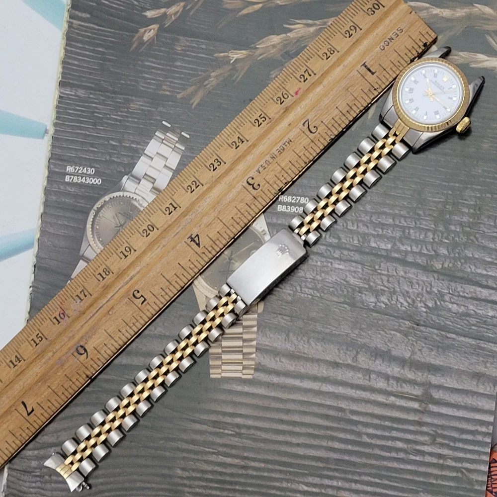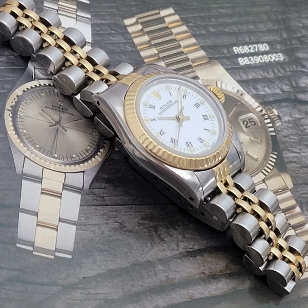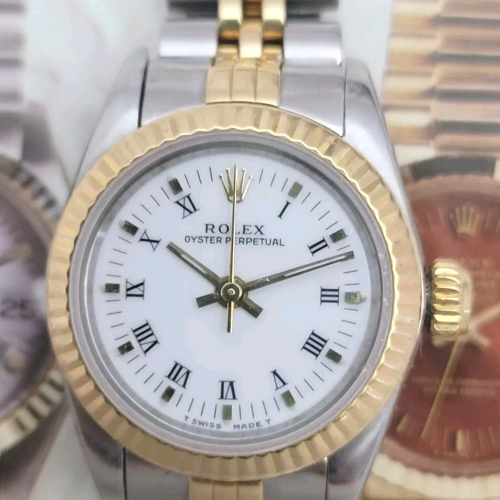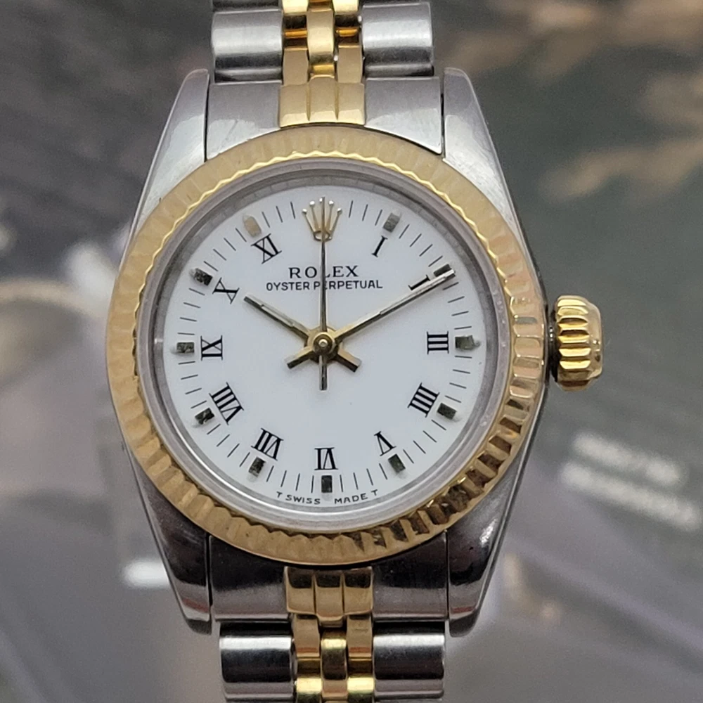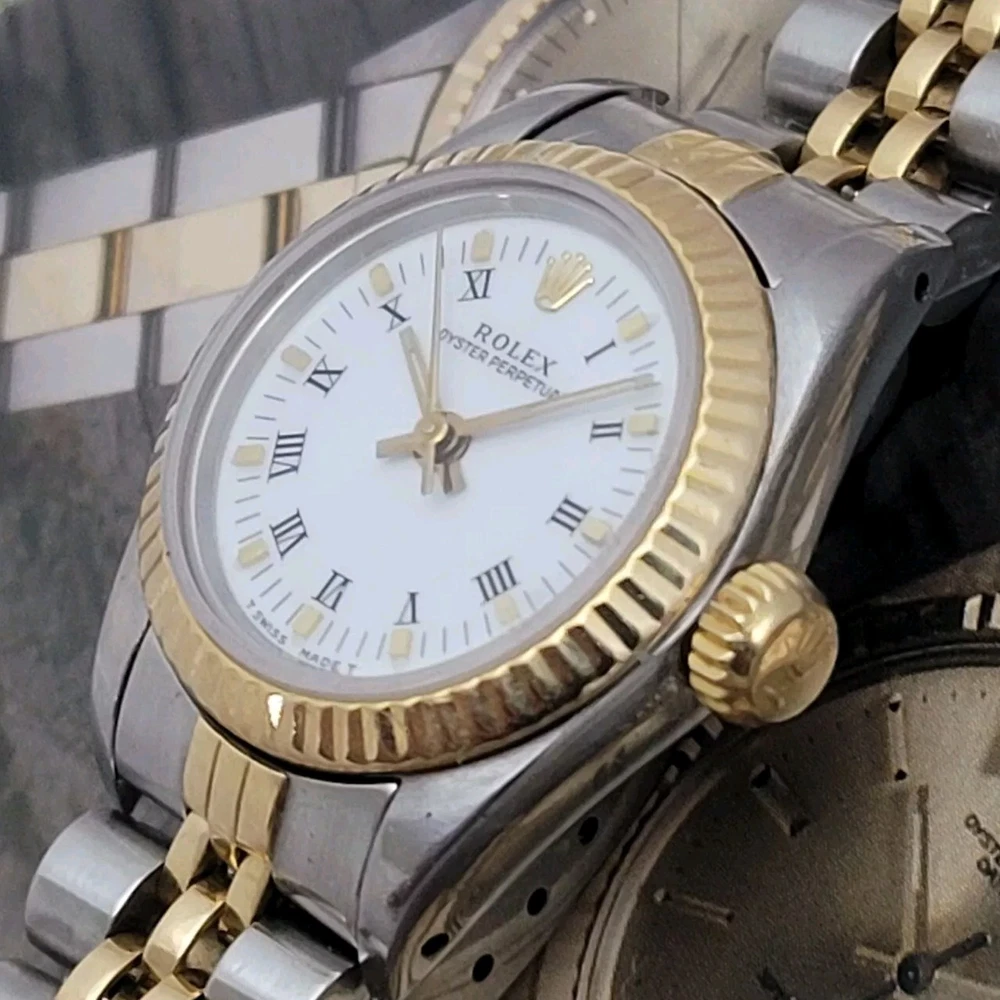 Presented here in true auction format starting at only one penny is this magnificent ladies automatic 18 karat gold and stainless steel 100% original Rolex oyster perpetual. This beauty has just been fully serviced and comes with a 3-month service warranty for your added satisfaction and convenience! This Rolex Oyster Perpetual model 67193, a timeless Swiss masterpiece that seamlessly blends luxury and functionality. Her quality is unsurpassed, crafted with a harmonious combination of18k yellow gold and stainless steel, embodying both elegance and durability. You're going to love the 100% original brilliant white dial set with the midnight black Roman numerals that accurately indicate the passing time, beneath the sapphire crystal, to the gorgeous solid 18k gold hands. Each of the hour markers are raised above the dialed surface and solid 18 karat gold. Key Features: Case and Bracelet: The 24mm stainless steel oyster case is complemented by an 18k yellow gold fluted bezel and a matching two-tone solid 18k & steel bracelet. The original Rolex logo 18 karat gold screw down crown completes the instantly recognizable Rolex two-tone look ensuring a sophistication and style that stands out in any setting. Movement: Swiss quality reliability is the key feature of the fully automatic Rolexs renowned automatic self-winding oyster perpetual movement. This watch guarantees precision and reliability, certified as a chronometer and has just been fully serviced by a master watchmaker, coming with a 3-month service warranty. Dial: The white dial, adorned with elegant Roman numeral hour markers and gold hands, offers a classic yet striking appearance suitable for every event in your life from a day in the office, a night on the town or a weekend at the beach.The scratch-resistant sapphire crystal ensures the dial remains pristine over time. Crown: The 18k yellow gold crown, featuring the iconic Rolex logo, adds a touch of luxury and ensures easy time-setting. To set the time, rotate the crown counterclockwise unscrewing it from the body of the watch. This will put you in the winding position should you need to wind her. To set the time, pull the crown outwards to the time setting position. This Rolex Oyster Perpetual is not just a watch; its a statement of elegance and sophistication. Whether youre attending a formal event or enjoying a casual day out, this timepiece will elevate your style and leave a lasting impression. Indulge in the luxury of Rolex and experience the perfect blend of tradition and innovation with the Oyster Perpetual. Somebody is going to be very pleased when they place the winning bid. Check out all the pictures of this watch that truly do not do her Justice! Good luck to you all! ___________________________________ Take a few minutes and read some of the tens of thousands of positive feedback that we have received from our users here at Decowatches and our sister site Decowatchesparts and you will understand why buying a watch from us is an enjoyable and safe experience! Our shipping fee ensures that this watch is carefully packaged, fully insured, has door to door tracking and comes with a three-month service warranty for your added piece of mind satisfaction and convenience! We are pleased to say that we are now shipping twice a week, either Wednesday or Thursday and Saturdays. Thank you for viewing this gorgeous ladies Rolex and good luck to you all! Emerson