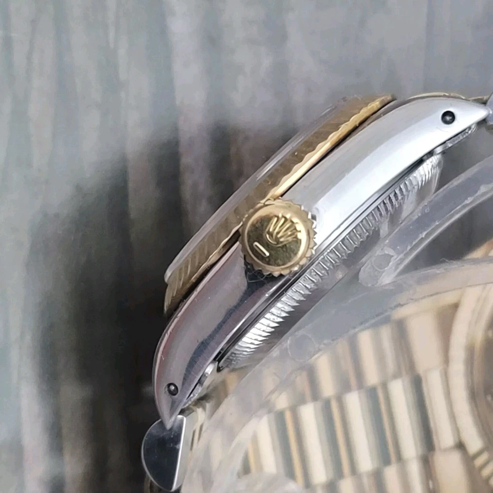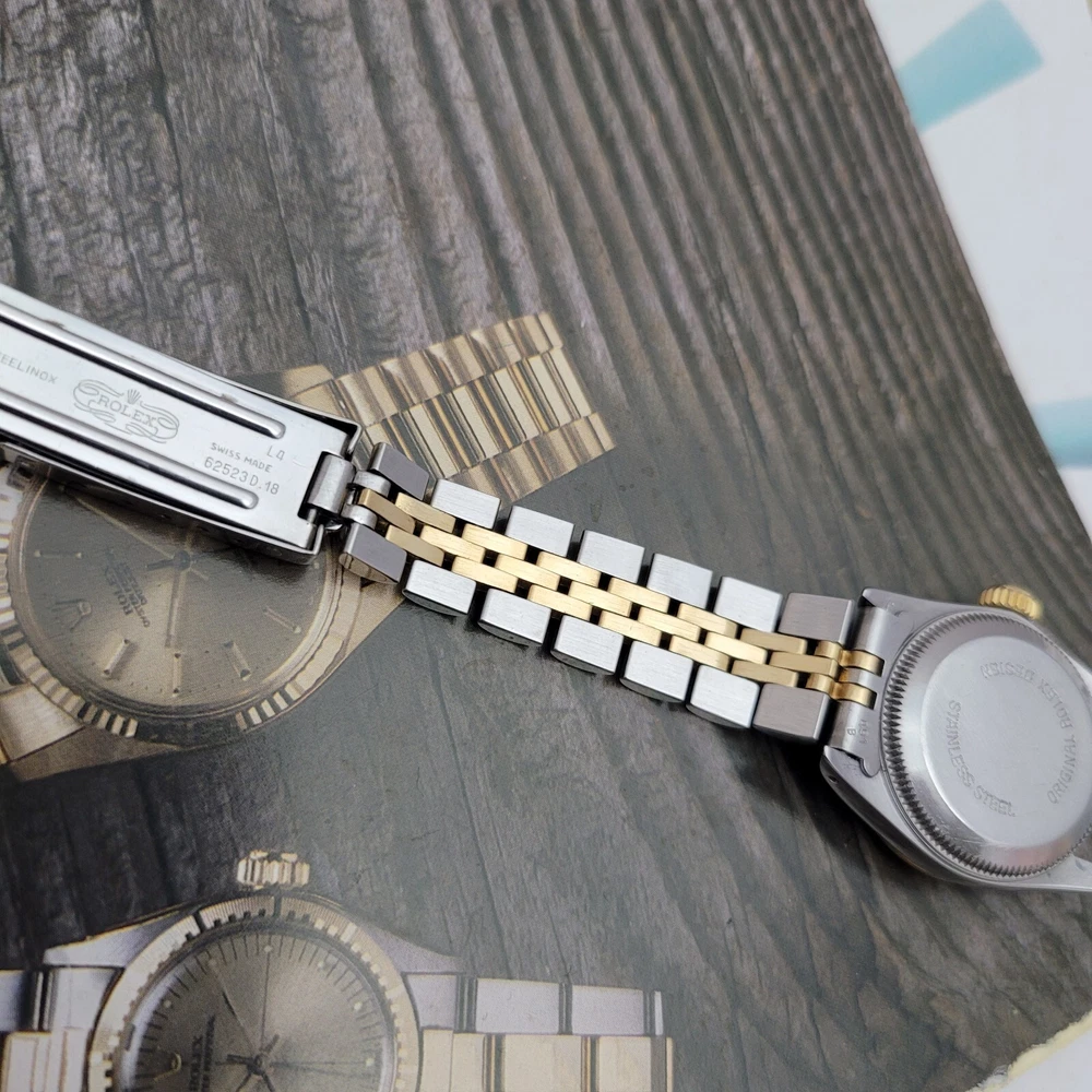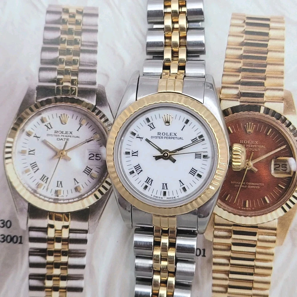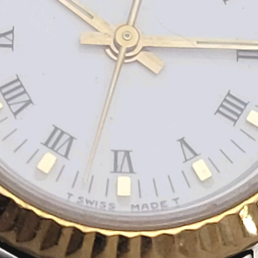 Presented here in true auction format starting at only one penny is this magnificent ladies automatic 18 karat gold and stainless steel 100% original Rolex oyster perpetual. This beauty has just been fully serviced and comes with a 3-month service warranty for your added satisfaction and convenience! This Rolex Oyster Perpetual model 67193, a timeless Swiss masterpiece that seamlessly blends luxury and functionality. Her quality is unsurpassed, crafted with a harmonious combination of18k yellow gold and stainless steel, embodying both elegance and durability. You're going to love the 100% original brilliant white dial set with the midnight black Roman numerals that accurately indicate the passing time, beneath the sapphire crystal, to the gorgeous solid 18k gold hands. Each of the hour markers are raised above the dialed surface and solid 18 karat gold. Key Features: Case and Bracelet: The 24mm stainless steel oyster case is complemented by an 18k yellow gold fluted bezel and a matching two-tone solid 18k & steel bracelet. The original Rolex logo 18 karat gold screw down crown completes the instantly recognizable Rolex two-tone look ensuring a sophistication and style that stands out in any setting. Movement: Swiss quality reliability is the key feature of the fully automatic Rolexs renowned automatic self-winding oyster perpetual movement. This watch guarantees precision and reliability, certified as a chronometer and has just been fully serviced by a master watchmaker, coming with a 3-month service warranty. Dial: The white dial, adorned with elegant Roman numeral hour markers and gold hands, offers a classic yet striking appearance suitable for every event in your life from a day in the office, a night on the town or a weekend at the beach.The scratch-resistant sapphire crystal ensures the dial remains pristine over time. Crown: The 18k yellow gold crown, featuring the iconic Rolex logo, adds a touch of luxury and ensures easy time-setting. To set the time, rotate the crown counterclockwise unscrewing it from the body of the watch. This will put you in the winding position should you need to wind her. To set the time, pull the crown outwards to the time setting position. This Rolex Oyster Perpetual is not just a watch; its a statement of elegance and sophistication. Whether youre attending a formal event or enjoying a casual day out, this timepiece will elevate your style and leave a lasting impression. Indulge in the luxury of Rolex and experience the perfect blend of tradition and innovation with the Oyster Perpetual. Somebody is going to be very pleased when they place the winning bid. Check out all the pictures of this watch that truly do not do her Justice! Good luck to you all! ___________________________________ Take a few minutes and read some of the tens of thousands of positive feedback that we have received from our users here at Decowatches and our sister site Decowatchesparts and you will understand why buying a watch from us is an enjoyable and safe experience! Our shipping fee ensures that this watch is carefully packaged, fully insured, has door to door tracking and comes with a three-month service warranty for your added piece of mind satisfaction and convenience! We are pleased to say that we are now shipping twice a week, either Wednesday or Thursday and Saturdays. Thank you for viewing this gorgeous ladies Rolex and good luck to you all! Emerson