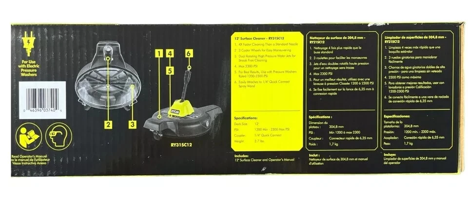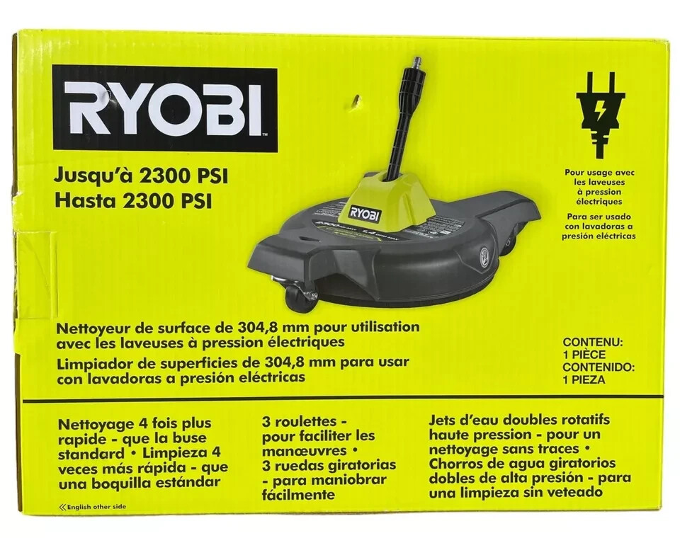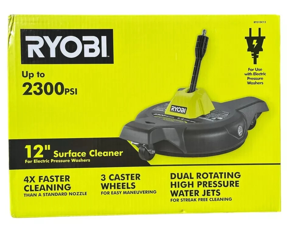 About This Product The RYOBI 12 in. Surface Cleaner is the ideal choice for cleaning hard surfaces like driveways, patios, and sidewalks. This surface cleaner is compatible with electric or cordless pressure washers up to 3100 PSI and 1.2 GPM. This time saving accessory cleans up to 4X faster than a standard nozzle, with rotating high pressure water jets that provide a large, streak-free path. It is designed with three caster wheels to easily maneuver from one area to the next. The 12 in. surface cleaner easily attaches to a 1/4 in. quick connect wand, allowing you to move quickly between jobs. The RYOBI 12 in. Surface Cleaner is compatible with most electric and cordless pressure washer brands. Highlights Ideal for driveways, patios, and sidewalks Cleans up to 4X faster than a standard nozzle Rotating jets for a streak-free cleaning path 1/4 in. quick-connect 3 caster wheels for easy maneuvering Fits most electric and cordless pressure washer up to 1200 - 3100 PSI 1.2 GPM
