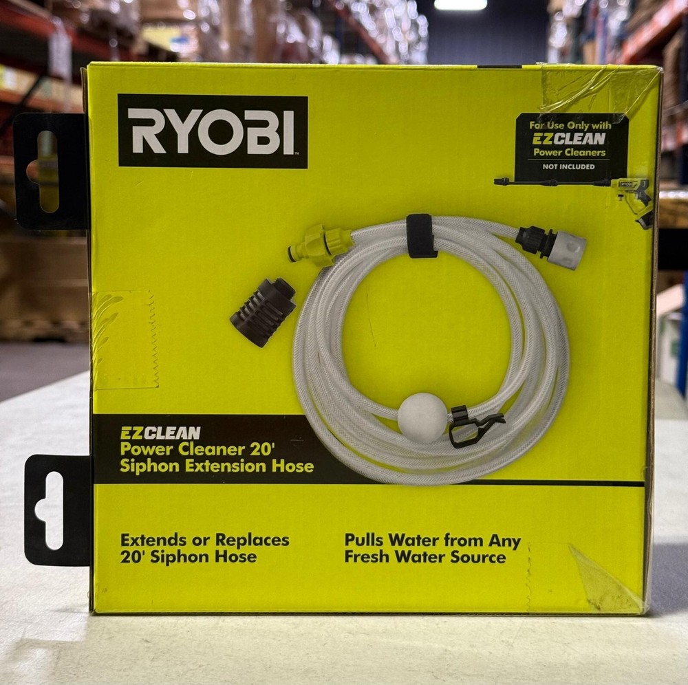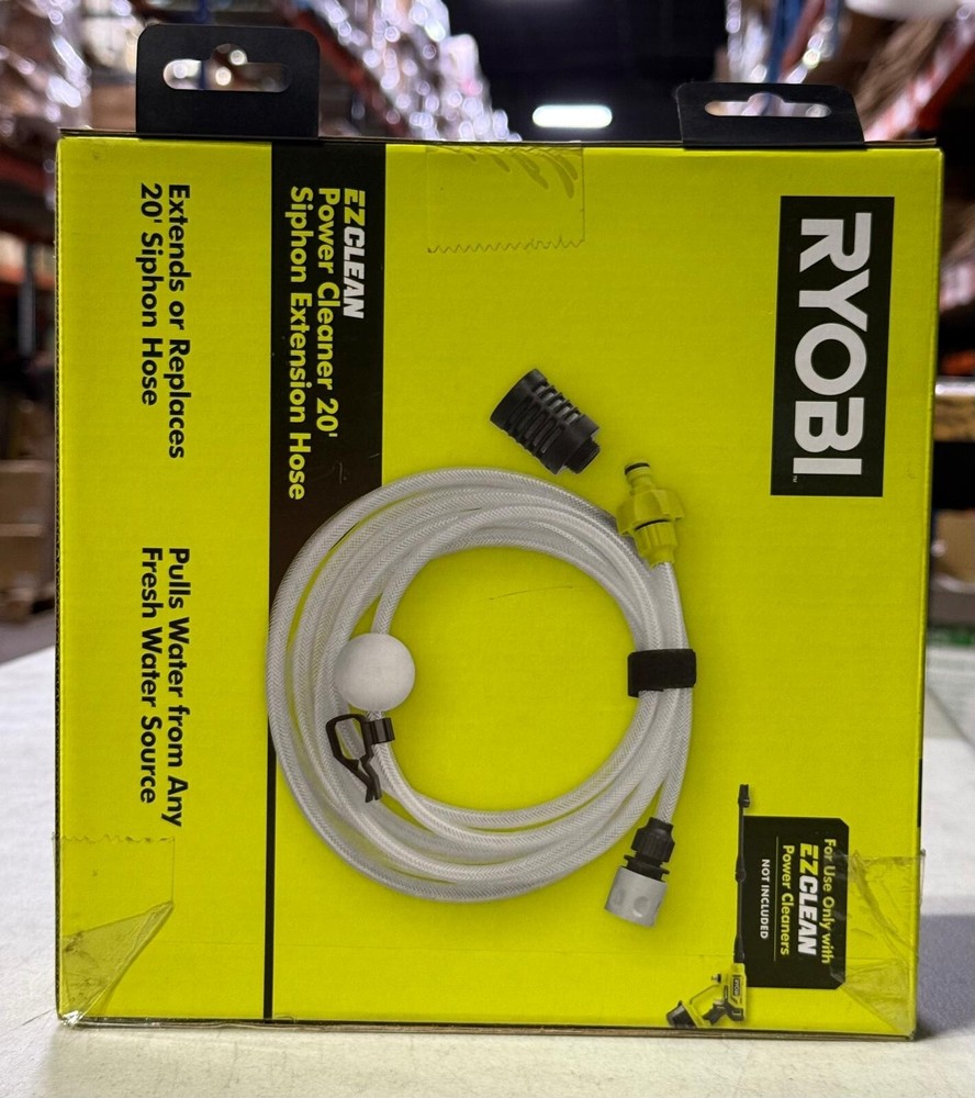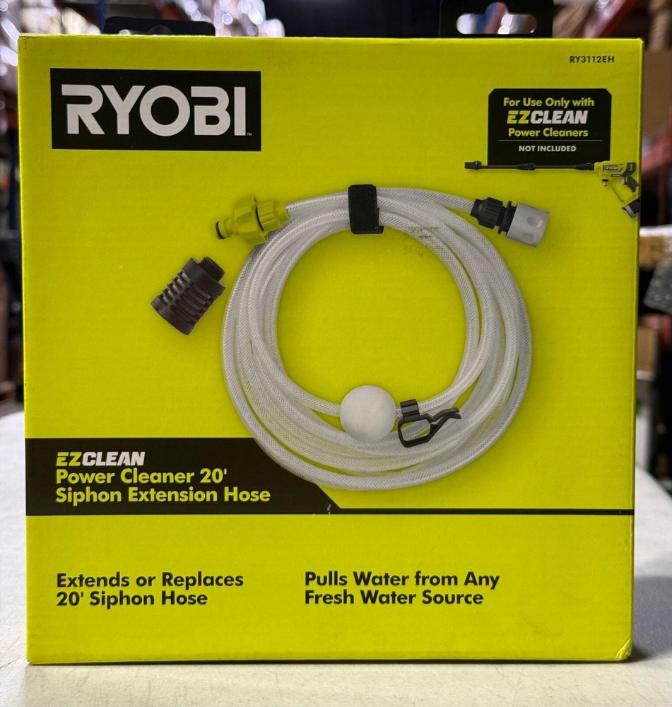 About This Product The RYOBI EZClean Siphon Extension Hose will allow you to clean wherever you have a fresh water source. This Siphon Extension Hose quickly connects to the Power Cleaner at the water inlet with a simple click making it easy to move from 1 cleaning job to the next. Seamlessly toss the siphon end of the hose into any fresh water source for instant cleaning. Next time you have a dirty job at the lake or near your pool with no garden hose available the siphon hose is the perfect solution to tackle those jobs. The hose can act as a 20 ft. extension or a replacement hose for your RYOBI power cleaner. The RYOBI EZClean Siphon Extension Hose can only be used with the RYOBI Power Cleaners. The EZClean family includes a variety of attachments that connect to the RYOBI Power Cleaners to help you easily clean the dirtiest of jobs. Highlights Can only be used with RYOBI EZClean power cleaners 20 ft. hose length Quick connect system EZClean system provides portable on the go cleaning Not compatible with traditional gas or corded electric pressure washers Only compatible with RYOBI EZClean power cleaners (RY12350VNM, RY12352KVNM, RY121850VNM, RY121852KVNM, RY124050VNM, RY124052KVNM) Product Information Internet # 316242517 Model # RY3112EH Store SKU # 1007712453