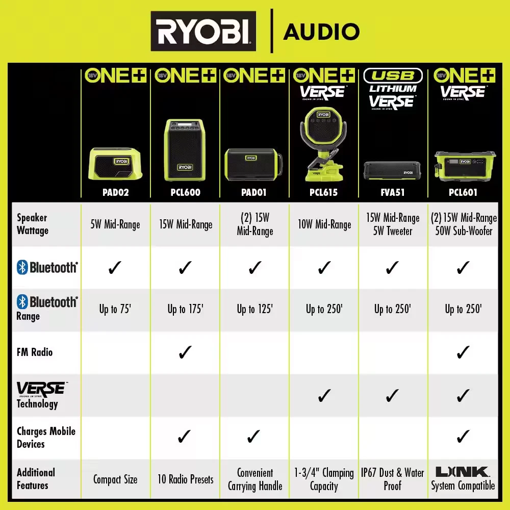 Premium Sound Quality And VERSE Multi-Speaker Connectivity IP67 Dust And Waterproof Built To Withstand All Conditions Powered By The RYOBI USB Lithium Battery System The RYOBI USB Lithium VERSE Compact Speaker Kit is the perfect blend of portability and premium sound. The powerful speaker and tweeter create studio-quality sound, anywhere you go. The IP67 dustproof and waterproof rating ensures this speaker is a reliable solution built to withstand all conditions. Listen to what you want, where you want, with up to 250’ of BLUETOOTH range. Utilize this speaker independently or use VERSE technology to connect additional speakers for even greater sound, no app required. Quickly & easily connect 100+ RYOBI VERSE speakers with up to 125' of speaker to speaker connection range. Stay powered with up to 6 hours of runtime. Use the speaker’s on-board USB-C charging port for unlimited runtime or swap batteries and charge them remotely with the included USB cable. The included USB Lithium 2Ah battery features a USB-C port that also charges mobile devices, and a LED fuel gauge that clearly indicates the battery level status with the press of a button, eliminating guess work. The product also features an LED indicator to signal when the battery is charged (green) or has low battery (red) while in-use. Best of all, it is part of the RYOBI USB Lithium System of tools that provides compact, rechargeable, everyday solutions for cordless power and productivity. The USB Lithium VERSE Compact Speaker Kit is backed by the RYOBI 2-year manufacturer's warranty and includes a USB Lithium 2Ah Lithium Battery, USB Cable, Lanyard and Operator's Manual. Powerful speaker and tweeter for premium and dynamic sound Take this speaker anywhere with IP67 dustproof and waterproof rating Amplify your experience seamlessly by connecting 100+ RYOBI VERSE products without the use of an app (USB Lithium Compact Speaker, 18V ONE+ Clamp Speaker and 18V ONE+ LINK Stereo) Stay connected with up to 250’ of BLUETOOTH streaming range and up to 125’ to VERSE secondary speaker Up to 6 hours of runtime (With included 2Ah battery) Recharge USB Lithium Batteries while you listen with the on-board USB-C port providing unlimited runtime On-board LED indicators signal battery and connection status The included USB Lithium 2Ah battery features a USB-C port that also charges mobile devices LED fuel gauge on the battery indicates battery level status with the press of a button The RYOBI USB Lithium Battery System: Everyday Solutions. Rechargeable Power. 2-year manufacturer’s warranty Includes: FVA51 USB Lithium VERSE Compact Speaker, USB Lithium 2Ah Lithium Battery, USB Cable, Lanyard, and Operator's Manual