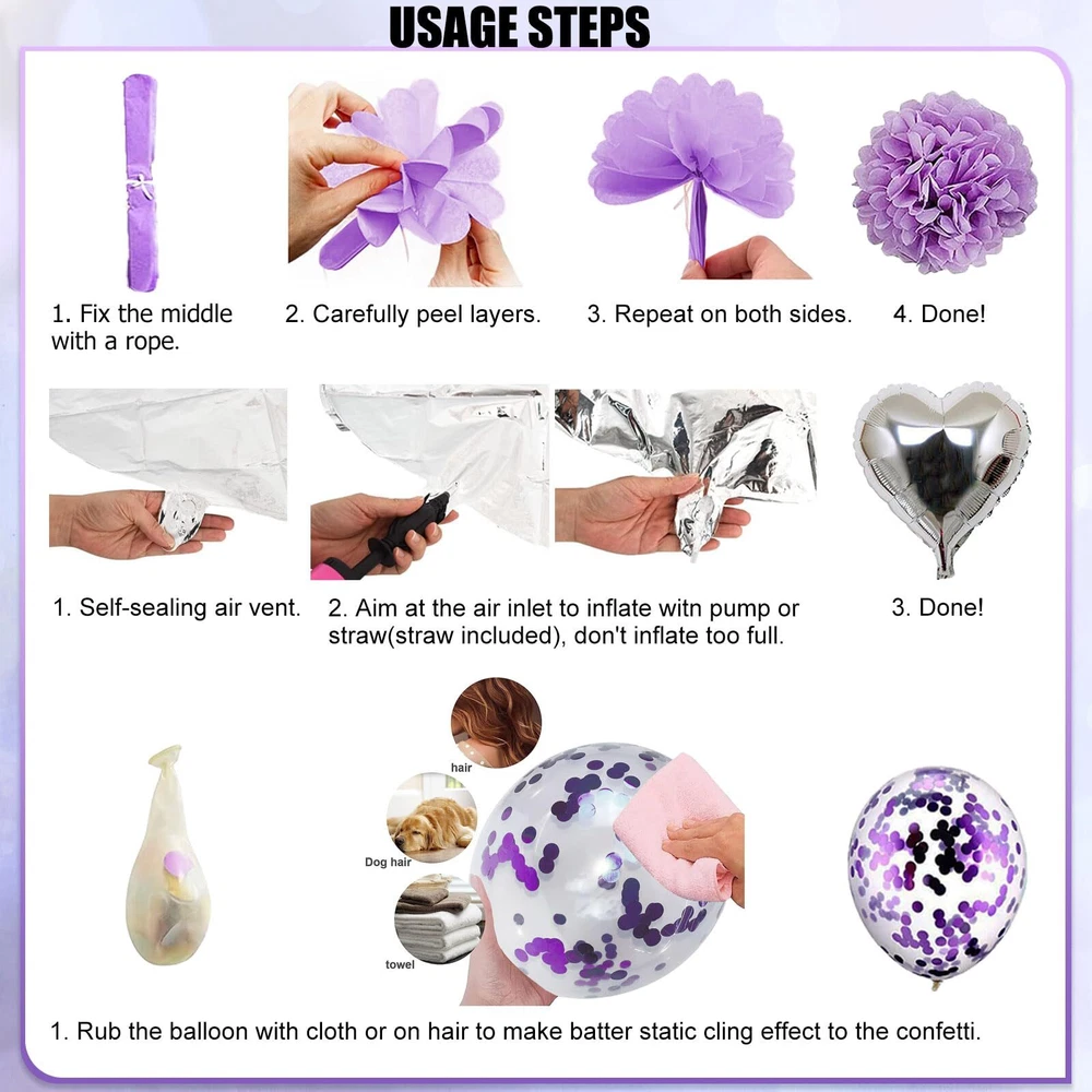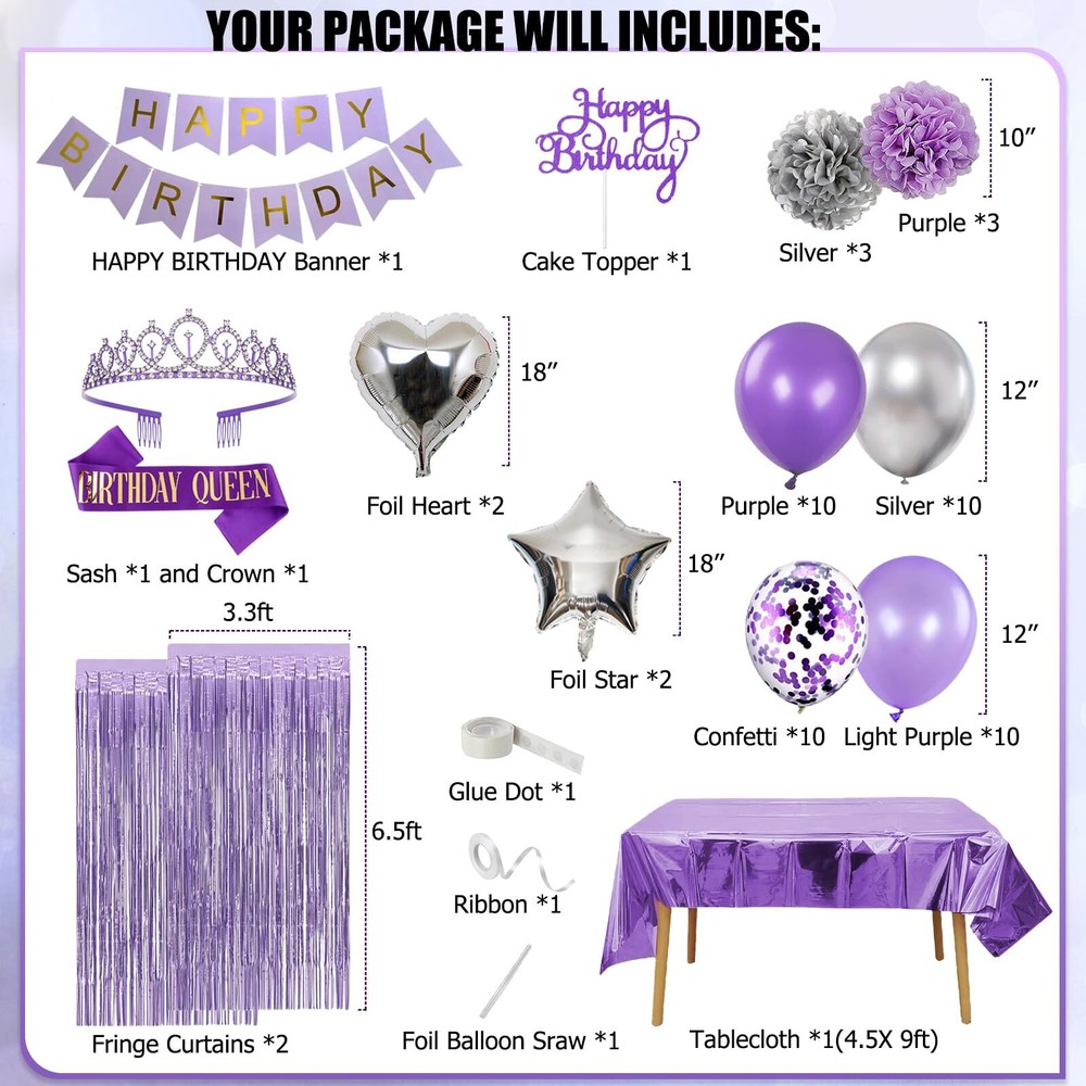 Rabbmall Purple and Silver Birthday Decorations for Women Girls Lavender Party Decor Set with Happy Birthday Banner and Balloons, Sash and Crown, Curtains, Cake Topper Table Cloth All-in-one lavender theme purple birthday party decoration saves a lot of your time and energy in hunting around various online shop. Add the beautiful purple and silver color will add more romantic and festive atmosphere for your birthday party. What in your party balloon packs: 1) HAPPY BIRTHDAY paper banner (1set) 2) light purple pompom flower – 3 pcs, 10 inch 3) silver pompom flower – 3 pcs, 10 inch 4) purple latex balloons – 10 pcs, 12 inch 5) light purple latex balloons – 10 pcs, 12 inch 6) purple cofetti latex balloons – 5 pcs, 12 inch 7) silver latex balloons – 10 pcs, 12 inch 8) star- shaped foil balloons – 2 pcs , 18 inch 8) heart- shaped foil balloons – 2 pcs , 18 inch 9) foil fringe curtains – 2 pcs 10) princess crown and birthday queen sash 11) cake topper – 1 pcs 12) plastic tablecloth – 1pcs, 4.5X 9ft 13) Accessories: 1 x straw, 1 x ribbon, 1 x glue dot Purple Birthday Decorations for Her : Lavender purple decor is suitable for women and girls of most ages: 21st, 30th, 40th, 50th, etc. It look romantic and mysterious after assemble, your families, friends will have a unforgettable memories! Great Value Box: 1 set purple HBD banner, 2pcs tinsel foil fringe curtains, 40pcs latex balloons in purple and silver, 4pcs foil balloons, 6pcs pom poms, 1 princess crown and birthday queen sash, 1pcs cake topper, 1pcs plastic tablecloth. Premium Quality Balloons: These birthday balloons are made of ECO-friendly Foil and rubbery, safe and non-toxic, strong and long lasting, support helium and air. Note: Please DO NOT overfill the balloons,suggest inflate to 85%-90%. Characteristic Birthday Party: The crown and sash specifically designed for the birthday queen, she will get a big hit! A lot of details like tablecloth, cake topper, Curtains and balloons will fill the room with luxurious-look purple. Customer Service: We support refund or resend for any missing or damaged parts in your package and offer LIFETIME WARRANTY! If you have any problem or you need help, please feel free contact us via order page, we will solve it for you. Shipping from the USA All of our products are shipped from the USA, ensuring quick delivery to your destination. Payment We offer the following payment methods: PayPal, credit card, bank transfer, and eBay's secure payment system. Free Shipping & Free Returns Shipping within the USA is FREE. Additionally, any return is absolutely free for you. Risk-Free Purchase You have the option to return an item within 30 days without any justification. We cover the return shipping costs! Fast Shipping We ship immediately upon receipt of payment. Generally, the package is delivered within 2-3 days in the USA. If it takes longer, we will contact you. Quality and Costs Made in Europe, USA, China No customs fees or additional charges Total satisfaction guarantee Invoice with declared VAT available upon request in .pdf format Feedback Your feedback is very important to us. After you pay for your purchase, you will automatically receive positive feedback from us.