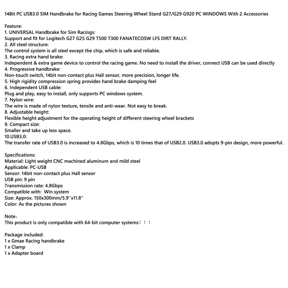 PrintHead for HP 932 933 XL OfficeJet 7110 7610 6600 6100 e 6700 7612 CB863 US 43.79 USD Free shipping Archery Magnetic Arrow Rest Recurve Bow Shoot Hunting Right Left Hand 8.35 USD 8.79 USD Free shipping 5% off NEW 65W Laptop Car Charger Power Supply DC Adapter Universal for HP 19.5V 3.33A 19.87 USD Free shipping 564 5 slot Print Head CB326-30001 CN642A for HP PhotoSmart Printers 19.79 USD Free shipping 3 Pair Archery Fur Arrow Rest Leather Traditional Recurve Bow Longbow Hunting U9 11.41 USD Free shipping Hand Key Oscillator Trainer Automatic Key Controller Adjust Transmission Speed 17.85 USD 18.79 USD Free shipping 5% off DC Brushless Cooling PC Computer Fan 12V 24V 8025s 80x80x25mm 0.15A 2 Pin US 10.79 USD Free shipping GY561 Frequency Counter Power Measure Tester Practical Meter 2Way Radio Handheld 40.79 USD Free shipping Folding Back Up Iron Sight Flip Up Front Rear Set Picatinny Rail KAC300 20.87 USD Free shipping 15683 Hiller Furrower Kit For Land Cultivation Rear Tine Tillers Adjustable Wing 49.99 USD Free shipping M.2 B / B+M KEY NGFF 2.5" mSATA SSD to SATA III Board Converter Adapter Card 14.48 USD Free shipping BC-143 Charger BP-196 Battery Fast Rapid Dock for ICOM IC-T22 F3S A4 T2A US Plug 25.79 USD Free shipping A Fantastic Shop Send us a message Our Store Seller Profile Feedbacks Save this seller Contact Racing Games Handbrake USB3.0 Kits for Steering Wheel Stand G29 G920 PC Red UE 14Bit PC USB3.0 SIM Handbrake for Racing Games Steering Wheel Stand G27/G29 G920 PC WINDOWS With 2 Accessories Feature: 1. UNIVERSAL Handbrake for Sim Racings: Support and fit for Logitech G27 G25 G29 T500 T300 FANATECOSW LFS DIRT RALLY. 2. All steel structure: The control system is all steel except the chip, which is safe and reliable. 3. Racing extra hand brake: Independent & extra game device to control the racing game. No need to install the driver, connect USB can be used directly 4. Progressive handbrake: Non-touch switch, 14bit non-contact plus Hall sensor, more precision, longer life. 5. High rigidity compression spring provides hand brake damping feel 6. Independent USB cable: Plug and play, easy to install, only supports PC windows system. 7. Nylon wire: The wire is made of nylon texture, tensile and anti-wear. Not easy to break. 8. Adjustable height: Flexible height adjustment for the operating height of different steering wheel brackets 9. Compact size: Smaller and take up less space. 10.USB3.0: The transfer rate of USB3.0 is increased to 4.8Gbps, which is 10 times that of USB2.0. USB3.0 adopts 9-pin design, more powerful. Specifications: Material: Light weight CNC machined aluminum and mild steel Applicable: PC-USB Sensor: 14bit non-contact plus Hall sensor USB pin: 9 pin Transmission rate: 4.8Gbps Compatible with: Win system Size: Approx. 150x300mm/5.9''x11.8" Color: As the pictures shown Note: This product is only compatible with 64-bit computer systems!!! Package included: 1 x Gmae Racing handbrake 1 x Clamp 1 x Adapter board About US About Our Items We strive to describe all items accurately and thoroughly, with the utmost care and attention to detail. However, to ensure a mutually satisfactory transaction, we kindly ask for your assistance in thoroughly reviewing the item description and photos, and addressing any questions before placing a bid. Customer Satisfaction We stand behind our commitment with exceptional service, a 100% money-back guarantee, and a dedication to customer satisfaction. I am readily available to address any inquiries or concerns you may have, both before and after your purchase. Our aim is to ensure your shopping experience is enjoyable and that you're delighted with your purchase. Feedback Your feedback is crucial to our business's success. If you're satisfied with your purchase and the service you received, we would greatly appreciate your positive feedback, along with an overall Detailed Selling Rating (DSR) of 5. Please take a moment to leave us positive feedback. Our eBay account is set up to automatically reciprocate positive feedback once yours is received. If you're considering leaving neutral/negative feedback or opening an eBay/PayPal case, we encourage you to reach out to us immediately. We're committed to resolving any issues to the best of our ability. Shipping Parcel will be shipped using Standard shipping method. For security purposes, items will be shipped exclusively to the confirmed address on Paypal. Please ensure your Shipping address is up to date before proceeding with payment. Estimated delivery time within the United States ranges from 3 to 10 business days, depending on your location. Returns We accept returns within 60 days from the date the buyer receives the item. If the item is found to be defective upon receipt, the customer has up to 30 days from the date of receipt to request an exchange for a new item or a refund. For returns due to a change of mind, we accept items in their original selling condition. However, if the package has been opened due to a mistaken order, it does not qualify for our return policy. Please note that the buyer is responsible for covering the cost of return postage. If you encounter any issues, please reach out to us via eBay message, and we'll respond within 24 hours. NEW Complete Pedal Spring Upgrade Fit LOGITECH G25 G27 G29 G920 Racing Wheel 27.87 USD Free shipping 70MM Steering Wheel Adapter Plate For Logitech G29 G920 13/14inch Steering Wheel 16.99 USD Free shipping Zero Delay Arcade USB Encoder to Joystick Fit for PC Fighting Games AC424 SA 14.79 USD Free shipping USB Handbrake with L Clip and 7+R H Shifter Fits Logitech G25 Steering Wheel U 168.99 USD Free shipping USB 7+R SP Simulate H Gear Shifter For Logitech Thrustmaster Gearshift Knob 63.79 USD Free shipping USB Handbrake with L Clip and 7+R H Shifter for Logitech G25 G27 Racing Game E 163.79 USD Free shipping 14Bit PS4/PS5 USB3.0 Handbrake Kit for Racing Games Steering Wheel Stand G29 34.68 USD Free shipping 14Bit PS4/PS5 Handbrake for