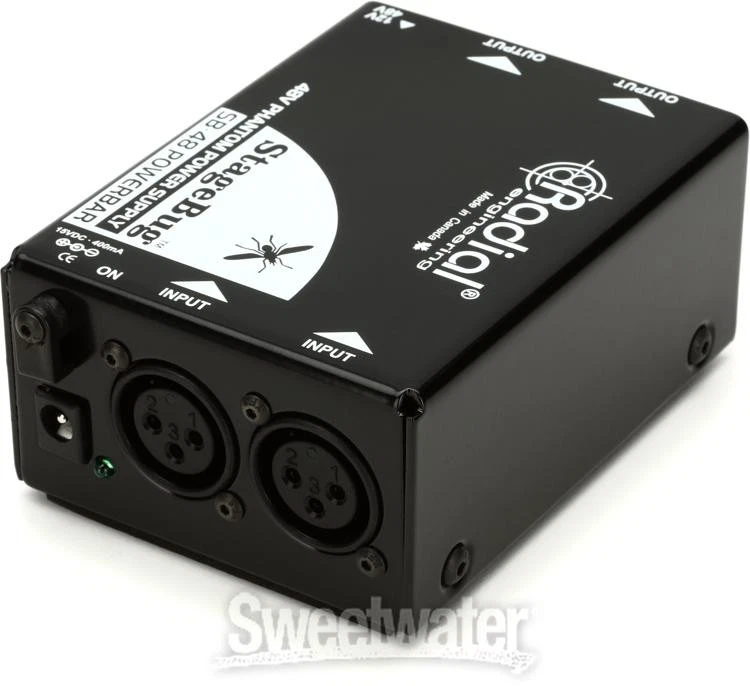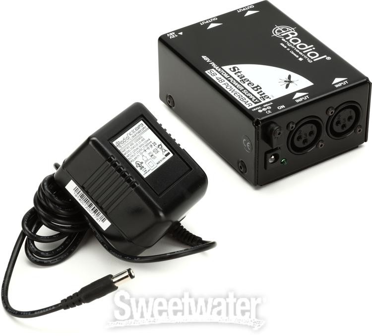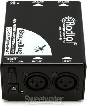 2 Channels of +12/48V Phantom Power to Go Power up to two microphones or active direct boxes with the Radial Engineering StageBug SB-48 Powerbar. This rugged and self-contained phantom power supply is dead-simple in its operation. Inline XLR ins and outs make it fast and intuitive to interface with soundboards and recording interfaces. Unique to the SB-48 Powerbar is its switchable 12/48V+ power, which covers modern condensers and powered dynamics to fussier vintage mics. The SB-48 is amply powered by an included 15-volt, DC 400mA wall supply. Whether you perform onstage or record on location, equip yourself with the Radial Engineering StageBug SB-48 Powerbar from Sweetwater.Radial Engineering StageBug SB-48 Powerbar Features: Portable phantom power supply Powers up to two microphones or active direct boxes Inline XLR ins and outs Switchable 12V/48V operation Ruggedly constructed Proudly made in Canada Operates on a 15-volt, DC 400mA power supply (included) Sweetwater is an Authorized Radial Dealer Genuine New Item Sweetwater's 2-year warranty Radial StageBug SB-48 Phantom Power Supply 2-channel Phantom Power Supply with +12/48V Switch 2 Channels of +12/48V Phantom Power to Go Power up to two microphones or active direct boxes with the Radial Engineering StageBug SB-48 Powerbar. This rugged and self-contained phantom power supply is dead-simple in its operation. Inline XLR ins and outs make it fast and intuitive to interface with soundboards and recording interfaces. Unique to the SB-48 Powerbar is its switchable 12/48V+ power, which covers modern condensers and powered dynamics to fussier vintage mics. The SB-48 is amply powered by an included 15-volt, DC 400mA wall supply. Whether you perform onstage or record on location, equip yourself with the Radial Engineering StageBug SB-48 Powerbar from Sweetwater. Radial Engineering StageBug SB-48 Powerbar Features: Portable phantom power supply Powers up to two microphones or active direct boxes Inline XLR ins and outs Switchable 12V/48V operation Ruggedly constructed Proudly made in Canada Operates on a 15-volt, DC 400mA power supply (included) Specification Detail Number of Channels 2 Inputs 2 x XLR Outputs 2 x XLR Power Source 15V DC power supply (included) RETURN INFORMATION We want you to be completely happy with your purchase from Sweetwater. If you are not satisfied with your product, you may return it for a refund of the purchase price within 30 days. If your purchase was eligible for Free Shipping, the shipping cost will be deducted from your credit or refund. Returns must be in the complete and original packaging with all accessories and complete documentation (Owner's Manual, warranty card, quick start guides, etc.), show no signs of wear or use, and include a Return Authorization number or be subject to a restocking fee.