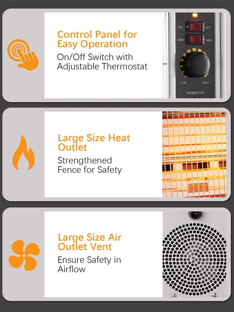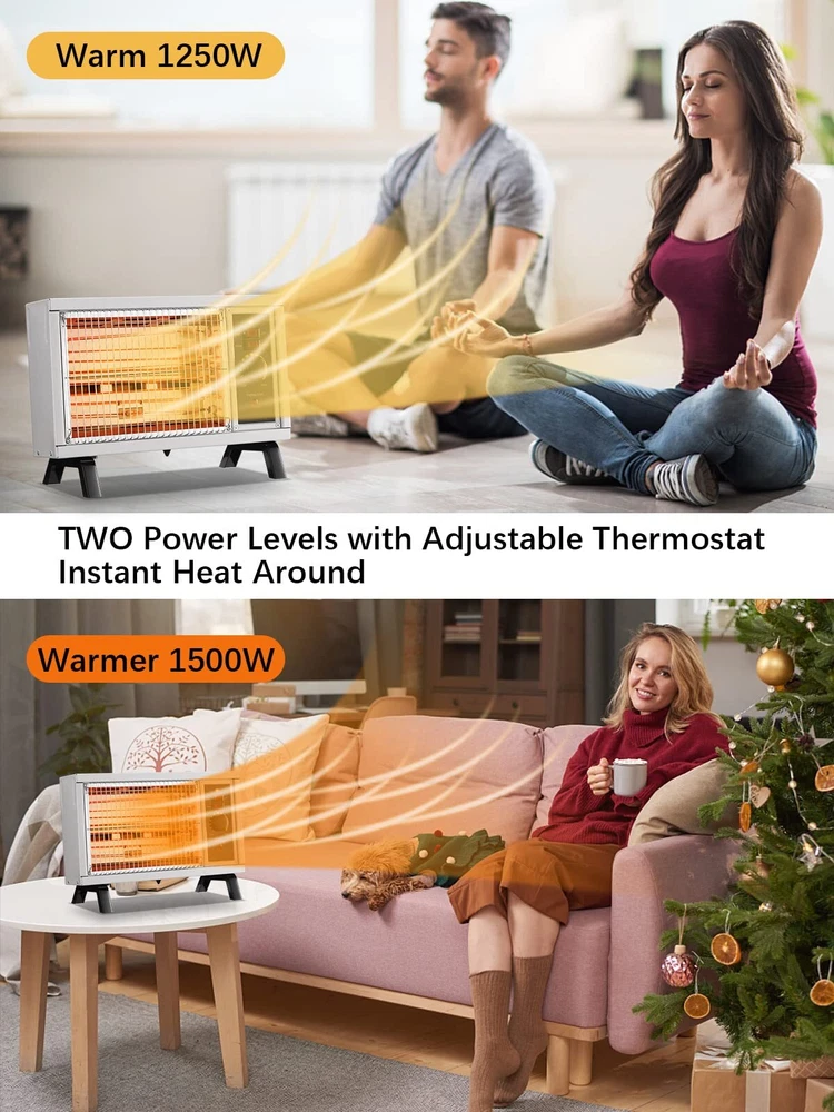 Need a radiant heater for your pet? Can’t find a suitable heater for home in cold weather? Feel chilly when chatting with your friends in living room in winter? HAVE A TRY! ↓ ↓ ↓ ↓ Indoor Space Heater The portable radiant heater contains heating wires and high-rated heating system that provides heat evenly and rapidly. Reflective heating technology replicates the sun’s rays, producing no odors, chemicals or fumes and warming the object or person in front of the heater rather than the front air. Specifications: 1250/1500W Two Heating Settings Built-in Thermostat from Low to High Tip-over Protection for Safety Built-in Over Heating Protection Portable Handle for Easy Carry Lightweight - 5.4lbs Oversized Air Vent Stable Bases - Easy disassembled for storage Still not convinced? Here are more reasons you should get this heater: ETL approved for the U.S. Instant warmth - enjoy the heat as soon as you turn on the heater Stylish design that complements your interiors - black and white choices Electric heater - safer and more environmentally friendly for your living condition Warm your home the energy efficient way. Add Space Heater to your cart TODAY! ❤【FAST CONTINOUS WARMTH】Once you turn on the heater, you’ll be surrounded by instant warmth - less than 3 SECONDS. The radiant heater uses electricity and does not output carbon dioxide, saving 30%-40% on electricity compared to a traditional heater. ❤【FAST CONTINOUS WARMTH】Once you turn on the heater, you’ll be surrounded by instant warmth - less than 3 SECONDS. The radiant heater uses electricity and does not output carbon dioxide, saving 30%-40% on electricity compared to a traditional heater. ❤【EASY OPERATION】With on/off switch and two heating settings, you can choose the desired temp for heat; oversized air vent for convection, perfect for personal heating at home, garage, dorm, bathroom, bedroom, etc. The heater radiates heat with no odors, chemicals or fumes and warming the object or person in front of the heater rather than the front air. ❤【EASY OPERATION】With on/off switch and two heating settings, you can choose the desired temp for heat; oversized air vent for convection, perfect for personal heating at home, garage, dorm, bathroom, bedroom, etc. The heater radiates heat with no odors, chemicals or fumes and warming the object or person in front of the heater rather than the front air. ❤【RELIABLE CUSTOMER SERVICE】Customer service responds within 24 hours business days; 30-day money pay back and 12-month manufacturer replacement. If you have any questions, please do not hesitate to contact us through Amazon buyer-seller message, we provide 100% service with our indoor space heater!