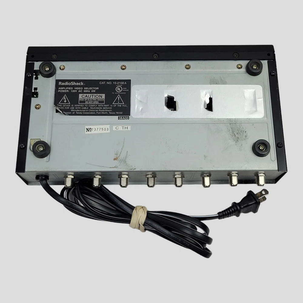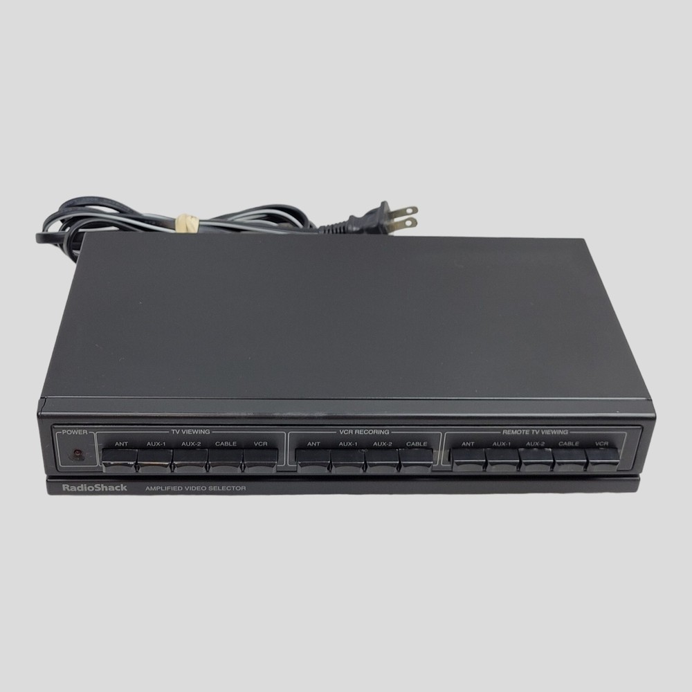 Radio Shack Amplified Video Selector Switch Catalog No. 15-2100A Radio Shack Amplified Video Selector Switch Catalog No. 15-2100A Enhance your home entertainment setup with the Radio Shack Amplified Video Selector Switch, Catalog No. 15-2100A. This versatile device allows you to connect multiple audio and video components to a single TV, providing seamless switching between your devices. Ideal for those with multiple AV sources, this switch offers an amplified signal for superior video and audio quality. Key Features: Amplified Signal: Boosts the signal strength to ensure clear and crisp audio and video output, even when multiple devices are connected. Multiple Inputs: Features 4 AV inputs, allowing you to connect up to 4 devices such as DVD players, gaming consoles, VCRs, and more. Easy Switching: Simple push-button controls let you switch between connected devices effortlessly. High-Quality Construction: Durable build ensures long-lasting performance and reliability. Compact Design: Space-saving design fits neatly into your entertainment center, keeping your setup organized. Condition: Excellent Condition: This video selector switch is pre-owned but in excellent working condition. It has been tested to ensure all functions operate properly. Cosmetic Condition: Minimal signs of use, such as small scratches or scuffs, which do not affect performance. Included in the Package: 1 x Radio Shack Amplified Video Selector Switch Catalog No. 15-2100A Note: Original packaging and user manual are not included. Why Choose This Video Selector Switch: Enhanced Entertainment Setup: Perfect for expanding your home entertainment system, allowing for multiple device connections to a single TV. Superior Signal Quality: Amplified signal ensures the best possible audio and video quality from all your connected devices. User-Friendly: Easy to set up and use, with straightforward push-button controls for quick device switching. Trusted Brand: Radio Shack is a reputable name in electronics, known for quality and dependability. Shipping & Handling: Fast Shipping: Orders are processed and shipped within 1 business day. Secure Packaging: Your video selector switch will be securely packaged to ensure it arrives in perfect condition. Tracking Included: All shipments include tracking information for your peace of mind. Customer Satisfaction: We strive for 100% customer satisfaction. If you have any questions or concerns about your purchase, please contact us. We are committed to resolving any issues promptly and efficiently. Streamline your home entertainment system with the Radio Shack Amplified Video Selector Switch. Buy with confidence and enjoy enhanced connectivity and signal quality today!