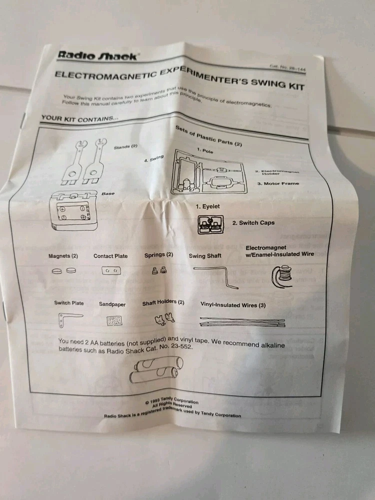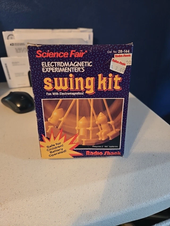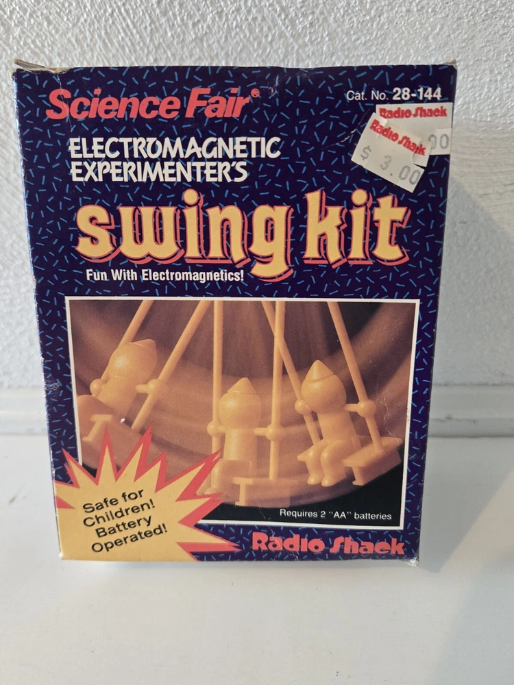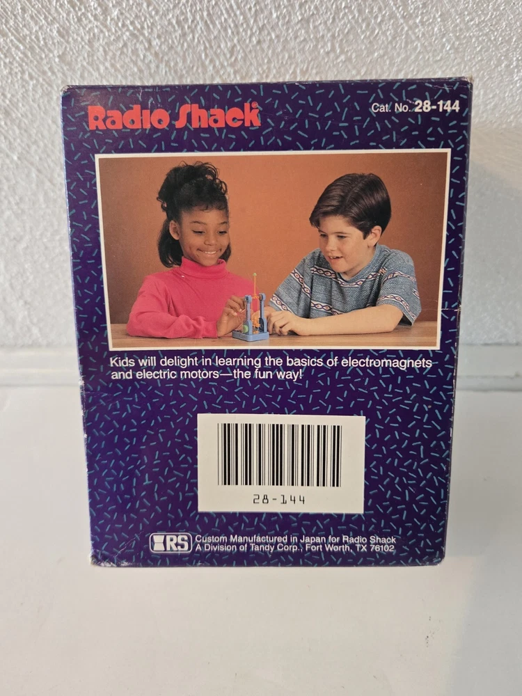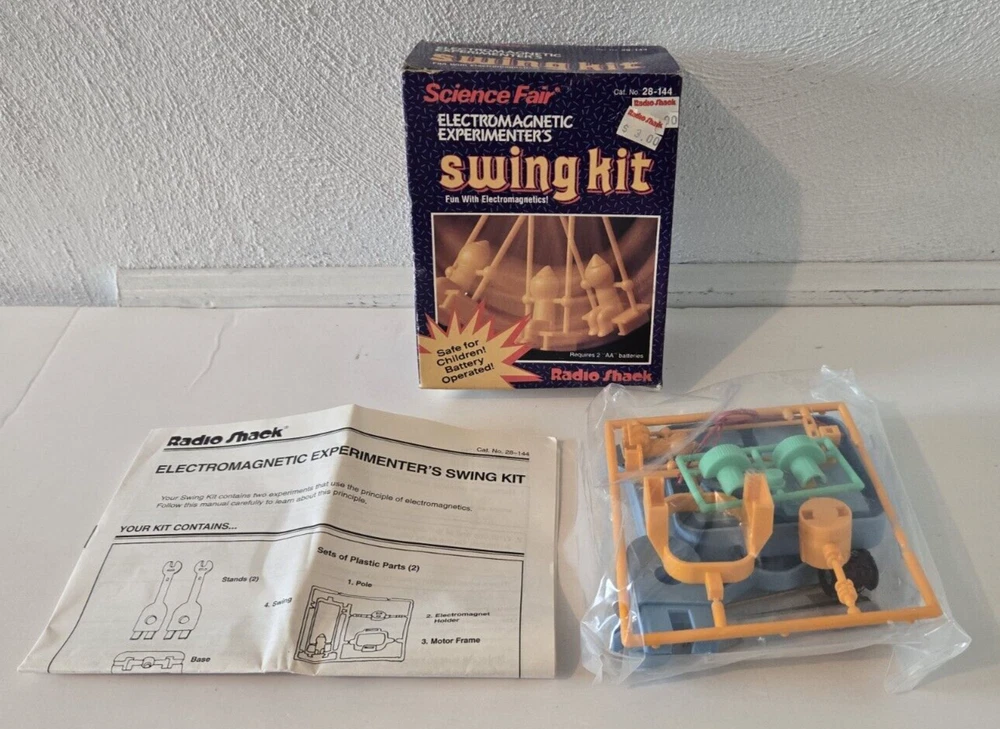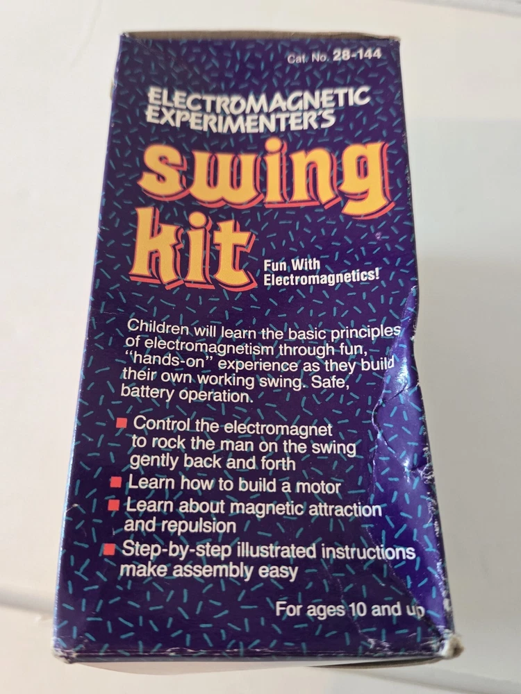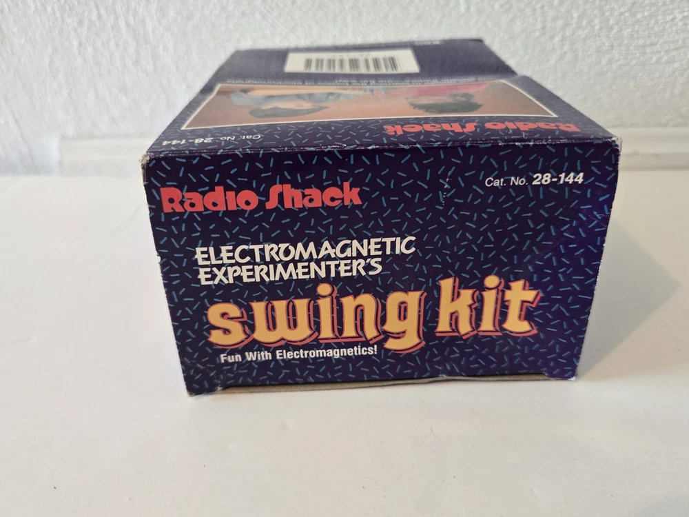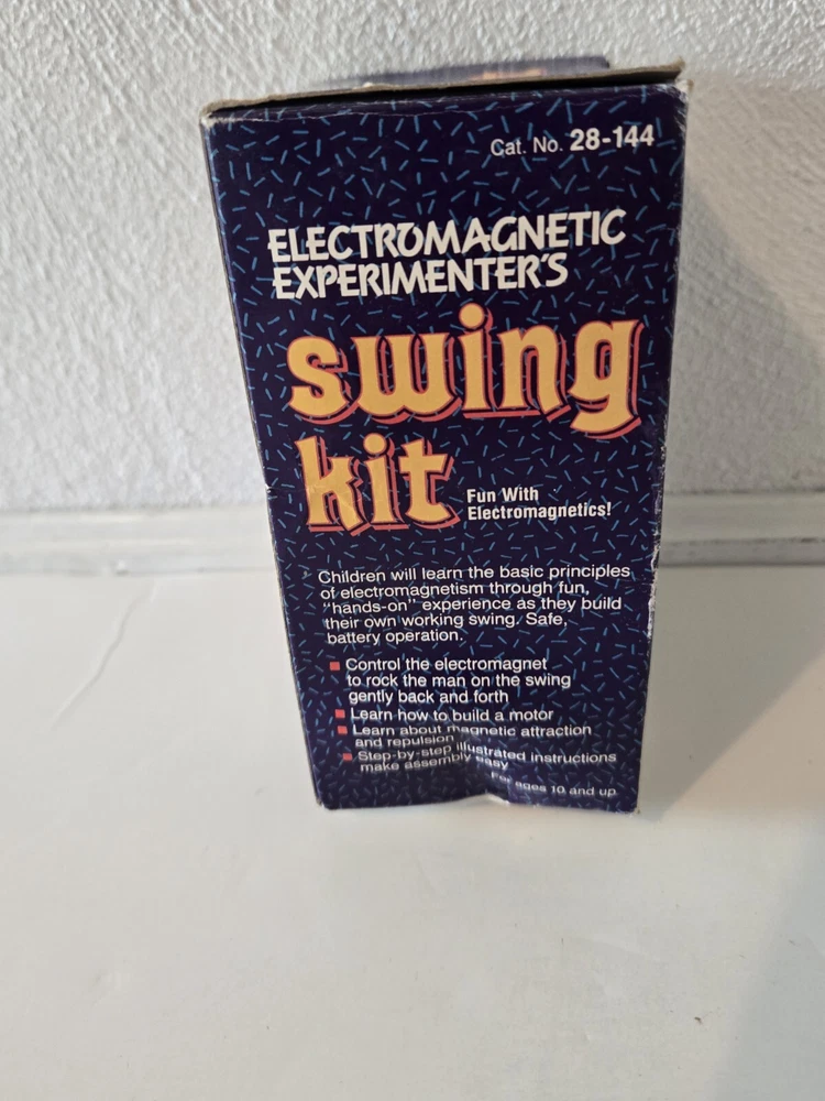 Radio Shack Electromagnetic Swing Kit Science Fair Project Kit. Model #28.-144. New in original box. Vintage from the 1993. This vintage Science Fair kit from Radio Shack is a must-have for any electronics enthusiast. The kit includes everything needed to build an electromagnetic swinging bridge, complete with a functioning piston and bell clipper. With a recommended age range of 10 and up, this kit is perfect for both kids and adults who want to explore the principles of electromagnetism. The kit was manufactured in Japan in the 1990s and has been well-maintained, making it a great addition to any collection. Whether you're a seasoned collector or just starting out, this kit is sure to provide hours of fun and educational play. Get your hands on this New Old Stock kit today! *NOTE* The box may have some imperfections from bulk storage.