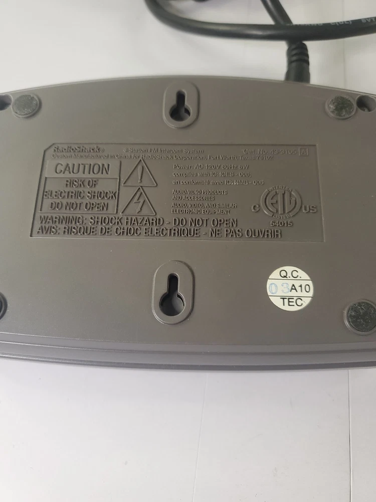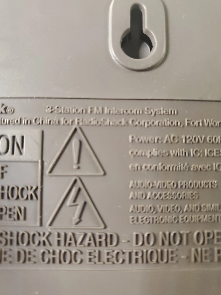 MPN:43-3105Smart Home Compatibility:NoUPC:Does not applyLocation:Indoor OnlyBattery Included:NoCountry/Region of Manufacture:ChinaMaximum Resolution:NaType:Voice IntercomBrand:RadioShackPower:6 WSmart Home Protocol:FMSurveillance Technology:NaConnectivity:WirelessFeatures:FM WirelessModel:43-3105gtin13:Does not apply