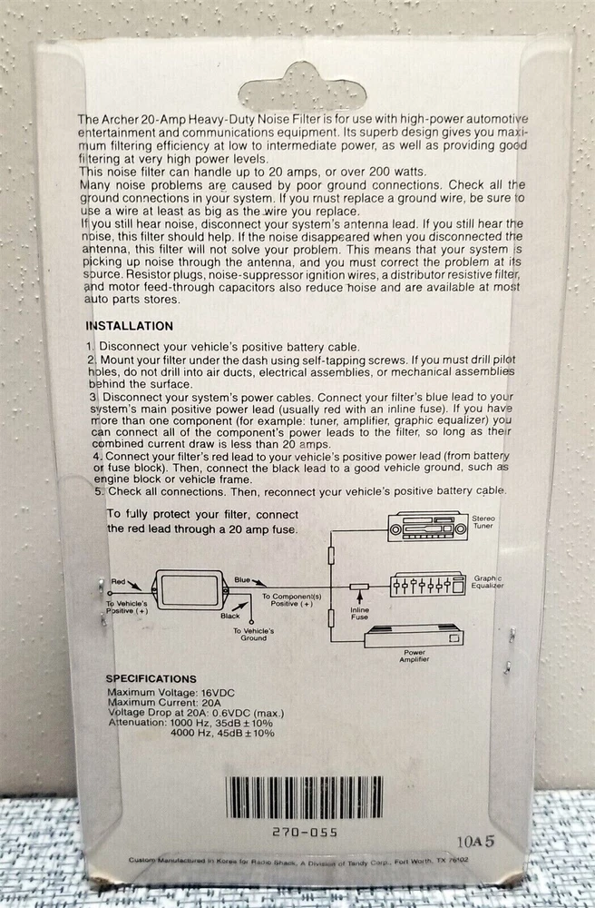 This listing is for a New old Stock Radio Shack Heavy Duty 20 AMP Automotive Electrical Noise Filter Catalog Number 270-055. Payment: Payment is expected within three days of auction close. If this causes a problem please contact me. Shipping: I do combine shipping costs on most auctions. Please ask if auctions are eligible before bidding on them. The costs are full price for the first item (highest shipping cost first) then 50% off each additional item. 98% of my items will be shipped within 24 hrs of cleared payment. Occasionally I will need 48 hrs to get your product out. (This is very rare). Most of my items are shipped USPS First Class or Priority mail. For very large or heavy items I may ship USPS Parcel Post or UPS to help keep the costs down for both if us. If you need your item more quickly and are willing to pay a premium for shipping this can always be arranged. Refunds : In general my items are being sold "as is" and I will not take returns just because you changed your mind or don't like the item. Please be sure that this is the item you want before bidding. My items may be new or used please read the item description. If an item arrives not as described or damaged please contact me and we will work something out. Feedback: My feedback score is important to me and I want you to be happy with your purchase. If for any reason you are not happy with your purchase please contact me prior to leaving feedback so we can work out a resolution. Powered by SixBit's eCommerce Solution