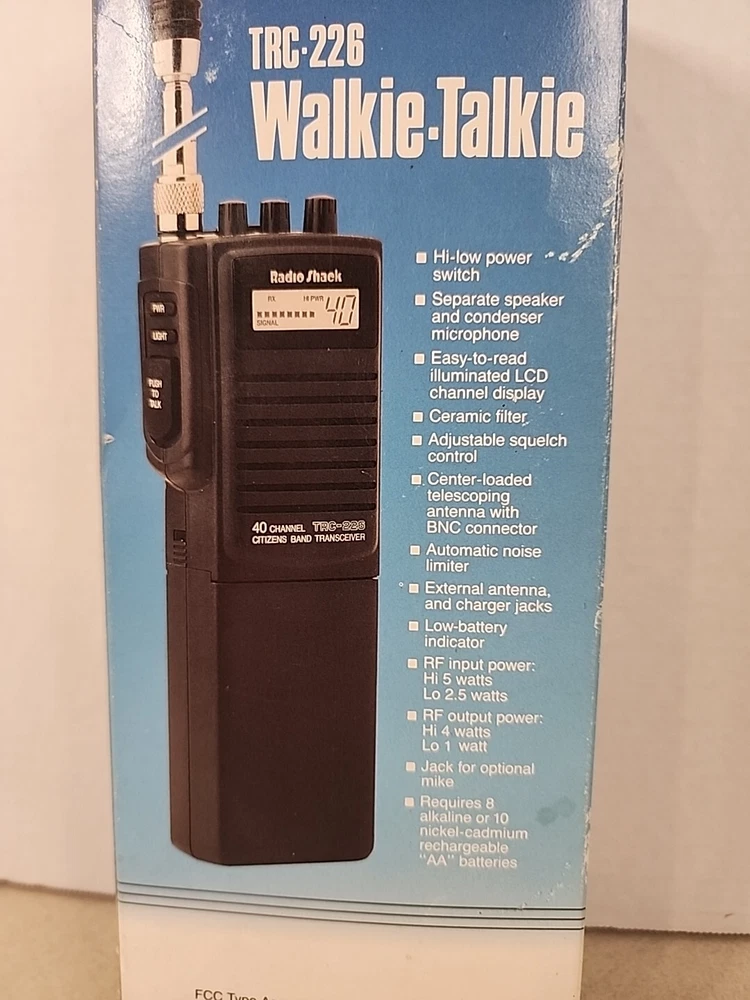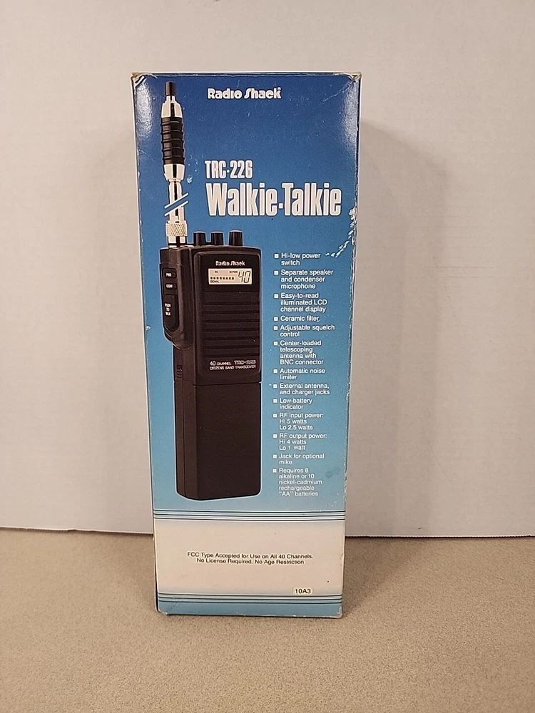 Excellent condition. Tested Get your hands on the Radio Shack Realistic 40 Channel TRC-226 Walkie Talkie Citizen Band Transceiver. This black device is perfect for those who are looking for a reliable two-way radio. With 40 channels and a CB band, this walkie talkie is perfect for communication in various settings. The Realistic brand ensures that you are getting a quality product that is built to last. The TRC-226 model is easy to use and is perfect for those who are looking for a simple and straightforward device. This walkie talkie is perfect for communication in outdoor activities, workplaces, and many other settings. Get your hands on this device today and experience the convenience of reliable communication.