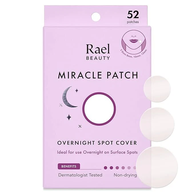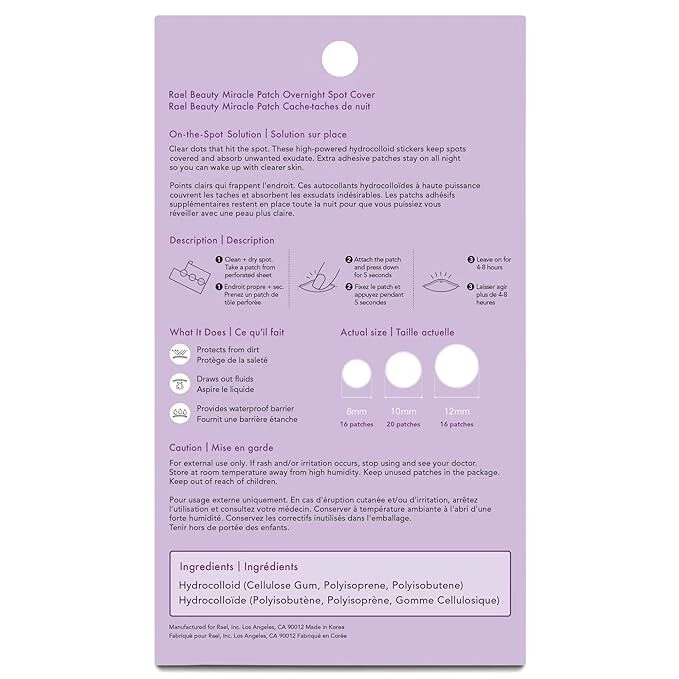 Rael Hydrocolloid Pimple Patches, Acne Patch Overnight Spot Cover (52 Count) Rael Hydrocolloid Pimple Patches, Acne Patch Overnight Spot Cover (52 Count) DESIGNED FOR SLEEP - High-powered hydrocolloid is extra adhesive and stays on all night. Comes in 3 sizes (8mm, 10mm, 12mm) EFFECTIVE CARE - Gently draws out pus and impurities while you sleep. Made with medical-grade, highly absorbent hydrocolloid. Non-drying and hypoallergenic. SURFACED HOT SPOTS - Ideal for attacking hot spots on your skin’s surface. PROTECTS SKIN - Provides a protective barrier against irritants. POWERFULLY GENTLE - Dermatologist tested and safe to use on all skin types without drying or irritating. 1. Cleanse and Dry 2. Apply & Lightly Press 3. Usage 4. Aftercare Cleanse the affected area and let skin dry. Apply the patch to the affected area. Press down for 3 seconds to secure. Leave on overnight, remove and discard patch after. Follow up with Microcrystal Dark Spot Cover for post-blemish dark spots and hyperpigmentation. Microcrystal Spot Cover Invisible Spot Cover Overnight Spot Cover Spot Control Cover XL Spot Control Cover Microcrystal Dark Spot Cover Benefit For early stage, underground blemishes before they come to a head For surfaced acne and whiteheads For surfaced acne overnight with extra-adhesive For acne hot spots and clusters, especially around chin, nose, and cheeks For large acne hot spots and clusters on the face and body For post-acne dark spots and hyperpigmentation Count/Net Weight 9 Count (14mm) 96 Count (10mm, 12mm) 52 Count (8mm, 10mm, 12mm) 10 Count (31mm x 46mm) 6 Count (45mm x 70mm) 6 count (21mm x 15mm) Key Ingredients Tea Tree Oil, White Willow Bark Extract, Succinic Acid, Hyaluronic Acid Hydrocolloid Dressing Hydrocolloid Dressing Hydrocolloid Dressing Hydrocolloid Dressing Niacinamide, Tranexamic Acid, Broccoli Extract Recommended Application Time Minimum 2 hours. Can be used overnight. Minimum of 4-8 hours. Can be used overnight. Overnight Minimum of 4-8 hours. Can be used overnight. Minimum of 4-8 hours. Can be used overnight. Minimum 6 hours. Can be used overnight. Vegan, Cruelty Free V V V V V V Artificial Color & Fragrance Free V V V V V V Safe For All Skin Types & All Ages V V V V V V Payment Shipping Return Payments managed by eBay -Your item will be shipped after payment has been cleared U.S Standard free shipping: USPS First Class Package -Only 1 business day will take to ship your item out after receiving cleared 30days free returns: Domestic returns accepted -We only accept unwashed/unopened items for return. -After receiving the item, a buyer should contact the seller within 30days. -Return shipping will be paid by the seller when the seller has responsibility for it. Listing and template services provided by inkFrog