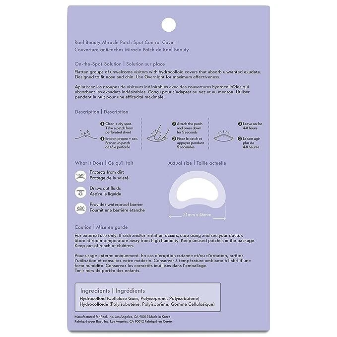 Rael Large Hydrocolloid Pimple Patches, Acne Patch Spot Control Cover (10 Count) Rael Large Hydrocolloid Pimple Patches, Acne Patch Spot Control Cover (10 Count) EXTRA COVERAGE - Larger, contoured patch fits acne hot spots like nose, chin, and cheek. Patch size (31mm x 46mm) EFFECTIVE CARE - Gently draws out pus and impurities straight from the source. Made with medical-grade, highly absorbent hydrocolloid. Non-drying and hypoallergenic. PROTECTS SKIN - Provides a protective barrier against irritants. STAYS ON SKIN ALL DAY, NIGHT - Tapered edges keep patches adhered to skin, while effectively covering spots. VEGAN AND CRUELTY-FREE - No animal-derived ingredients. No animal testing. 1. Cleanse & Dry 2. Apply & Lightly Press 3. Remove 4. Aftercare Cleanse the affected area and let skin dry. Rael Spot Control Covers work best on whiteheads and surfaced acne. Apply the patch to the affected area. Press down for 3 seconds to secure. Wear for minimum 4-8 hours or until the patch turns white. Remove and discard the patc Follow up with the Microcrystal Dark Spot Cover for post-blemish dark spots and hyperpigmentation. Microcrystal Spot Cover For early stage, underground blemishes before they come to a head 9 Count (14mm) Tea Tree Oil, White Willow Bark Extract, Succinic Acid, Hyaluronic Acid Minimum 2 hours. Can be used overnight. Invisible Spot Cover For surfaced acne and whiteheads 96 Count (10mm, 12mm) Hydrocolloid Dressing Minimum of 4-8 hours. Can be used overnight. Overnight Spot Cover For surfaced acne overnight with extra-adhesive 52 Count (8mm, 10mm, 12mm) Hydrocolloid Dressing Overnight Overnight Spot Cover For acne hot spots and clusters, especially around chin, nose, and cheeks 10 Count (31mm x 46mm) Hydrocolloid Dressing Minimum of 4-8 hours. Can be used overnight. XL Spot Control Cover For large acne hot spots and clusters on the face and body 6 Count (45mm x 70mm) Hydrocolloid Dressing Minimum of 4-8 hours. Can be used overnight. Microcrystal Dark Spot Cover For post-acne dark spots and hyperpigmentation 6 count (21mm x 15mm) Niacinamide, Tranexamic Acid, Broccoli Extract. Minimum 6 hours. Can be used overnight. Payment Shipping Return Payments managed by eBay -Your item will be shipped after payment has been cleared U.S Standard free shipping: USPS First Class Package -Only 1 business day will take to ship your item out after receiving cleared 30days free returns: Domestic returns accepted -We only accept unwashed/unopened items for return. -After receiving the item, a buyer should contact the seller within 30days. -Return shipping will be paid by the seller when the seller has responsibility for it. Listing and template services provided by inkFrog