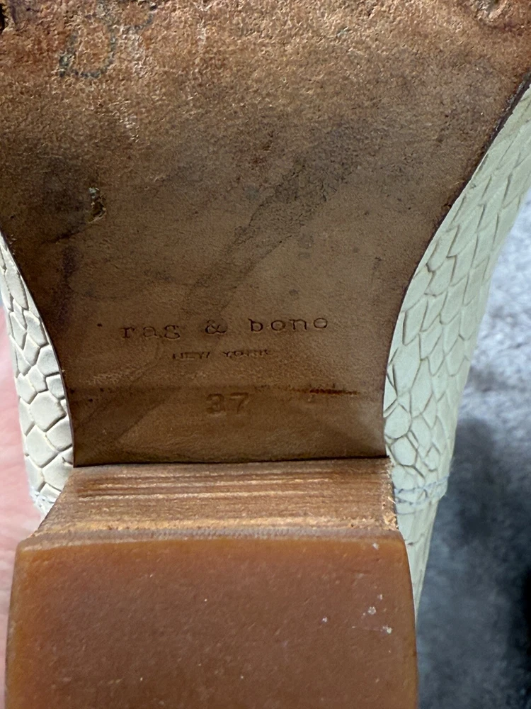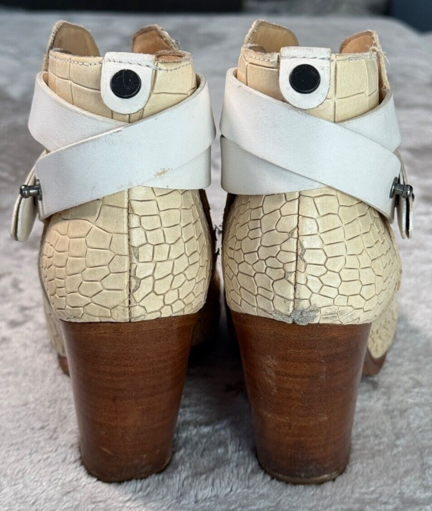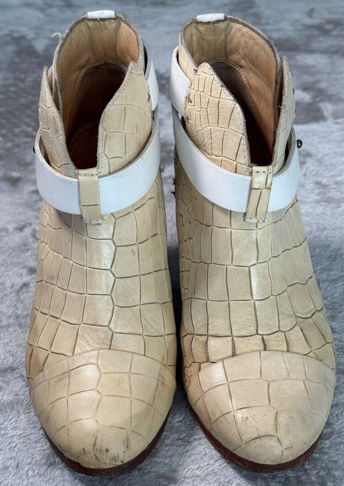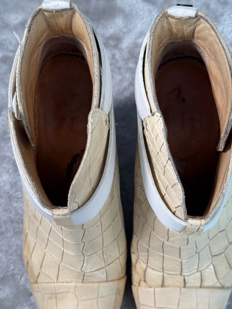 Rag & Bone Harrow Ivory White Croc Embossed Leather Cap Toe Boots Womens 7 EU 37 Good condition - see pictures for wear. Water stains across sides of both shoes as shown. All orders ship within one business day. Feel free to ask any questions before buying, we want you to be happy with your purchase. Smoke-free environment