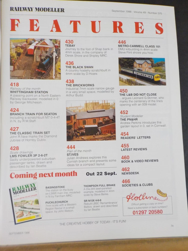 RailroadTreasures offers the following item: Railway Modeller 1998 September V49 #575 British RY enthusiast LMS Fowler 3P 2-6 Railway Modeller 1998 September V49 #575 CONTENTS 418 Railway of the month WHITTINGHAM STATION A passing point on a North Eastern Railway backwater, modelled in 0 by George Mitcheson. 424 BRANCH TRAIN FOR SEATON Including a scratchbuilt M7 0-4-4T in N, by R.M.Staff. 427 THE CLASSIC TRAIN SET John R.New marks the Diamond Jubilee of Hornby Dublo. 428 Scale drawings LMS FOWLER 3P 2-6-2T Sadly underpowered suburban passenger tanks, drawn and described by Ian Beattie. 430 TEBAY Journey to the foot of Shap bank in 4mm scale, in the company of Derek Shore and Shipley MRC. 436 THE BLACK SWAN A country hostelry scratchbuilt in 4mm scale by D.Hoare. 438 THE BRICKWORKS Industrial 7mm scale narrow gauge in a very small space, modelled by Arthur Budd. 444 Plan of the month ST.IVES Julian Andrews explores this Cornish branch and presents some ideas for a compact layout. 446 METRO-CAMMELL CLASS 101 DMU kitbuilding in 4mm scale: Steve Flint shows you how. 450 THE L&B DID NOT CLOSE ...argues Leonard G.Skinner, who marks the centenary of the line's opening with an 009 model. 452 Student Modeller THE PN&HR Andrew Perkins introduces this garden layout in 0, set in Cornwall. 454 READERS' LETTERS 455 LATEST REVIEWS 460 BOOK & VIDEO REVIEWS 462 NEWSDESK 466 SOCIETIES & CLUBS All pictures are of the actual item. There may be reflection from the lights in some photos. We try to take photos of any damage. If this is a railroad item, this material is obsolete and no longer in use by the railroad. Please email with questions. Publishers of Train Shed Cyclopedias and Stephans Railroad Directories. Large inventory of railroad books and magazines. Thank you for buying from us. Shipping charges US Shipments: When you add multiple items to your cart, the reduced shipping charges will automatically be calculated. For direct postage rates to other countries, send me an email. Shipping varies by weight. Terms and conditions All sales are final. Returns accepted if item is not as described. Contact us before making a return. No warranty is stated or implied. Please e-mail us with any questions before bidding or buying. Thanks for looking at our items.