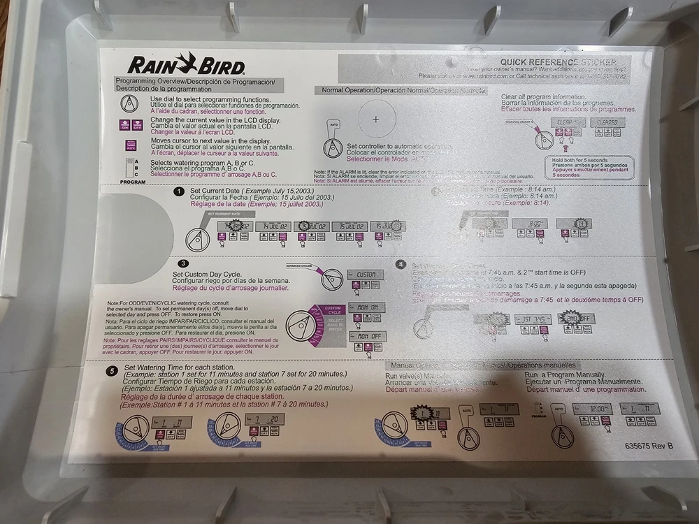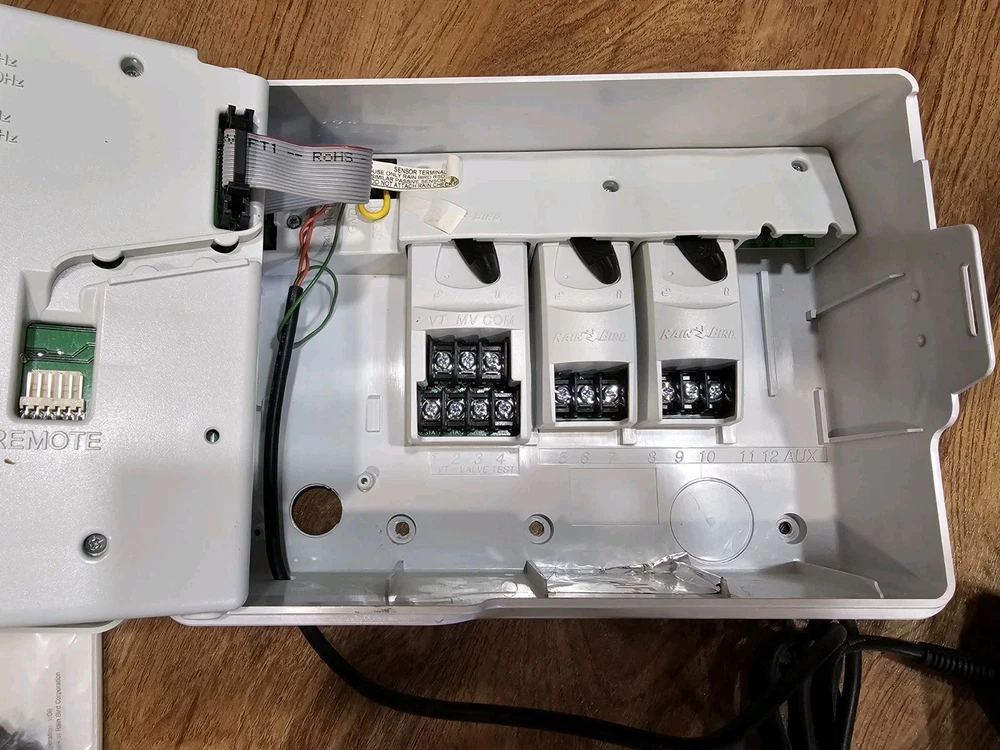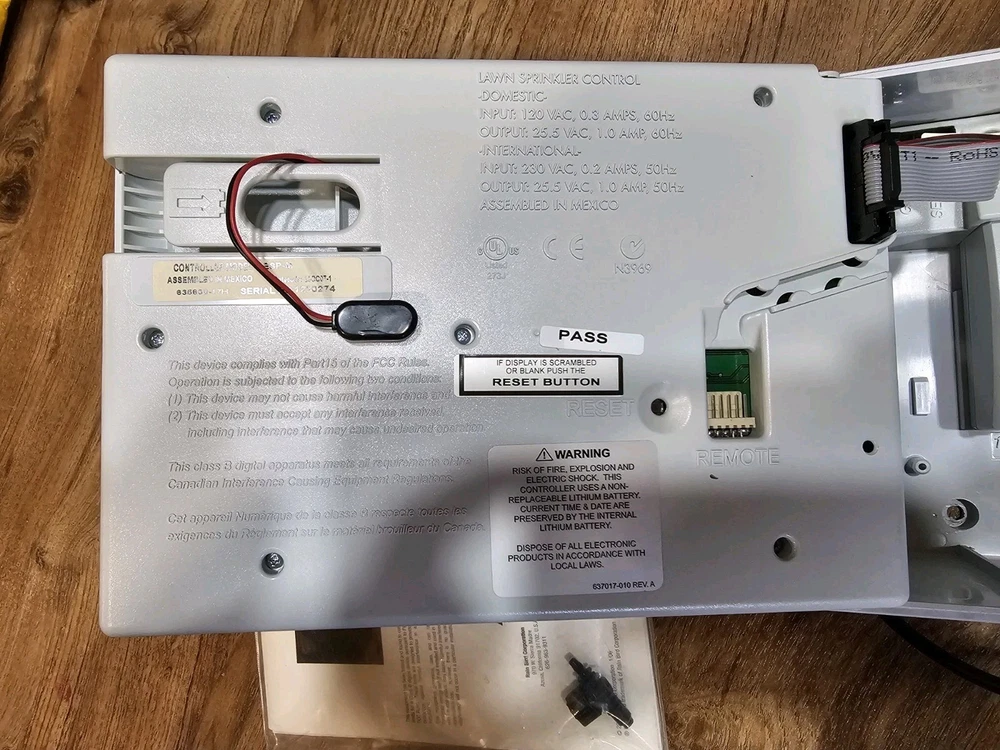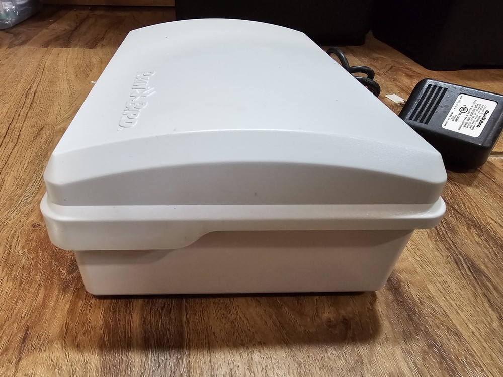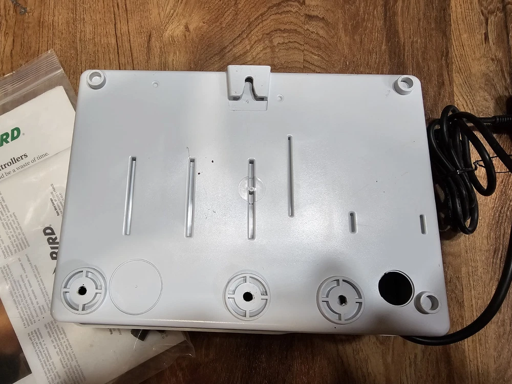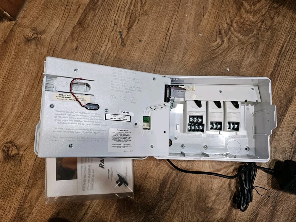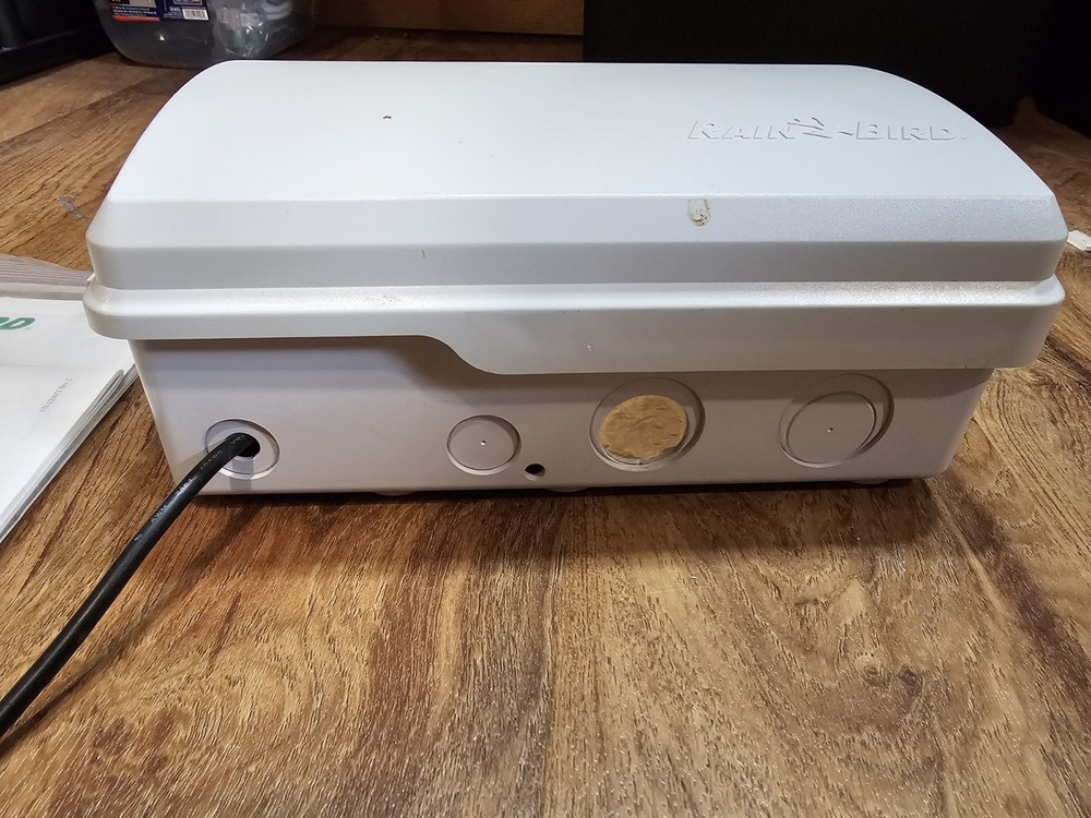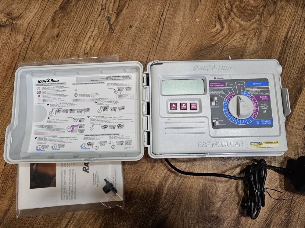 Rain Bird ESP-M irrigation controller. Has modules for 10 zones. Will accept an additional module (not included) for up to 13 zones. Date code indicates manufactured in 2007. Works fine. The controller came with my house and I wanted a WiFi controller instead. (This unit does NOT have WiFi or Bluetooth). It has manual and programmed settings. Has original manual and power adapter. Case is missing one knockout plug where the station wires were routed into the box.