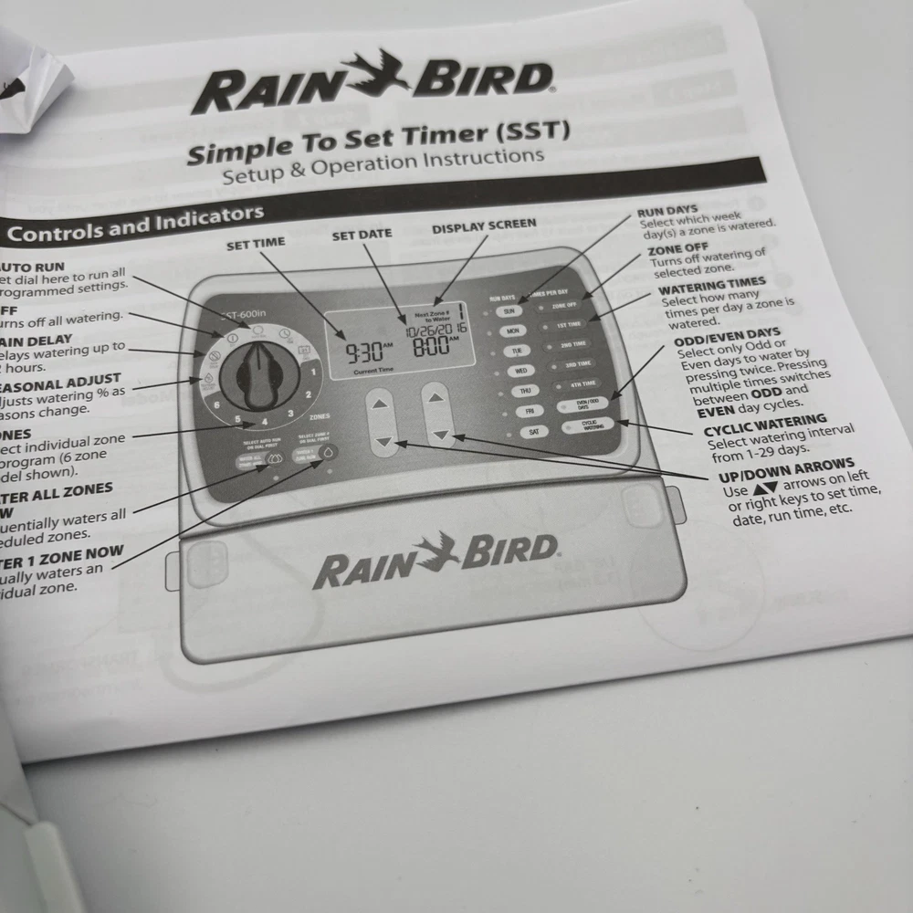 Number of Items in Set:1Set Includes:Sprinkler ControllerMPN:SST-900IType:Sprinkler ControllerItem Weight:46.4 ozgtin13:0077985004668Indoor/Outdoor:IndoorControl Style:AutomaticMaterial:PlasticGTIN:0077985004668Color:SilverUPC:0077985004668Brand:Rain BirdModel:SST-900i