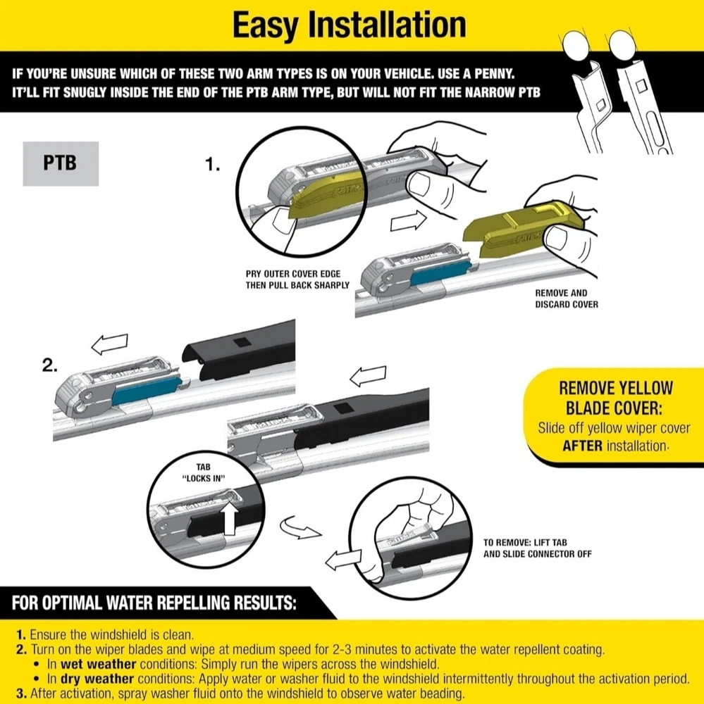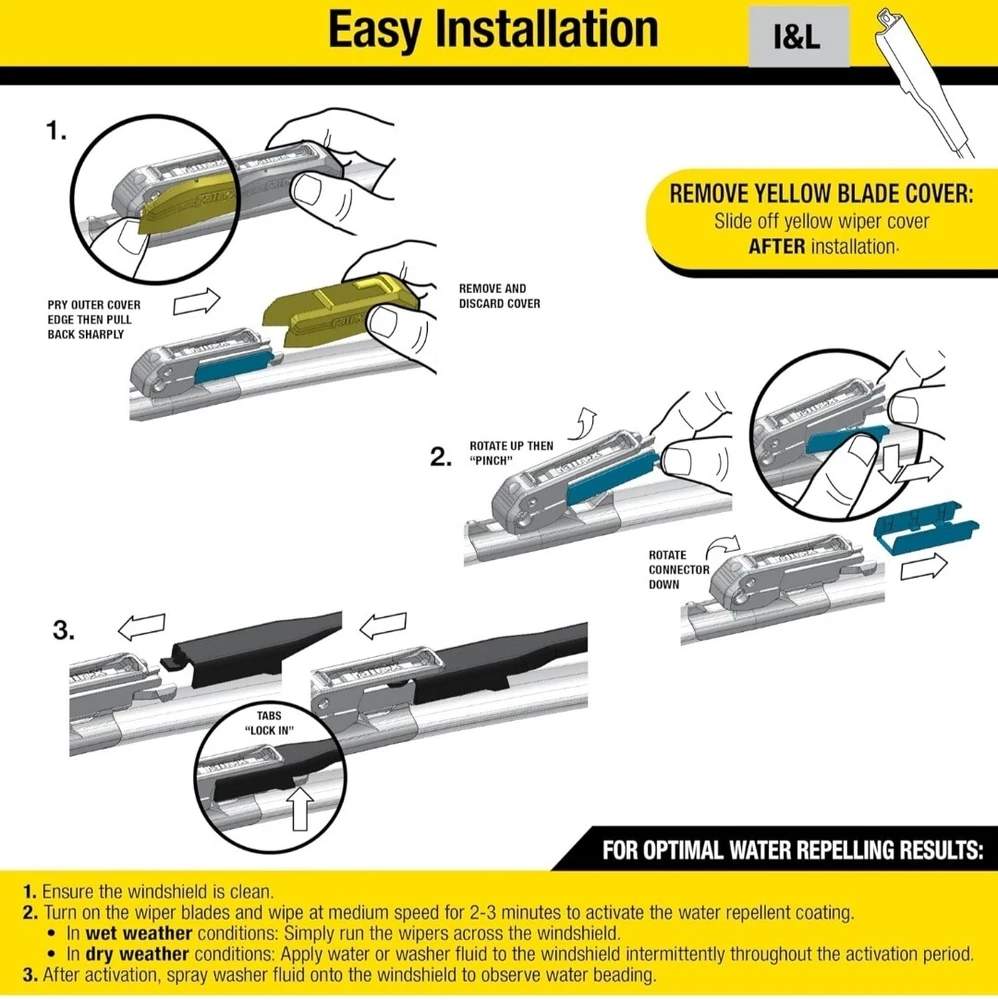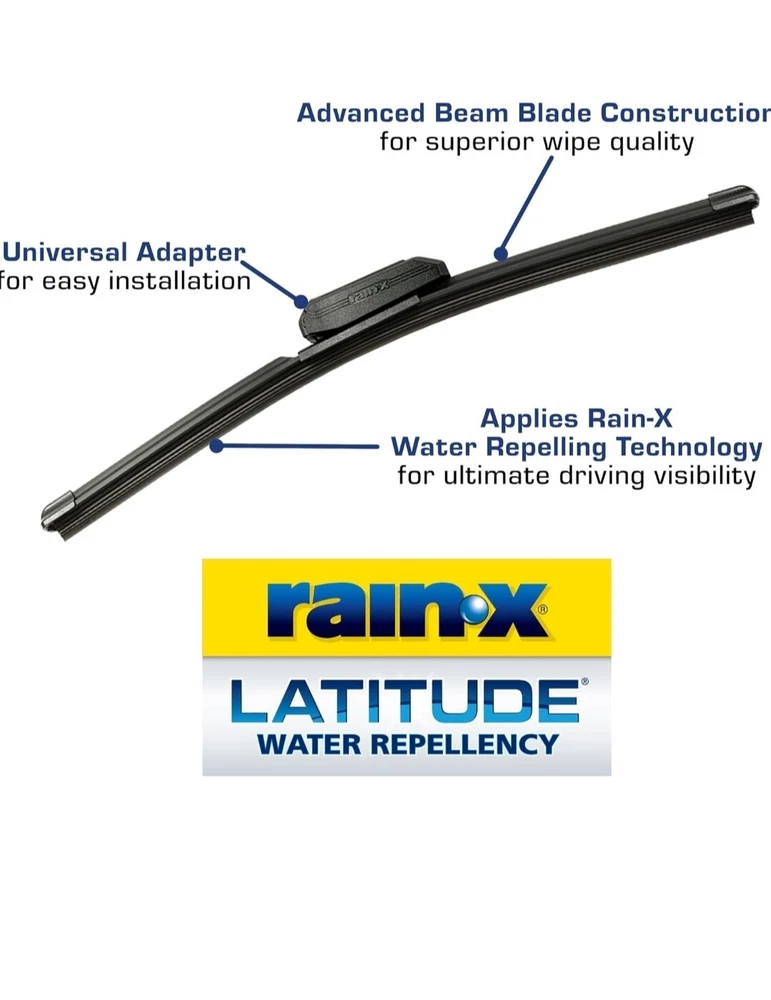 Auto Part Position: Front Brand: Rain-X Material: Natural Rubber Fit Type: Vehicle Specific Fit Item Length::22 Inches Patented Water Repellent Formula - This 2-In-1 Wiper Blade Plus Rain Repellent Applies Patented Rain X Water Repellent Directly To Your Windshield, Both Clearing And Repelling The Elements Superior Driving Visibility And Safety - Watch Water Magically Bead Up And Roll Off Your Windshield While You Drive, Providing You With Superior All-Weather Driving Visibility, Safety, And Comfort Easy Installation And Universal Fit - The Rain-X Universal Adapter Is Easy To Use And Fits 96% Of Vehicles. Scan The QR Code On The Back Of The Package For Installation Videos Advanced Beam Wiper Blade Technology - Provides Uniform Pressure Points Along The Length Of The Blade, Allowing It To Hug The Curvature Of The Windshield For A Smooth, Clean Wipe Ultimate All-Weather Performance - Designed To Clear Your Windshield In Extreme Weather Conditions, Such As Ice, Snow, And Sleet Delivering Longer-Lasting, Superior Wipe Performance Please remove the yellow squeegee cover after installation to ensure optimal performance. Failure to do so will prevent the wiper blades from working properly.
