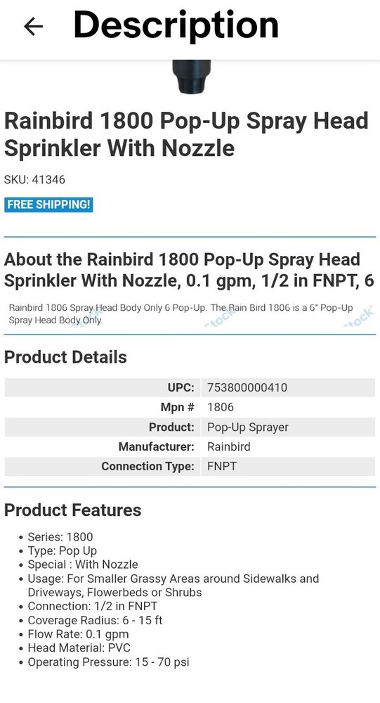 Rainbird 1800 Pop-Up Spray Head Sprinkler With Nozzle, 0.1 gpm, 1/2 in FNPT, 6. NEW PLEASE ENLARGE ALL PHOTOS AND CHECK OUT PICTURES THOROUGHLY AS THEY ARE PART OF THE DESCRIPTION. I SHIP MOST ITEMS PRIORITY INSURED. IF THE ITEM IS NOT BEING SHIPPED BY PRIORITY YOU MUST REQUEST INSURANCE OR ACCEPT THE RESPONSIBILILTY WHEN IT IS DAMAGED BY THE SHIPPER. I WILL NOT ACCEPT RESPONSIBILITY OR REFUND IN THE EVENT THIS HAPPENS. IF ITEM SHOWS IT HAS BEEN DELIVERED I WILL NOT REFUND PAYMENT IF BUYER SAYS IT WAS NEVER RECEIVED. ALSO THERE HAS BEEN OCCATIONAL DAMAGE TO ITEMS SHIPPED PRIORITY. I WILL SEND YOU COPIES OF ALL PERTINENT INFO RELATING TO YOUR ITEM SO YOU CAN FILE A CLAIM WITH THE CARRIER, IN THE EVENT THIS HAPPENS TO YOU. 1 DAY HANDLING. I DO NOT SHIP ON WEEKENDS OR HOLIDAYS. I f you have any questions please contact me. I will combine items for shipment if possible. I will ship by USPS, UPS GROUND ONLY . PAYMENTS MANAGED BY EBAY and payment is DUE WITHIN 3 DAYS following close of auction unless other arrangements have been made. PLEASE RESPOND TO MY MESSAGE AND I WILL WORK WITH YOU. OTHERWISE YOU WILL BE BLOCKED FROM MY STORE AND I WILL CANCEL ITEM WITHIN 7 DAYS. FEEDBACK: I DO LEAVE FEEDBACK AND HOPE YOU WILL DO THE SAME. MY APOLOGIES IN ADVANCE, BUT I SHIP TO THE LOWER 48 STATES ONLY. ITEMS MAY CONTAIN NATURAL "AS MADE" MANUFACTURING FLAWS. I PACK ALL ITEMS WITH THE UTMOST CARE TO AVOID DAMAGE IN SHIPPING. BUYER : THE BUYER SHALL BE RESPONSIBLE TO ASK QUESTIONS AND TO VERIFY ANY INFORMATION TO THEIR SATISFACTION BEFORE PLACING A BID BY PLACING A BID THE BUYER HEREBY ACKNOWLEDGES THAT THEY HAVE READ ALL TERMS AND CONDITIONS OF THE SALE, HAVE ASKED QUESTIONS AND ARE SATISFIED WITH THE INFORMATION THEY HAVE OBTAINED.