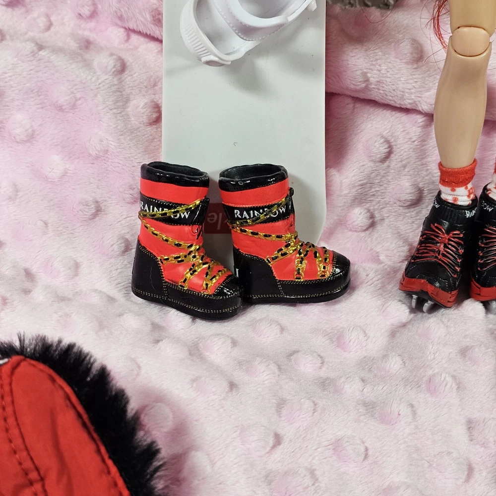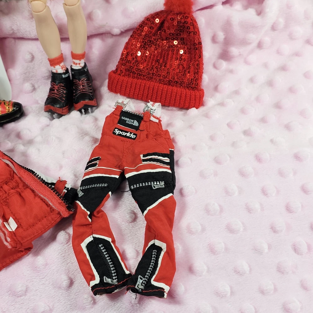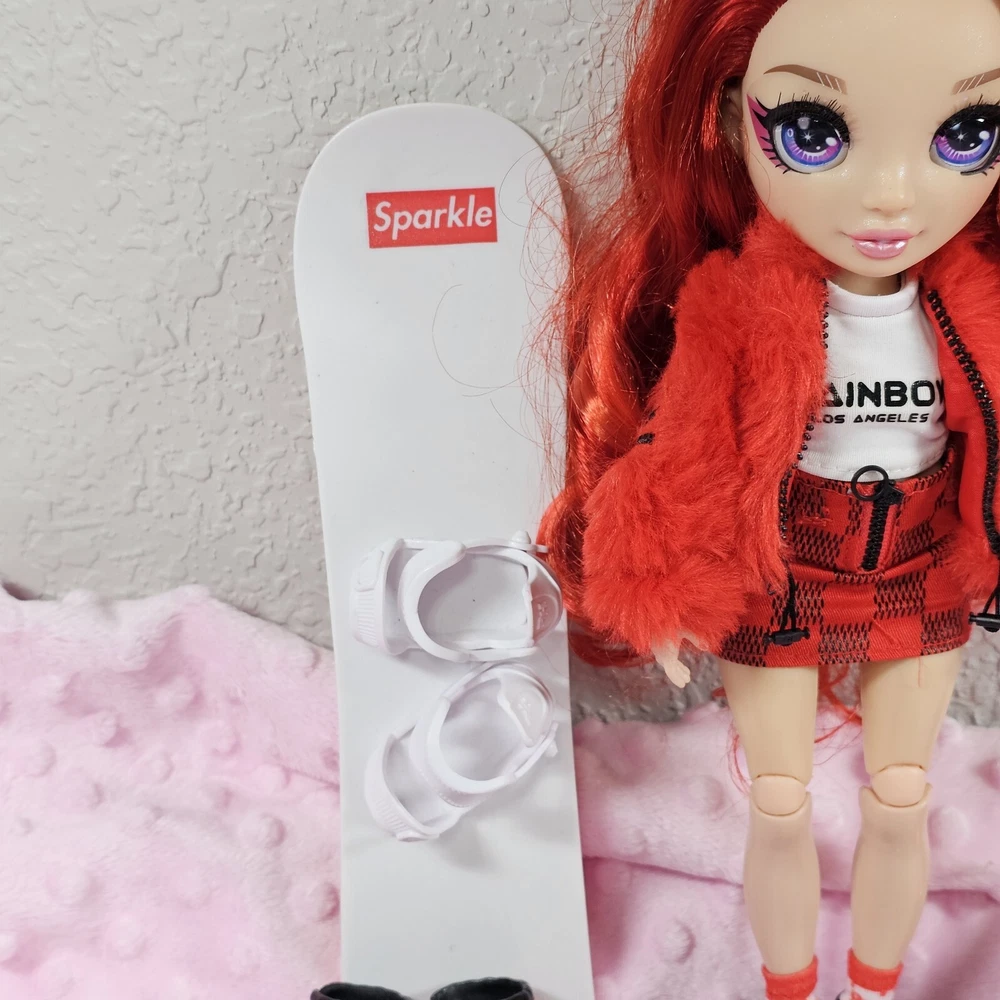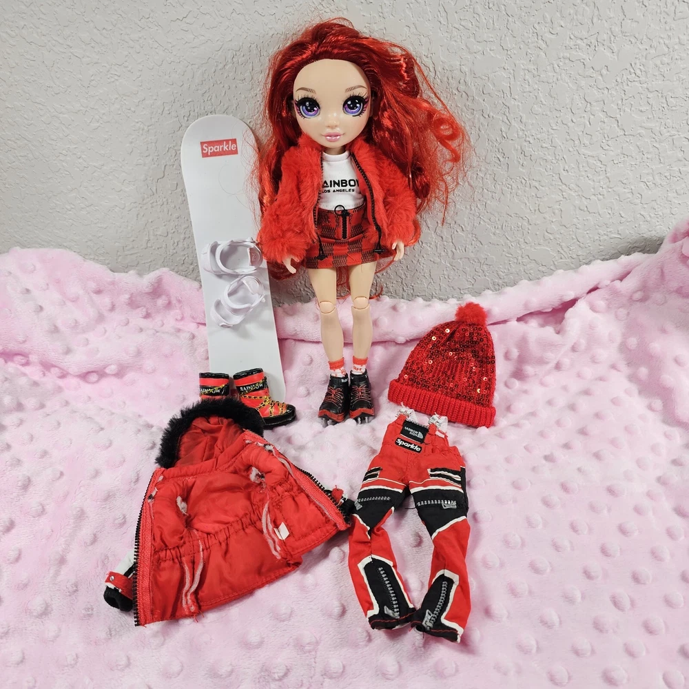 Rainbow High Winter Break Ruby Anderson Snowboard. Ruby comes with all her essential winter gear including sequined beanie, fluffy jacket, ice skates, winter boots and snowboard that have working bindings. Like new. Smoke free home.