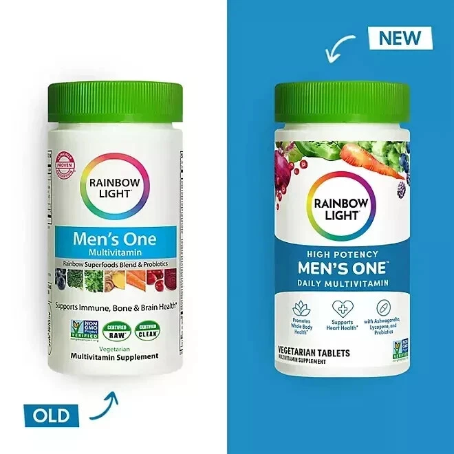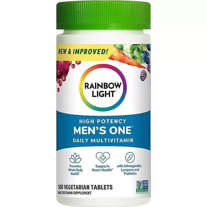 FREE SHIPPING Rainbow Light Men's One Multivitamin Tablet Plus Superfoods & Probiotics 180 ct Rainbow Light® Men’s One™ Multivitamin Plus Superfoods & Probiotics Non-GMO provides comprehensive nutritional support tailored to men’s health. This complete multivitamin for men nourishes the body with scientifically studied ingredients, a rainbow blend of organic superfoods and a unique Men's Vitality Blend to fuel vitality at the cellular level.* Each tablet contains key nutrients that support nervous system health and helps bolster immunity.* Specially formulated with potent B vitamins, probiotics and plant-sourced enzymes as well as a Men's Vitality Blend, which contains organic chlorella, organic green tea and lycopene to promote energy and vigor.* Rainbow Light® Men's One™ Multivitamin provides optimum nutrition to support a vibrant healthy lifestyle. Men's Health Multivitamin This once-daily multivitamin includes a 180-count supply and provides the essential vitamins, minerals and antioxidants to meet the nutritional needs of men. Whole Body Health Promotes full-body wellness and a vibrant healthy lifestyle with high-potency B vitamins, choline and vitamin D.*