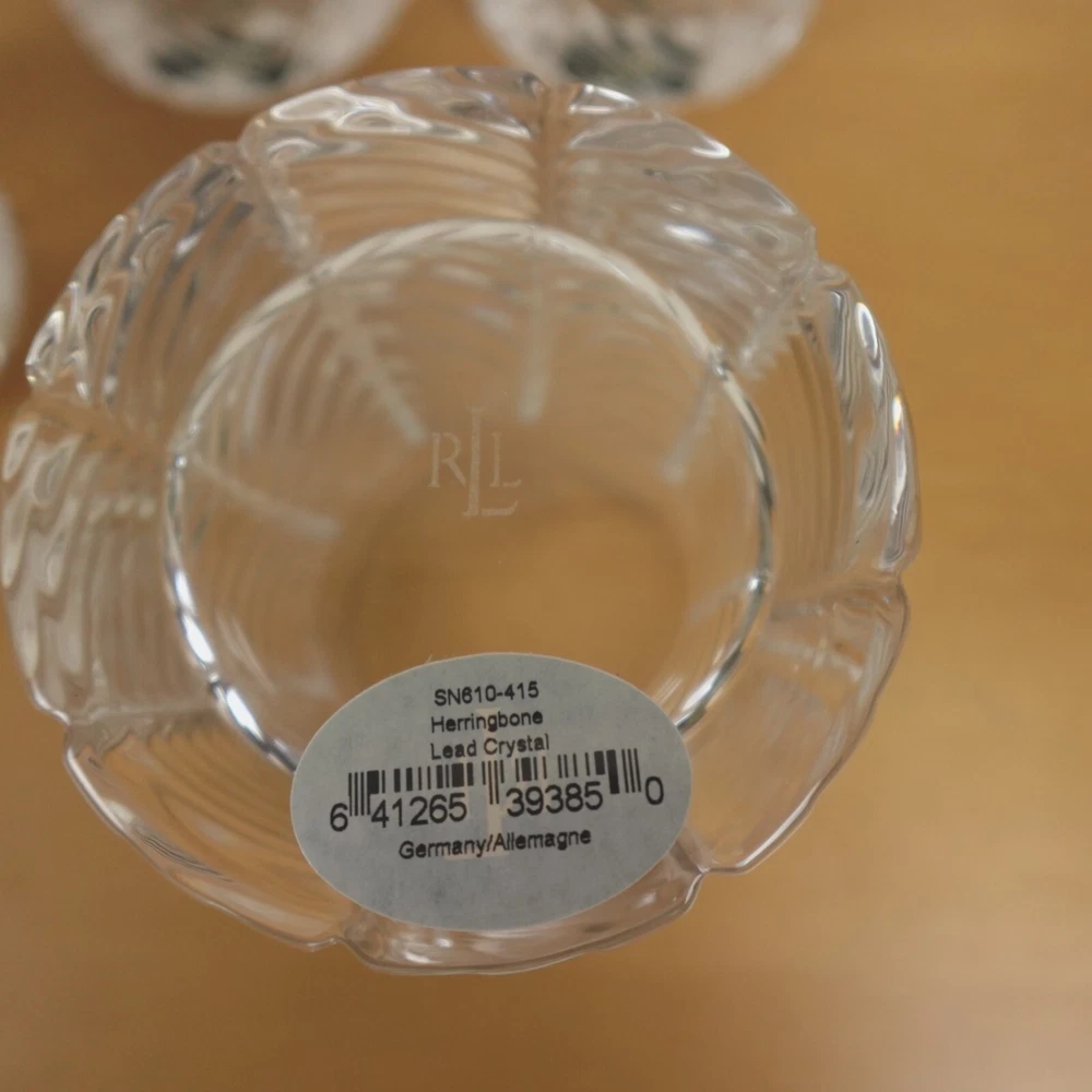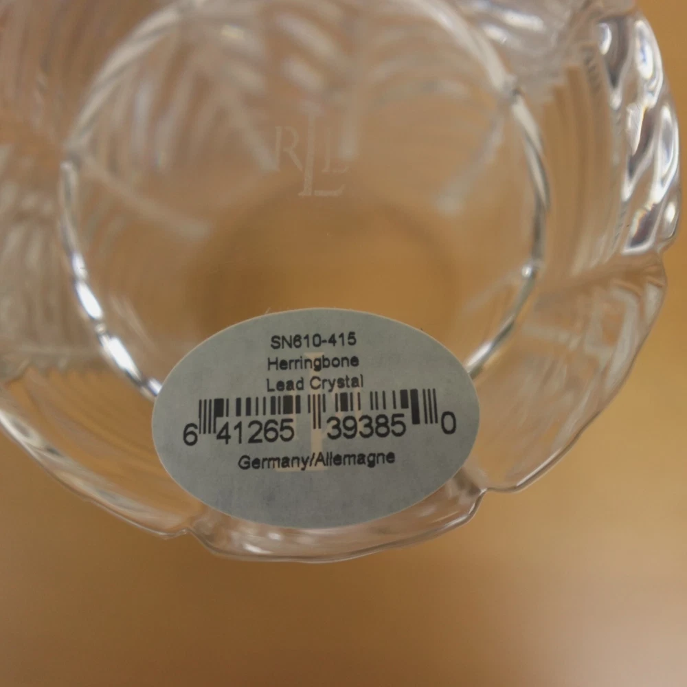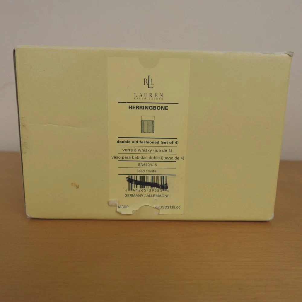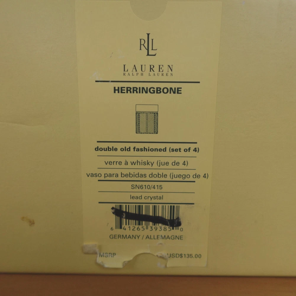 Ralph Lauren Herringbone Glasses Double Old Fashioned Lead Crystal Set of 4 Made in Germany New In Original Box Etched Signed. Never used, discontinued design. Glasses still feature the original sticker on the bottom as pictured. No chips, blemishes, or signs of wear noted, please review all photos. See photos for measurements. If we missed something, don't worry, we offer free returns in original condition. Just indicate, "just didn't like it," for any reason, and we'll pay for the return. Will be professionally packaged for safe delivery. I have 4 additional sets of 4 (16 glasses total) highball glasses, please see my other listings if interested. Thanks for visiting!