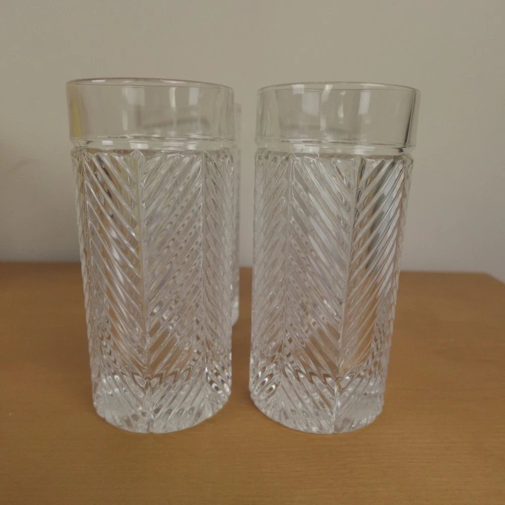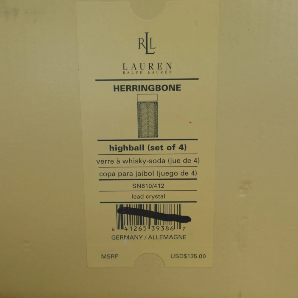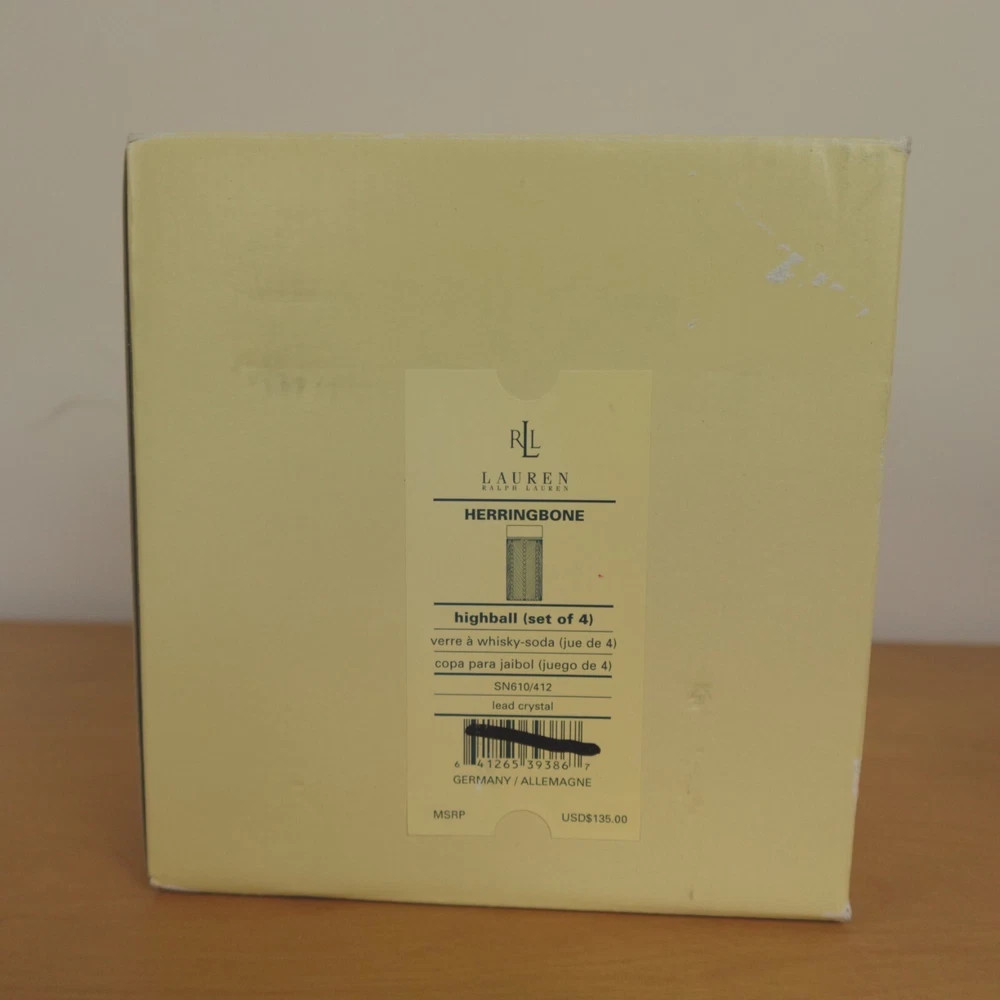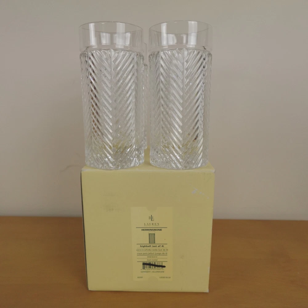 Ralph Lauren Herringbone Glasses Highball Lead Crystal Set of 4 Made in Germany New In Original Box Etched Signed. Never used, discontinued design. No chips, blemishes, or signs of wear noted, please review all photos. See photos for measurements. If we missed something, don't worry, we offer free returns in original condition. Just indicate, "just didn't like it," for any reason, and we'll pay for the return. Will be professionally packaged for safe delivery. I have two additional sets of 4 (12 glasses total), please see my other listings if interested. Thanks for visiting!