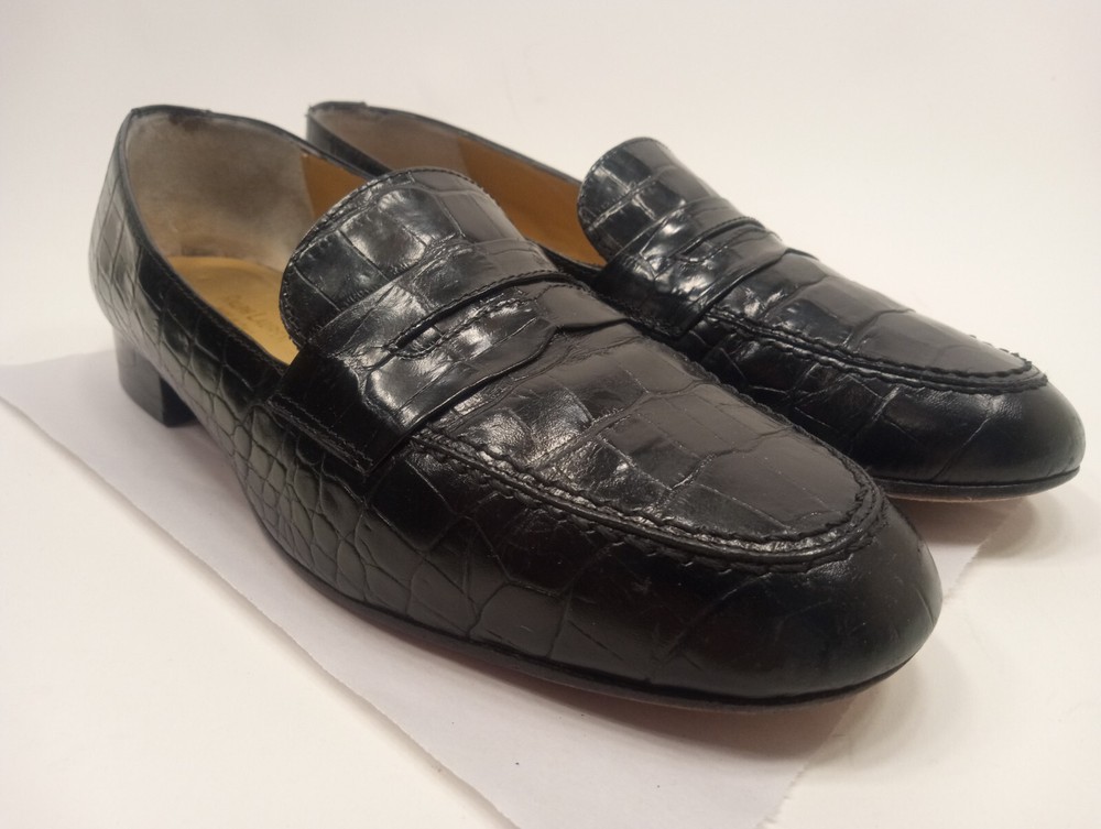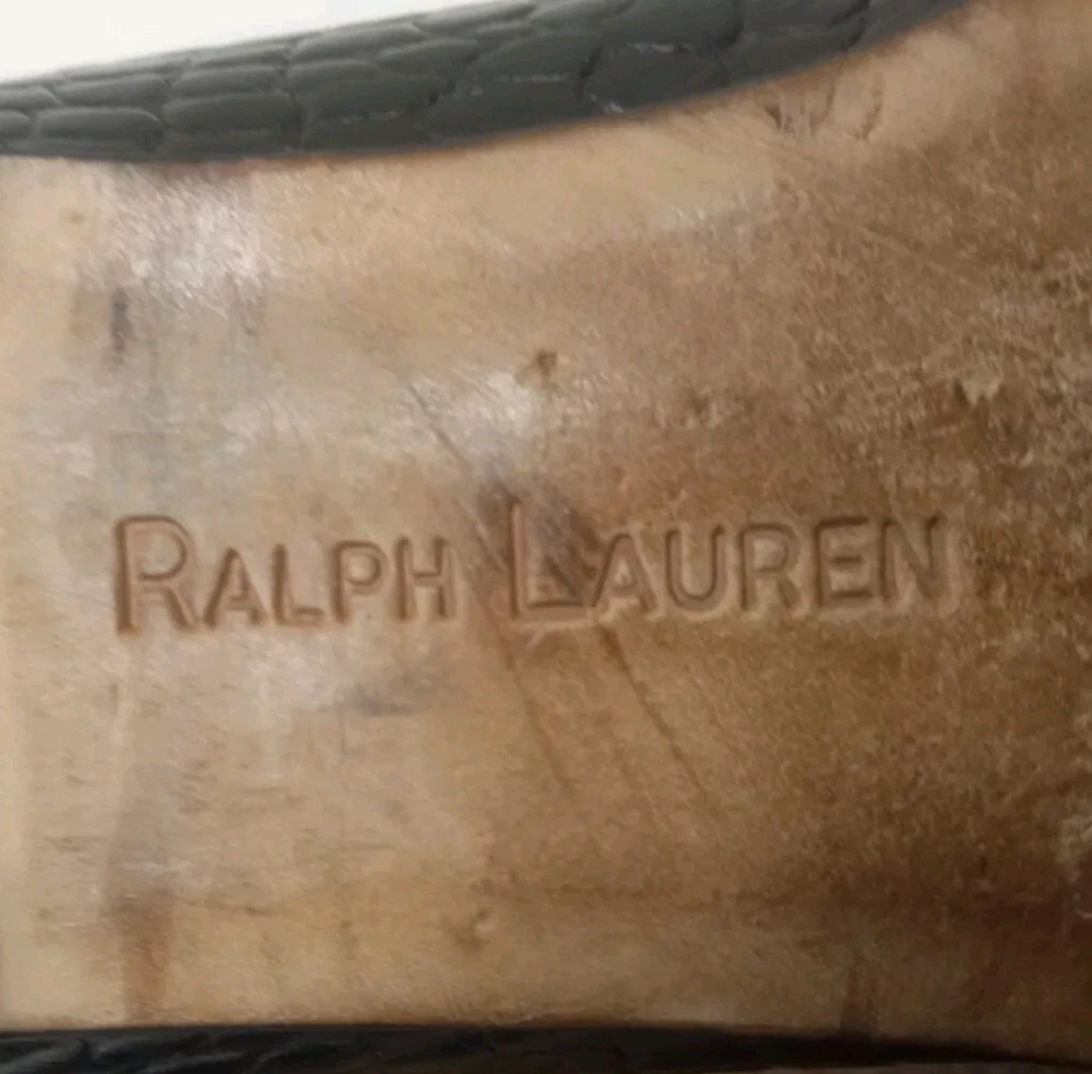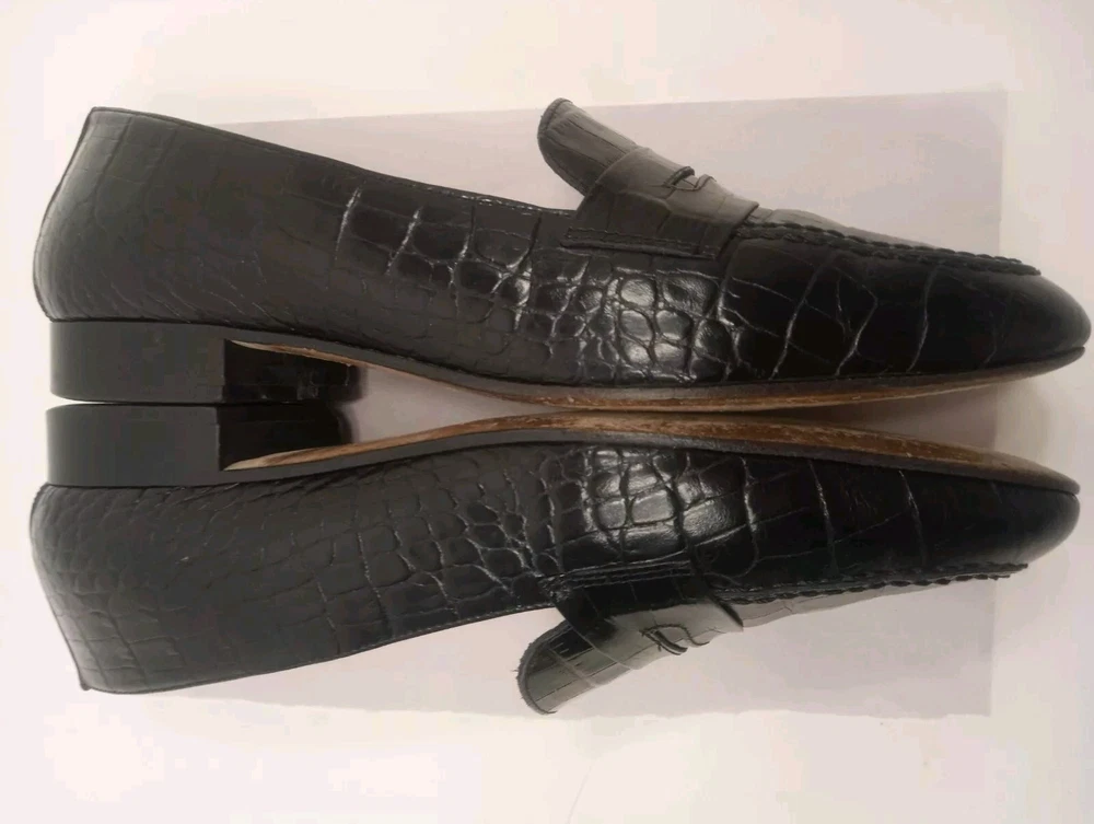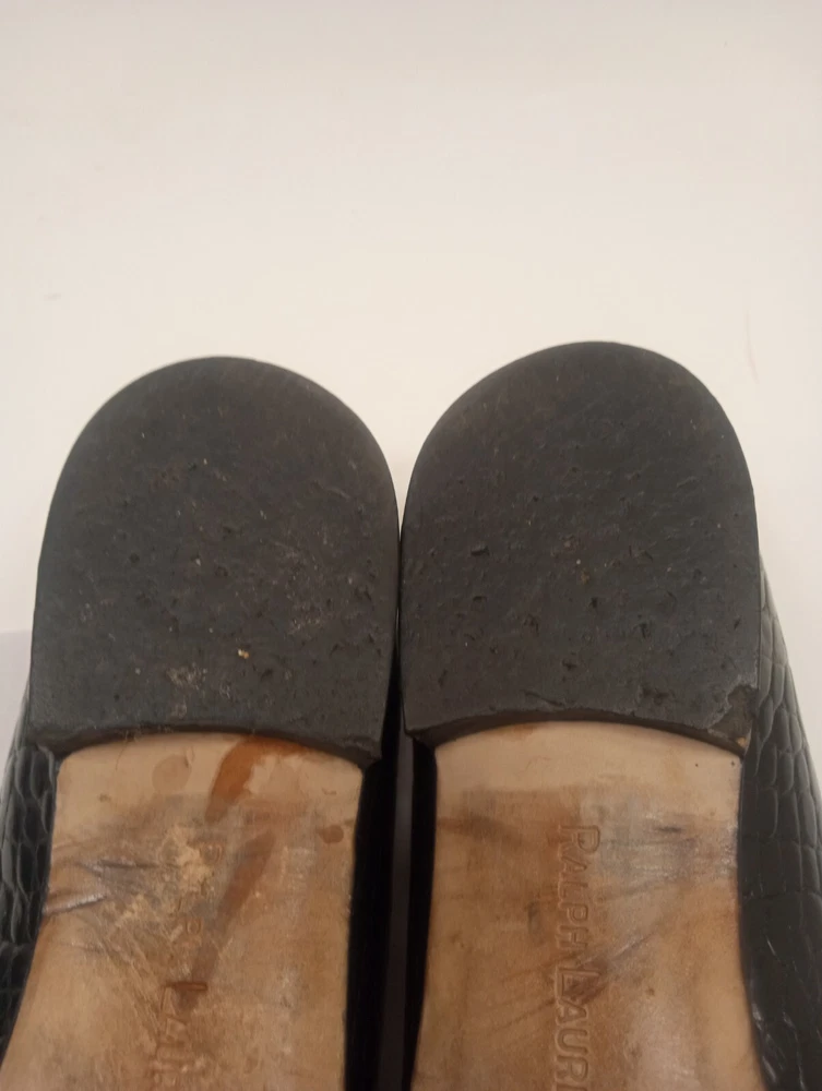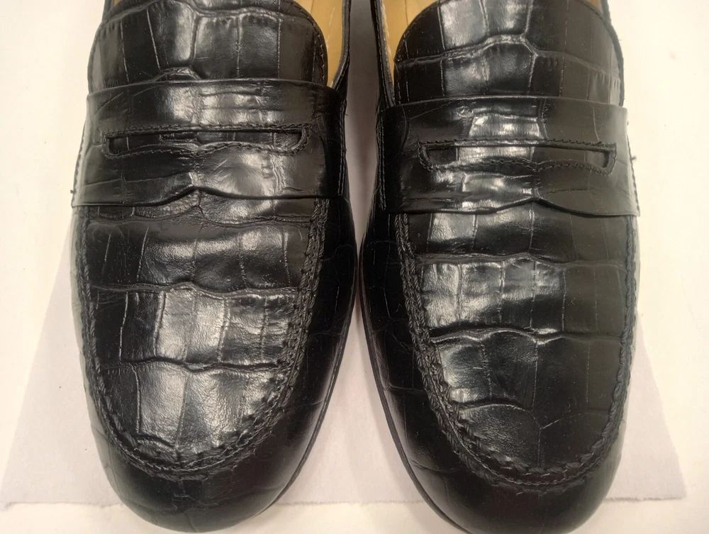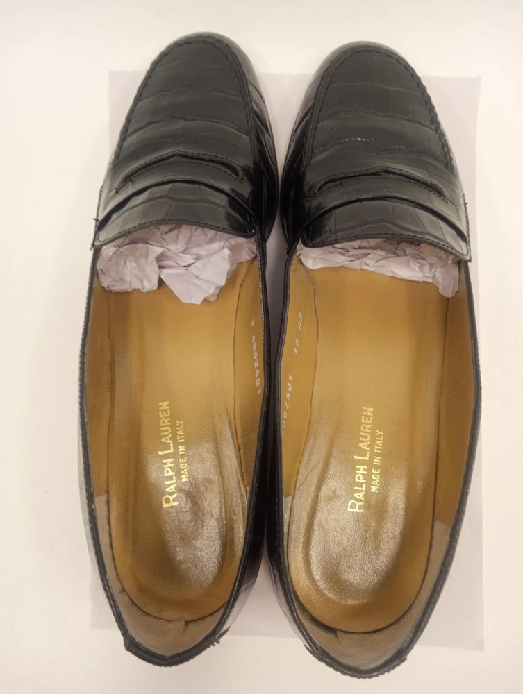 Ralph Lauren Crocodile Embossed Leather Penny Loafers in size 10 AA for women boast a sophisticated almond toe shape and slip-on style. These limited edition flats feature a low heel and lightweight design, crafted in Italy with luxurious leather lining and outsole. The crocodile embossed upper adds a touch of elegance to this classic Penny Loafer style.