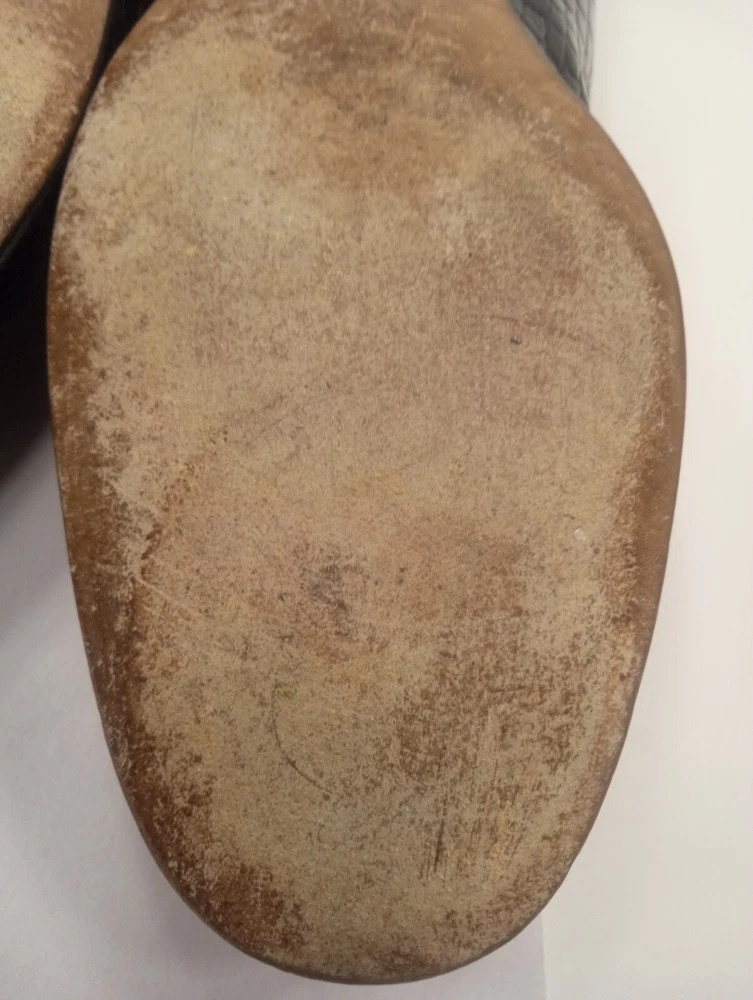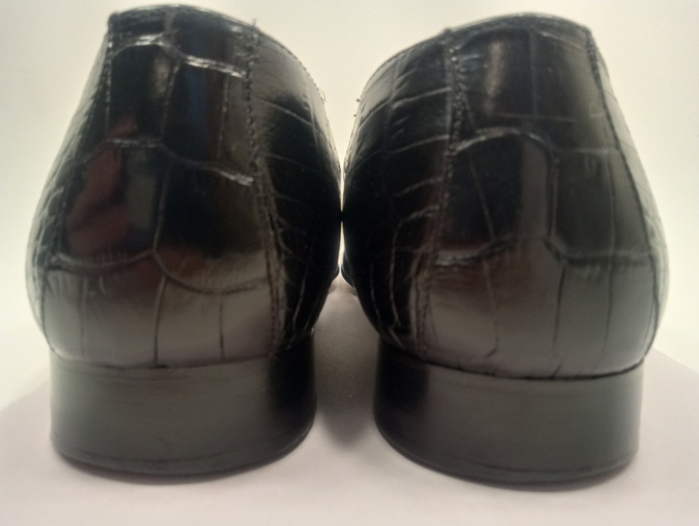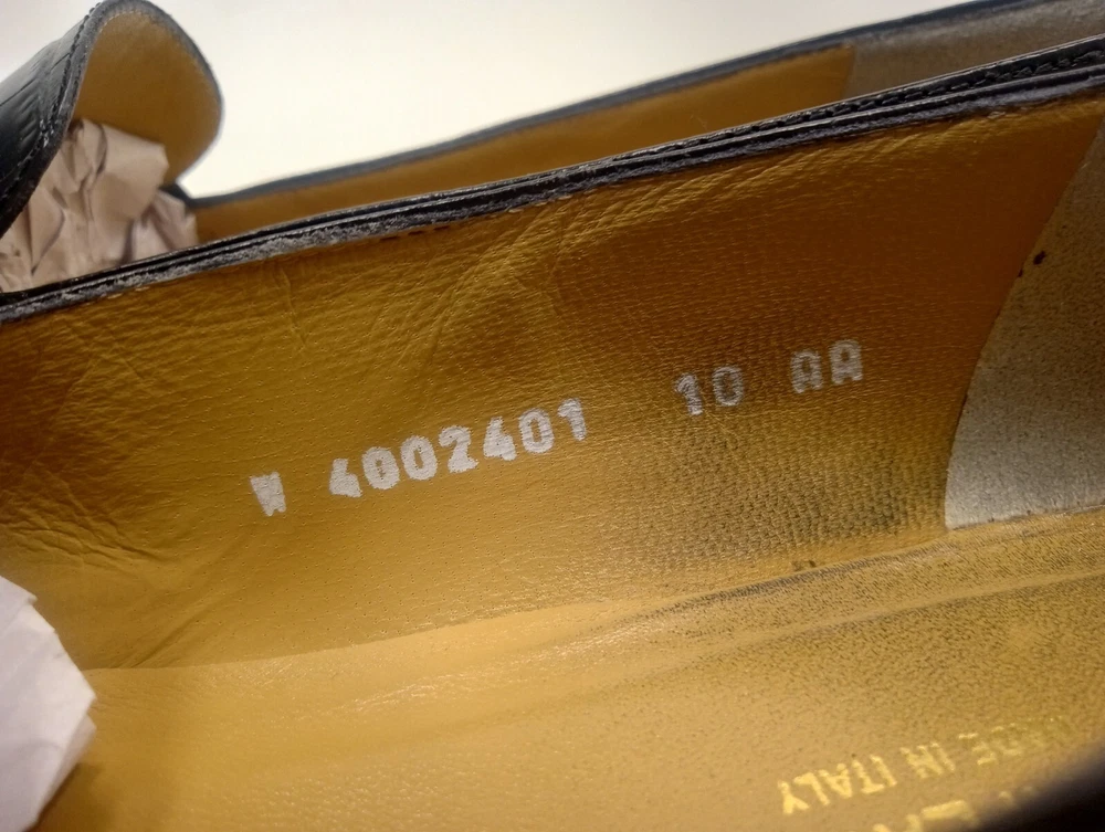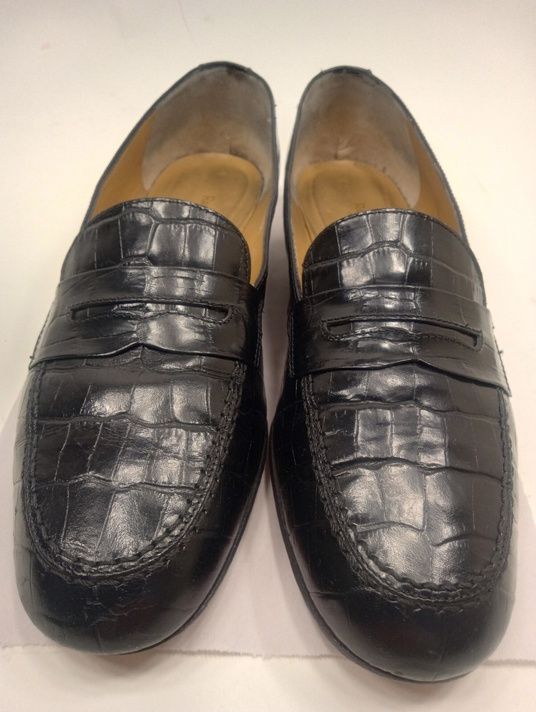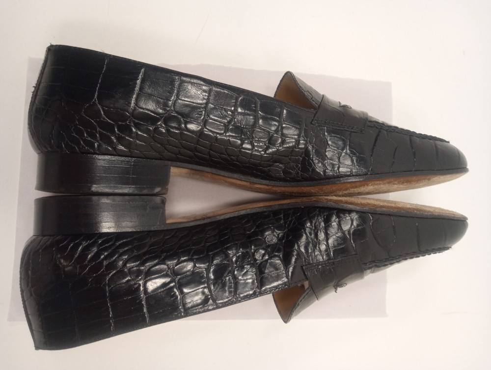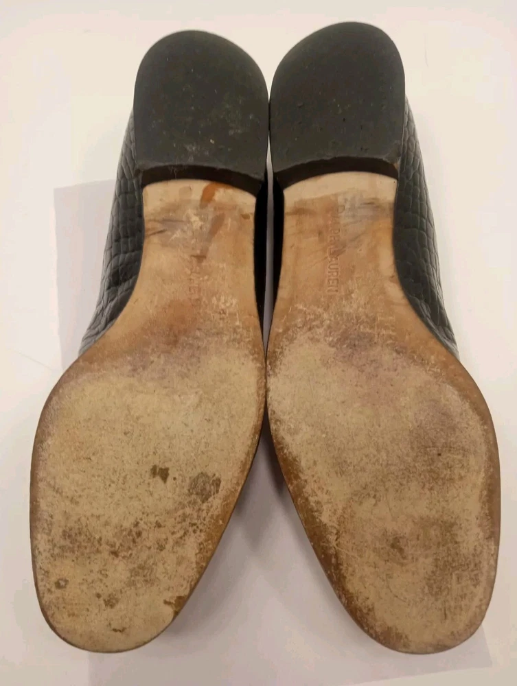 Ralph Lauren Crocodile Embossed Leather Penny Loafers in size 10 AA for women boast a sophisticated almond toe shape and slip-on style. These limited edition flats feature a low heel and lightweight design, crafted in Italy with luxurious leather lining and outsole. The crocodile embossed upper adds a touch of elegance to this classic Penny Loafer style.
