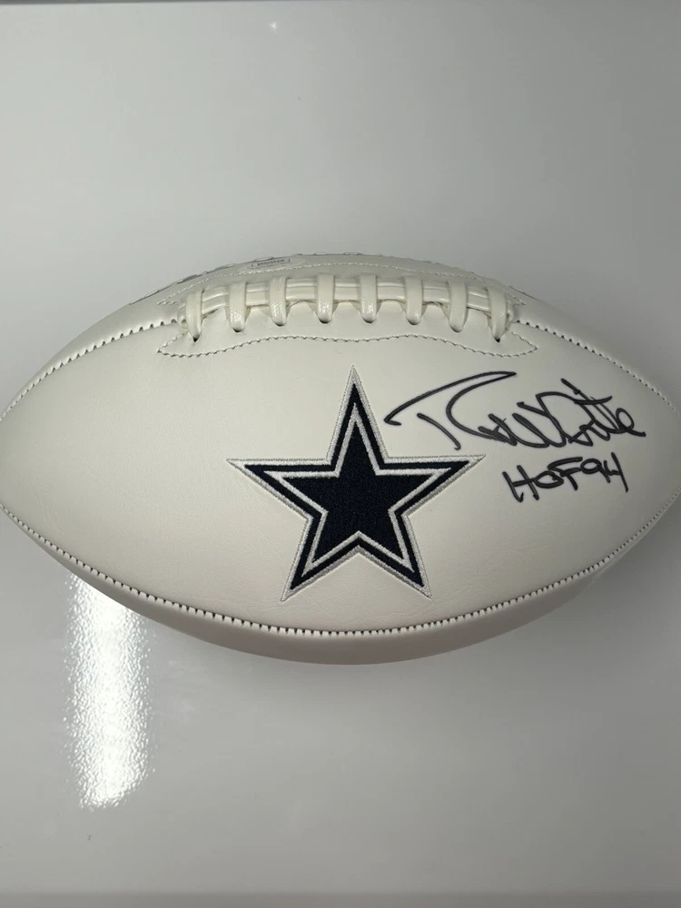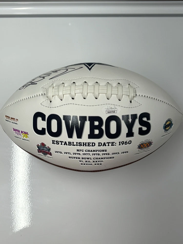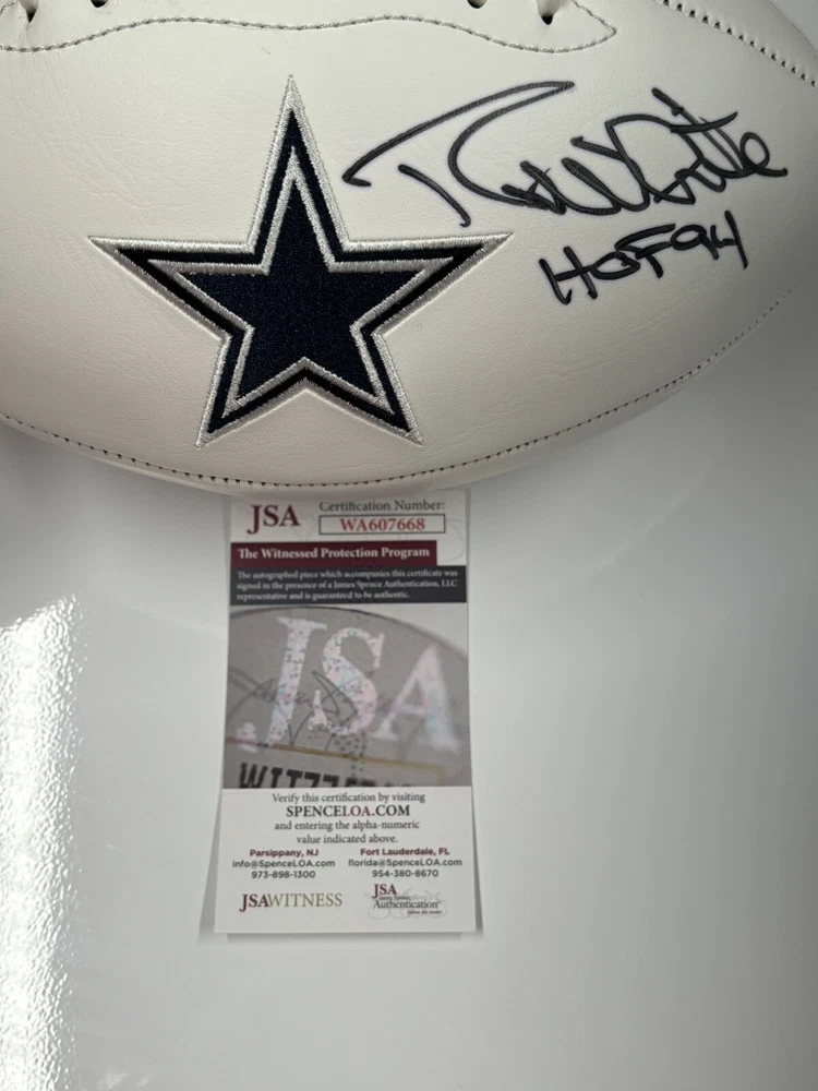 This Dallas Cowboys logo football is a must-have for any fan, especially those who admire the legendary Randy White. The ball has been hand-signed by White himself, and comes with authentication from James Spence Authentication (JSA). This makes it a guaranteed original autograph, without any questions about authenticity. The football is in great shape, ready to be display or added to a collection. The team logo and colors are featured prominently on the ball, making it a great addition to any sports memorabilia collection. Don't miss out on the chance to own a piece of football history.