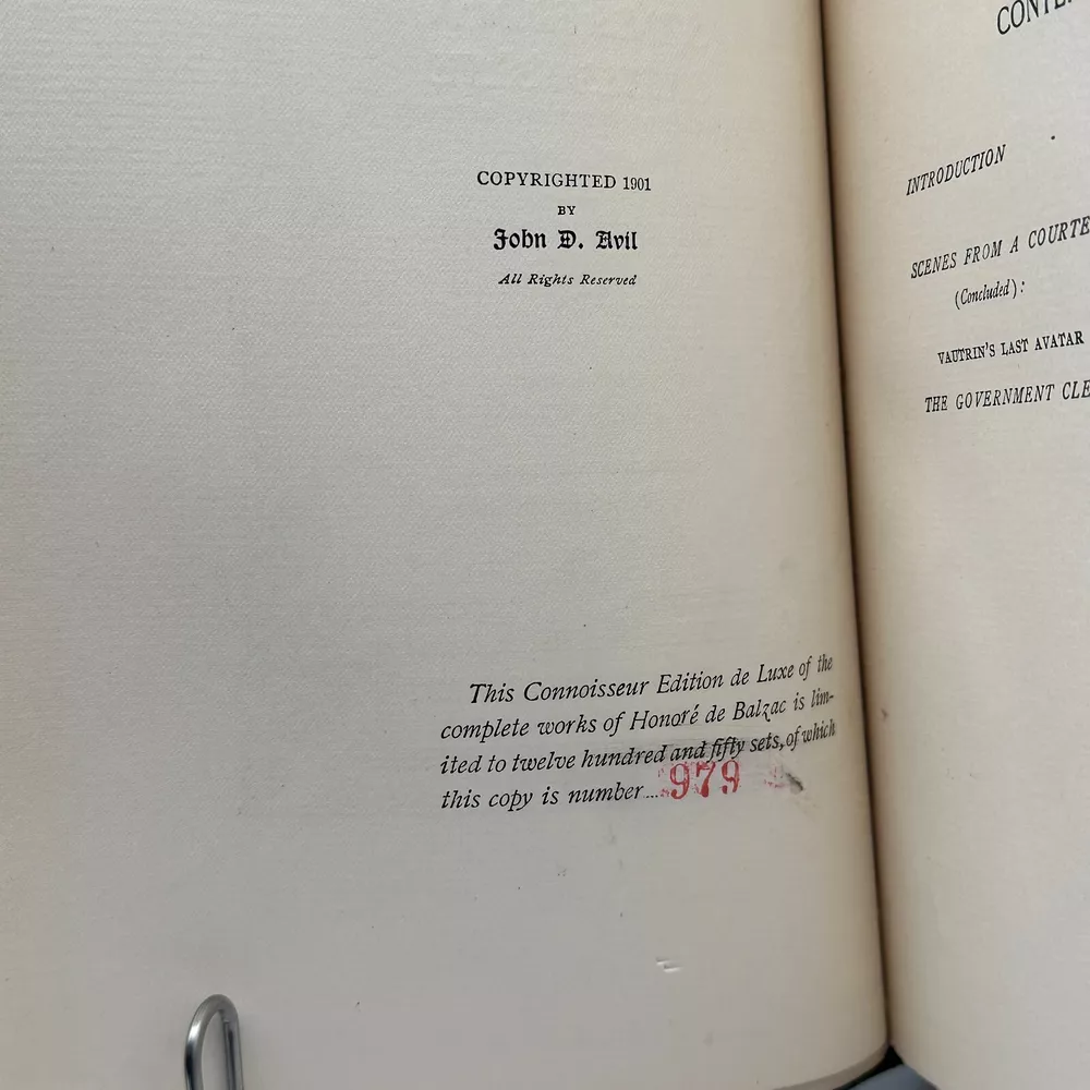 This limited edition, No. 979 of only 1,250 copies. Explore the hidden world of Parisian courtesans in Balzac’s A Courtesan’s Life , a captivating tale of ambition, decadence, and power . This 1901 Connoisseur Edition de Luxe , published by Avil Publishing Company , is limited to just 1,250 copies . With its original green cloth binding and uncut deckled pages , this rare volume is a gem for collectors of French literature and historical fiction . A fine addition to any library or rare book collection!