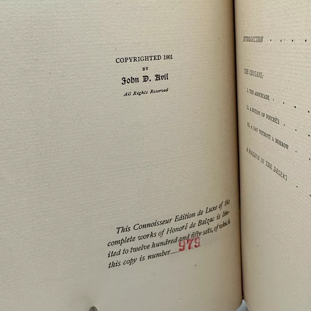 This limited edition, No. 979 of only 1,250 copies. A classic historical novel , The Chouans is Balzac’s first full-length work, weaving romance, war, and political intrigue during the French Revolution. This rare 1901 Connoisseur Edition de Luxe by Avil Publishing Company is one of only 1,250 copies produced . Translated by Ellen Marriage , this edition remains uncut , with original deckled edges and a sturdy green cloth hardcover with a paper spine label . A must-have for collectors of rare French literature and fans of historical fiction !