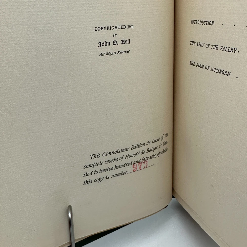 This limited edition, No. 979 of only 1,250 copies. One of Balzac’s most autobiographical works, The Lily of the Valley is a deeply poignant tale of unfulfilled love and emotional longing . This 1901 Connoisseur Edition de Luxe , published by Avil Publishing Company , is one of only 1,250 copies printed . Translated by James Waring , with an introduction by George Saintsbury , this book retains its original uncut pages and deckled edges , bound in green cloth with a paper spine label . A rare collector’s piece and an essential addition to any Balzac collection !