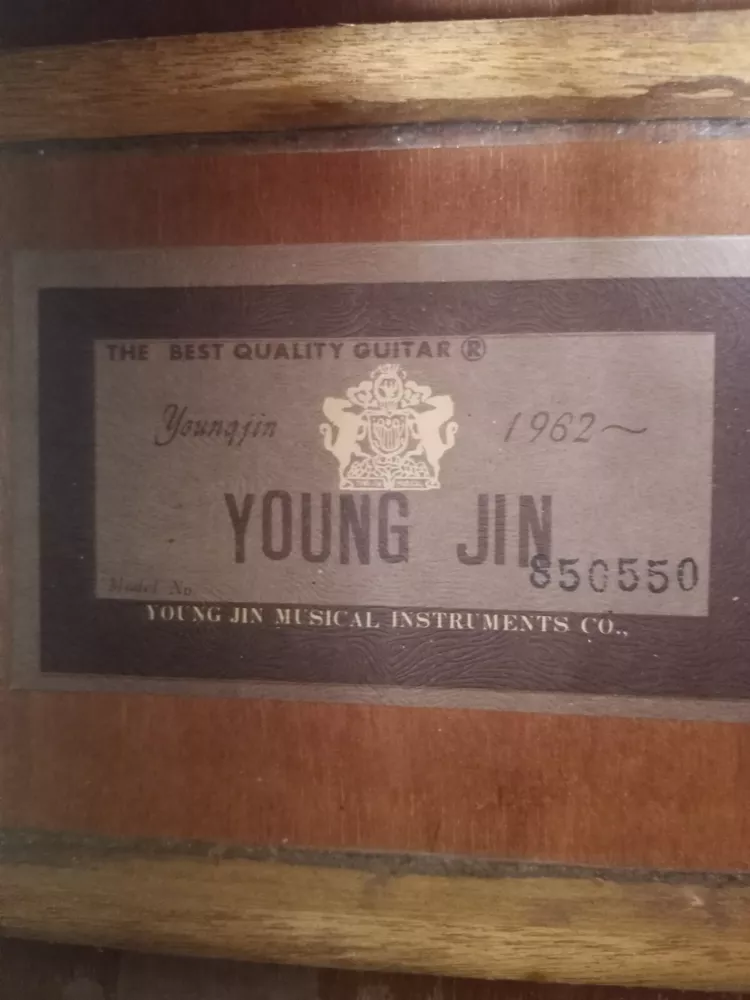 Rare early 1960s Yamaha Youn-Gin Dreadnought. Not alot of info out there on these guitars. What I have read over the years is they were made in 1962/63 for Yamaha by Young-Gin guitars in South Korea. These were supposed to be Yamaha's early entry in budget guitars. Young-Gin guitars has a good reputation in Korea for higher quality budget guitars. However I belive there was no trade agreements with China or Korea at that time and not alot of these guitars made it to the states. If your a Yamaha fan like me this is a nice addtion to your collection that plays and sounds great as well. The guitar it's self is in great structural and mechanical shape with a few cosmetic issuses. Guitar measures at 41" lenght, 12" widest point at top bout and 15 1/2" widest at bottom bout. 4" dept at top and 4 1/2" dept at bottom. 25 1/2" play scale. 20 frets with a zero fret. All smooth on the ends with only lite ware. Neck is thin and taperd making it very fast. Nut size 1 5/8". Just installed new set of D'Addario 12/53s strings. Action is 4.5mm at the 12th fret. No buzzing or dead spots. 3 + 3 open gear tuners are nice quality and hold tune well after new string break in. Very well built high quality binding work front and back of body. Guitar has no wood damage of any kind, No crackes, no seperations, no pull on bridge, No bulging of body. All bracing is tight, no hidden repairs. Bridge is level with no crackes. When I first bought the guitar it had a frat medal gluded to the upper left part of body. When medal was removed it took the finish with it. See last 3 pictures. Guitar also had some sort of message wrote on the front lower right side ( see last 3 pictures ) and looks as if someone tryed to preserve it with some sort of clear coat. Back of guitar has only very lite swirling and lite finish scratches that are hard to see. Over all condition of this 60 year all guitar is very good..Nice collectable and very playable guitar. Does not have case but will use extreme caution when packing for shipment. Happy to answer any questions. Standard shipping is inside 48 states only. UPS ground or FedX home depending on delivery area.