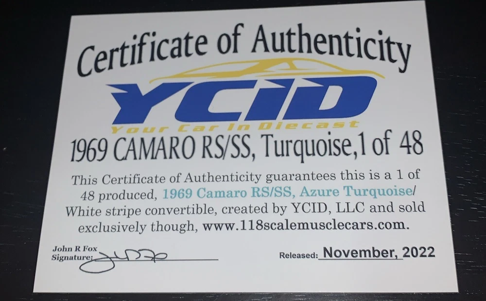 Character Family:MUSCLE CARSeries:YCID 1969 CHEVROLET RS/SS CAMARO AZURE TURQUOISE A1805725TY 1 OFTheme:CarsAutographed:YesVehicle Year:1969Features:Limited Edition, Personal Number PlateUPC:Does Not ApplyVehicle Type:CarVehicle Make:Chevroletgtin13:Does Not ApplyScale:1:18Year of Manufacture:2023Material:DiecastModel:YCID 1969 CHEVROLET RS/SS CAMARO AZURE TURQUOISE A1805725TY 1 OFBrand:YCIDColor:TURQUOISE