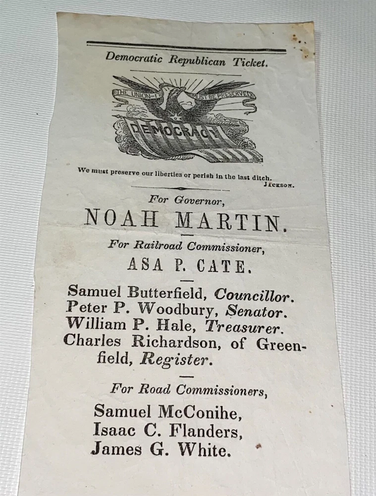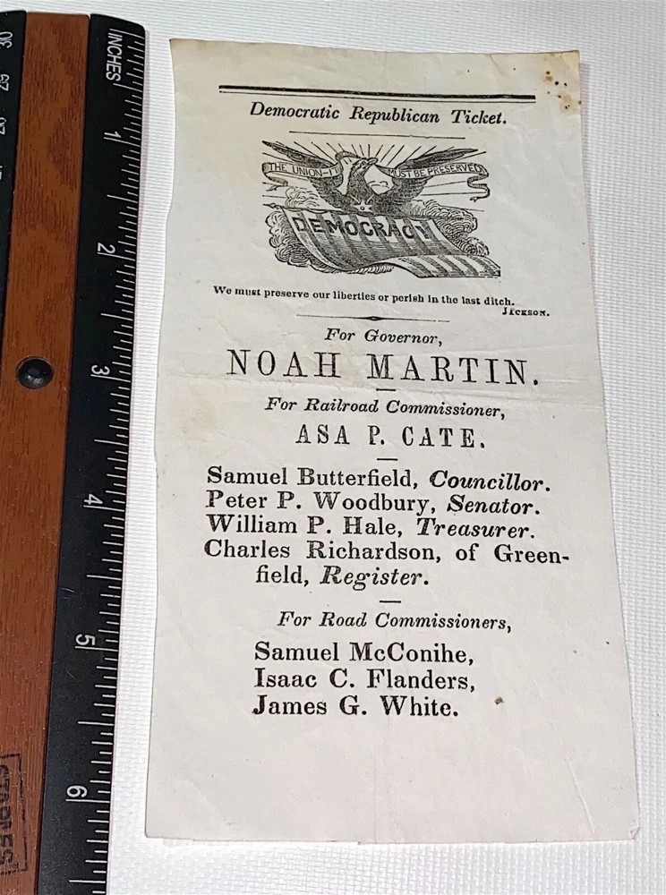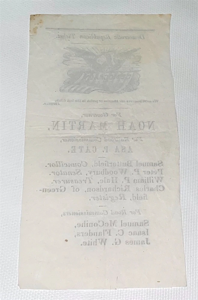 UP FOR SALE: Rare Antique American Democratic Republican New Hampshire Governor Ticket! 1852! Fantastic Antique Victorian American Pre - Civil War Political Ticket! Democratic Republican Ticket "We Must Preserve Our Liberties or Perish In the Last Ditch." - Jackson For Governor - Noah Martin Info: "Noah Anthony Martin was born in Epsom, New Hampshire on July 26, 1801, the son of shoemaker Samuel Martin and Sally (Cochrane) Martin. He apprenticed under Pembroke and Deerfield doctors before attending Dartmouth Medical College. He graduated in 1824, and began his medical practice in Somersworth. He later practiced in Pembroke, and then settled in Dover. In 1825, Martin married Mary Jane Woodbury, the daughter of Dr. Robert Woodbury of Barrington. They were the parents of two daughters, Elizabeth A. and Caroline M. Martin served as a State Representative in 1830 and 1832, as a State Senator in 1835 and 1836, and in the House again in 1837. In addition to being involved in several medical, agricultural, historical, and genealogical societies, Martin was president of the Strafford County Savings Bank (1844–1852), board of directors member of the Dover Bank (1847–1855), and board of directors member of the Strafford Bank (1860–1863). In 1852 Martin was elected Governor of New Hampshire, the first of two from Dover, and he served two one-year terms, June 3, 1852 to June 8, 1854. Martin died in Dover on May 28, 1863, and is buried at Dover's Pine Hill Cemetery." (WIKI) Asa. P. Carte - Railroad Commissioner Samuel Butterfield, Councillor Peter P. Woodbury, Senator William P. Hale, Treasurer Charles Richardson, Register For Road Commissioners: Samuel McConihe Isaac C. Flanders James G. White A great piece of 19th the Century American Political Ephemera! Actual item pictured! Item comes as seen and as is! Please see all photos! Shipping includes insurance & tracking for both buyer and seller's protection! If you have any questions, please do not hesitate to ask! Thanks for stopping in! Scantic Antiques