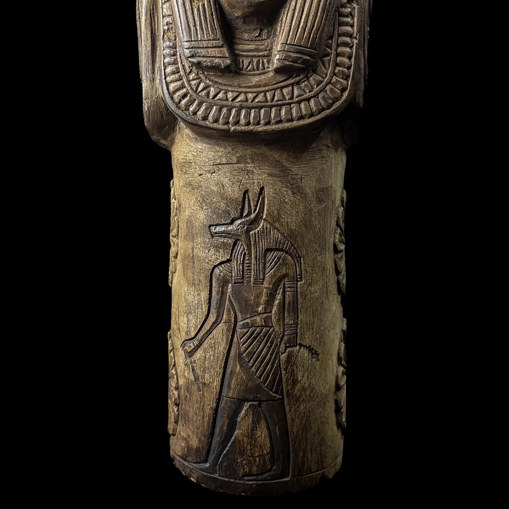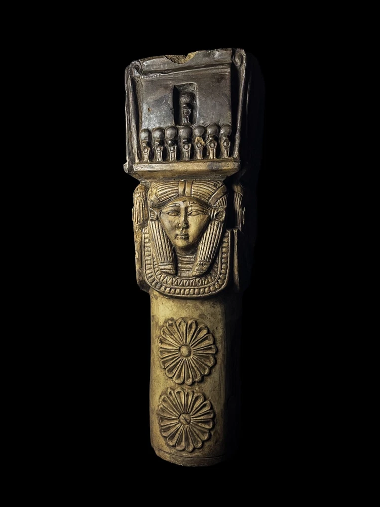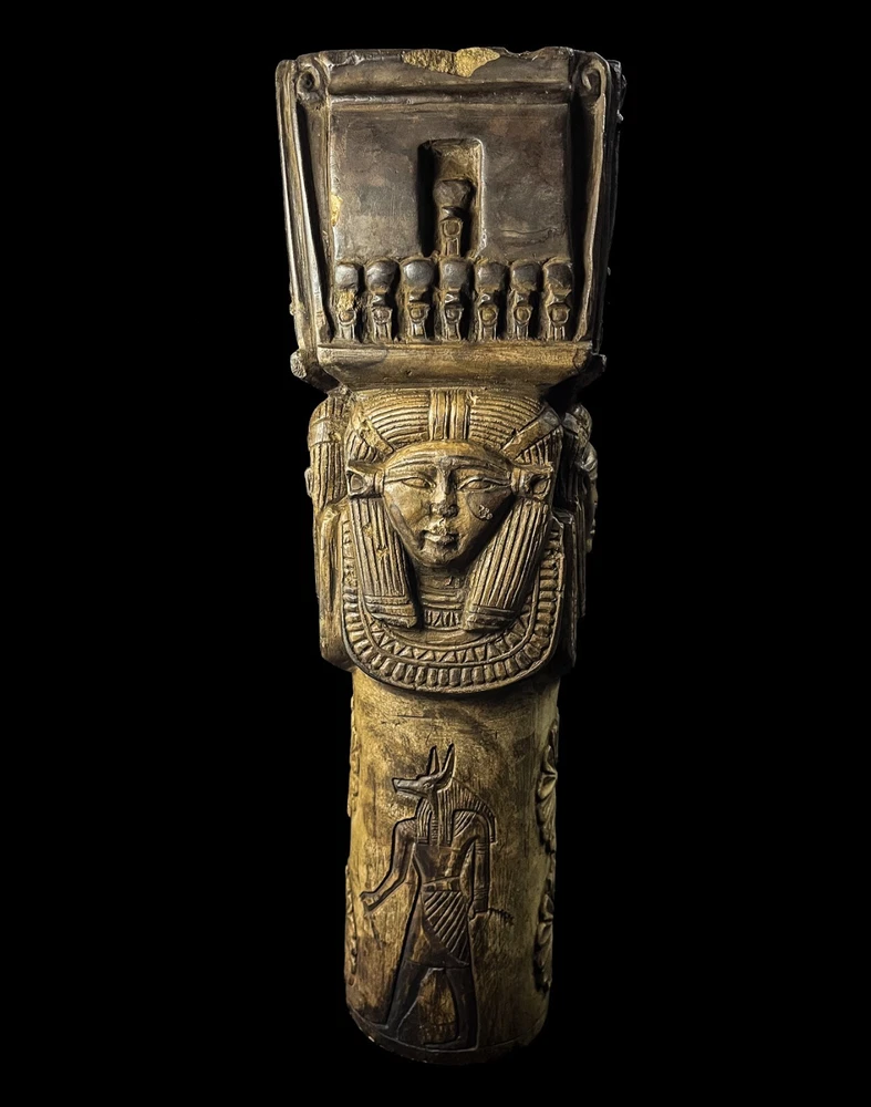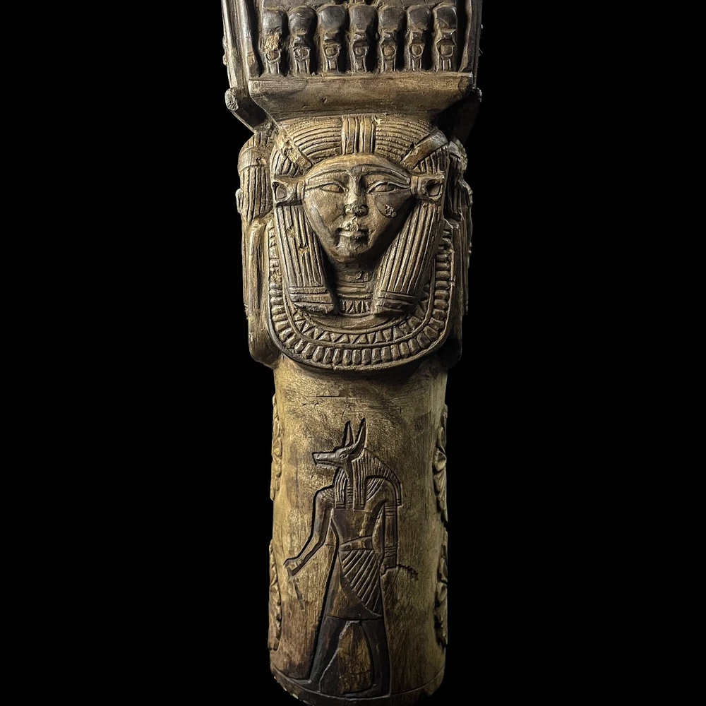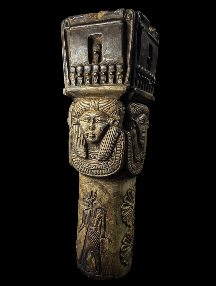 Delve into the rich tapestry of ancient Egyptian culture with this rare antique Hathor Colum, a vintage reproduction that pays homage to the revered goddess Hathor. Crafted from stone, the piece is a testament to the enduring legacy of Egyptian craftsmanship, featuring a stunning array of multi-colors that bring its intricate details to life. The item's origins can be traced back to Egypt, a testament to its authenticity and cultural significance. Its antique style ensures it is a unique addition to any collection, while its age remains a mystery, adding to its intrigue. This piece is a celebration of history and artistry, perfect for enthusiasts of ancient Egyptian artifacts.