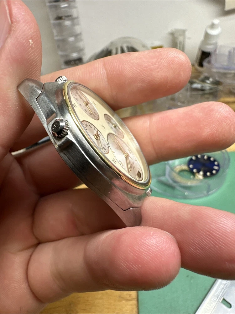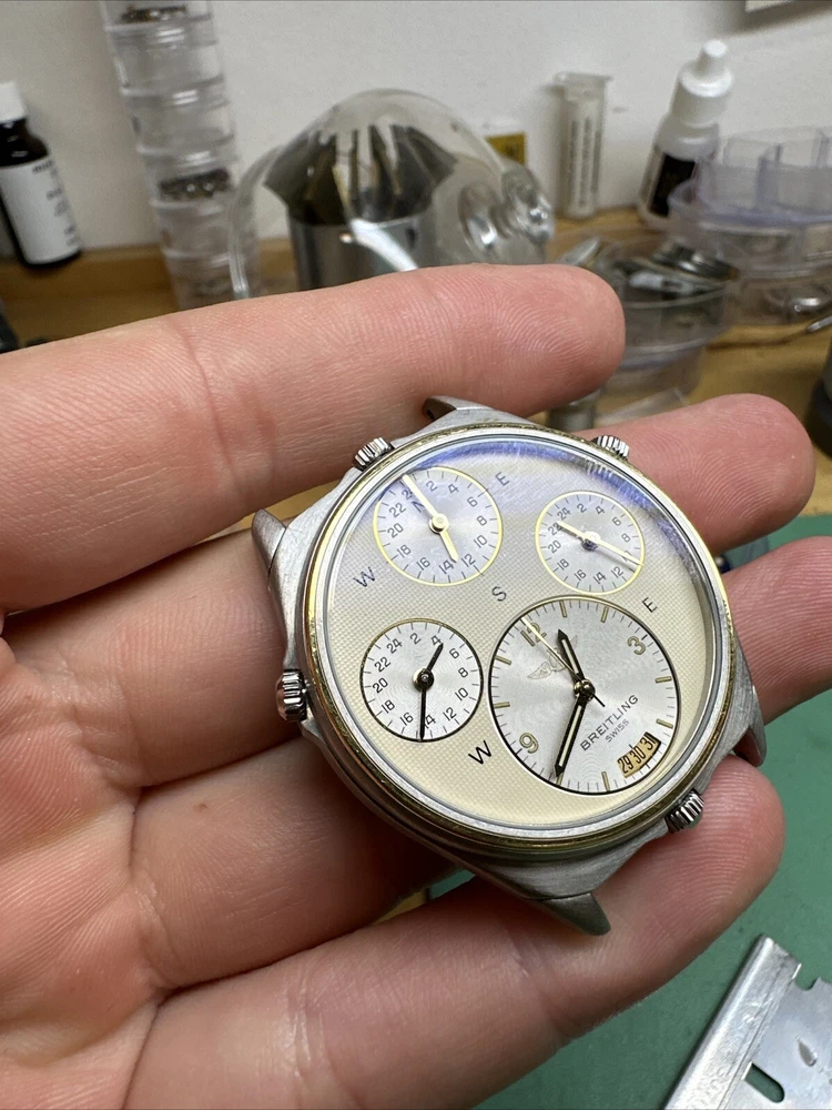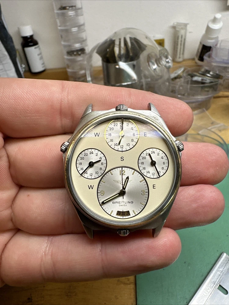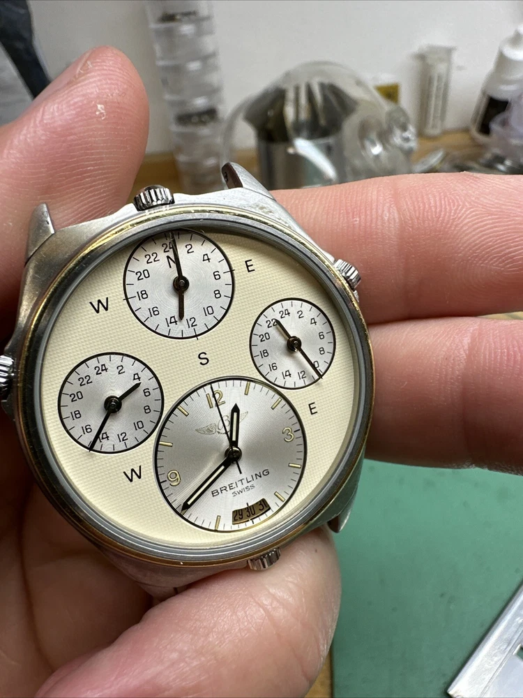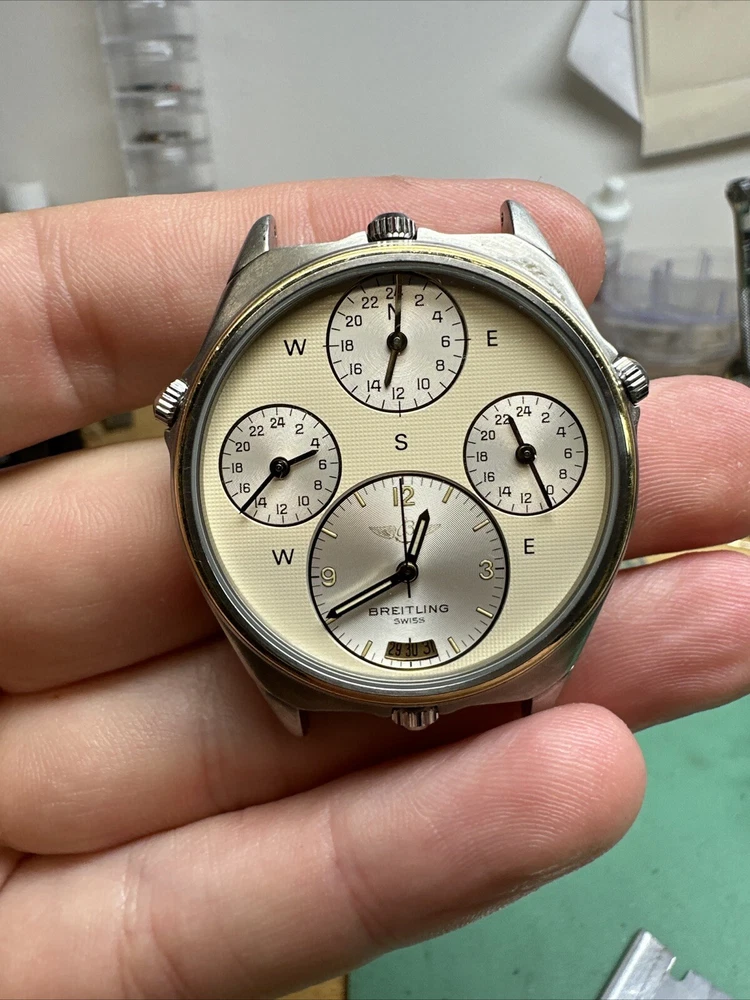 This rare Breitling World Time Pilots Watch is a vintage timepiece designed for men with a 39mm stainless steel case and a two-piece strap. The watch features a round, multicolor dial with Arabic numerals, subdials, and a date display. The fixed gold bezel adds a touch of elegance to the overall design. The watch is made in Switzerland and runs on quartz movement (battery). It also includes features such as world time, unidirectional case, and a screwback case. This watch is perfect for collectors or anyone who appreciates the classic design of a vintage timepiece. Watch isn’t running, not sure how to open it to replace batteries. Watch is pretty much mint, hasn’t been worn very much. Watch only Questions let me know
