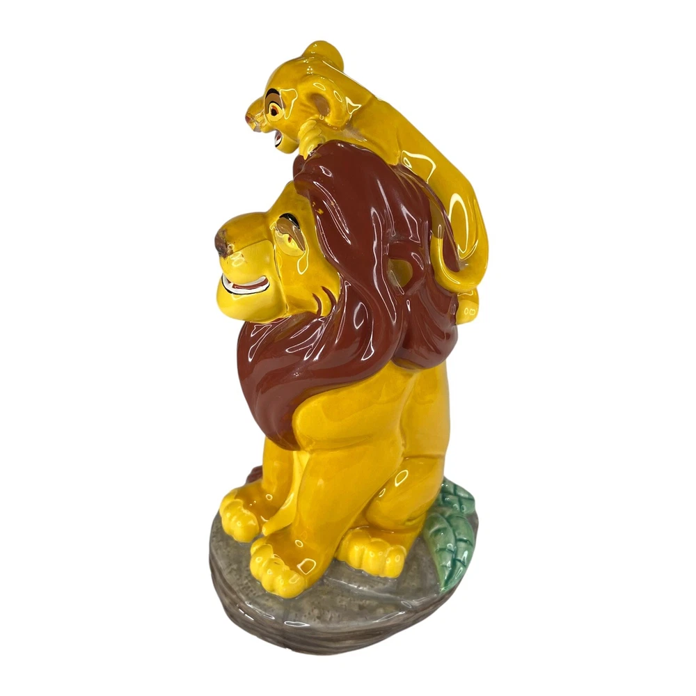 This rare Disney Lion King Mufasa and Simba ceramic coin bank is a must-have for any Disney collector. The bank features the iconic duo from the beloved movie and is in excellent shape for its age. The nose of the bank has some minor repairs, but this does not detract from the overall value of this piece.