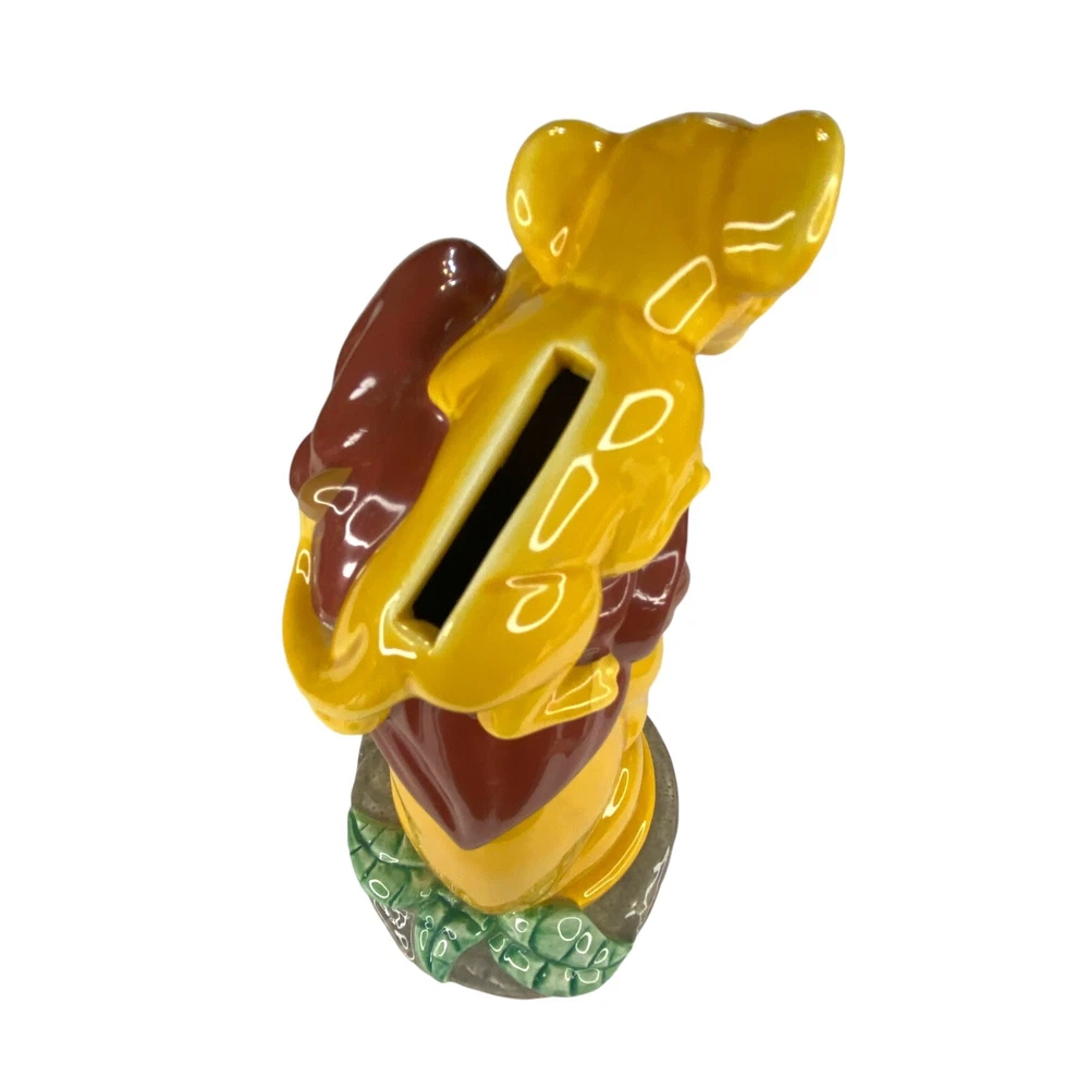 This rare Disney Lion King Mufasa and Simba ceramic coin bank is a must-have for any Disney collector. The bank features the iconic duo from the beloved movie and is in excellent shape for its age. The nose of the bank has some minor repairs, but this does not detract from the overall value of this piece.