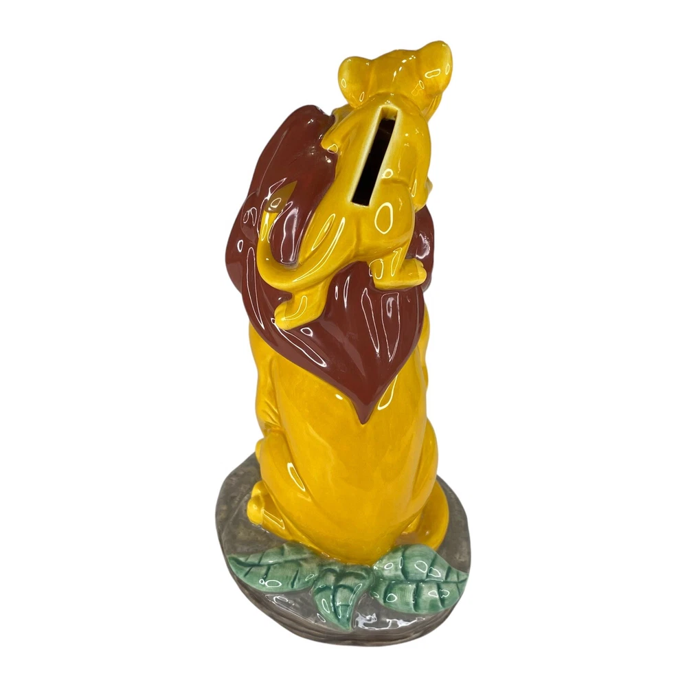 This rare Disney Lion King Mufasa and Simba ceramic coin bank is a must-have for any Disney collector. The bank features the iconic duo from the beloved movie and is in excellent shape for its age. The nose of the bank has some minor repairs, but this does not detract from the overall value of this piece.