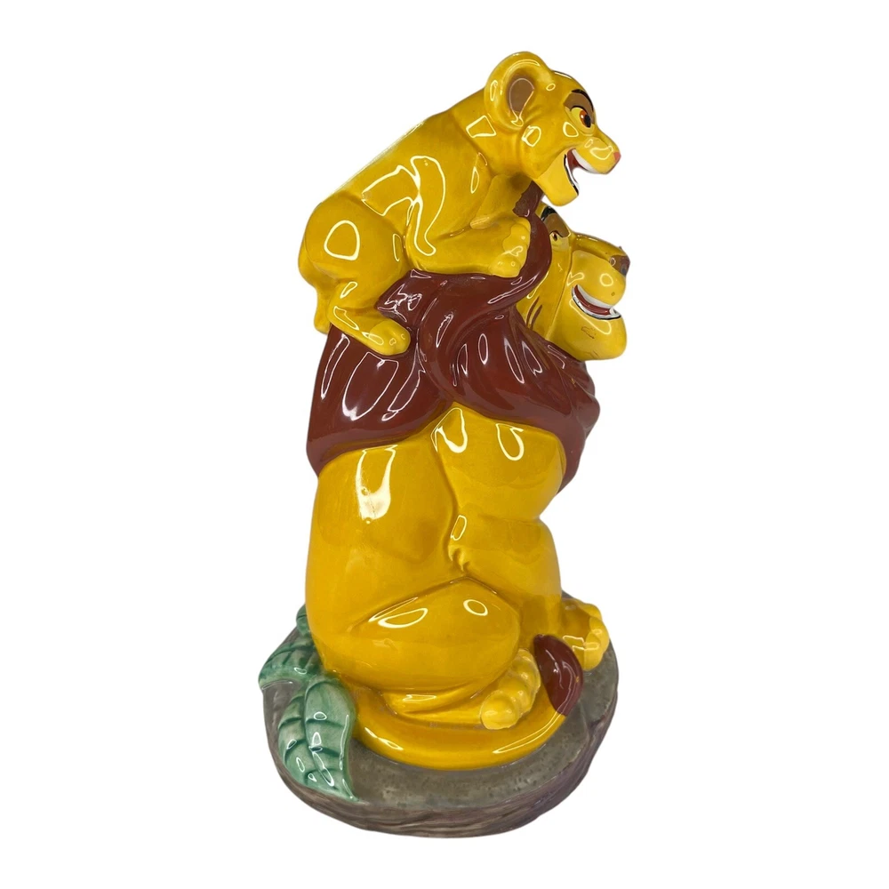 This rare Disney Lion King Mufasa and Simba ceramic coin bank is a must-have for any Disney collector. The bank features the iconic duo from the beloved movie and is in excellent shape for its age. The nose of the bank has some minor repairs, but this does not detract from the overall value of this piece.