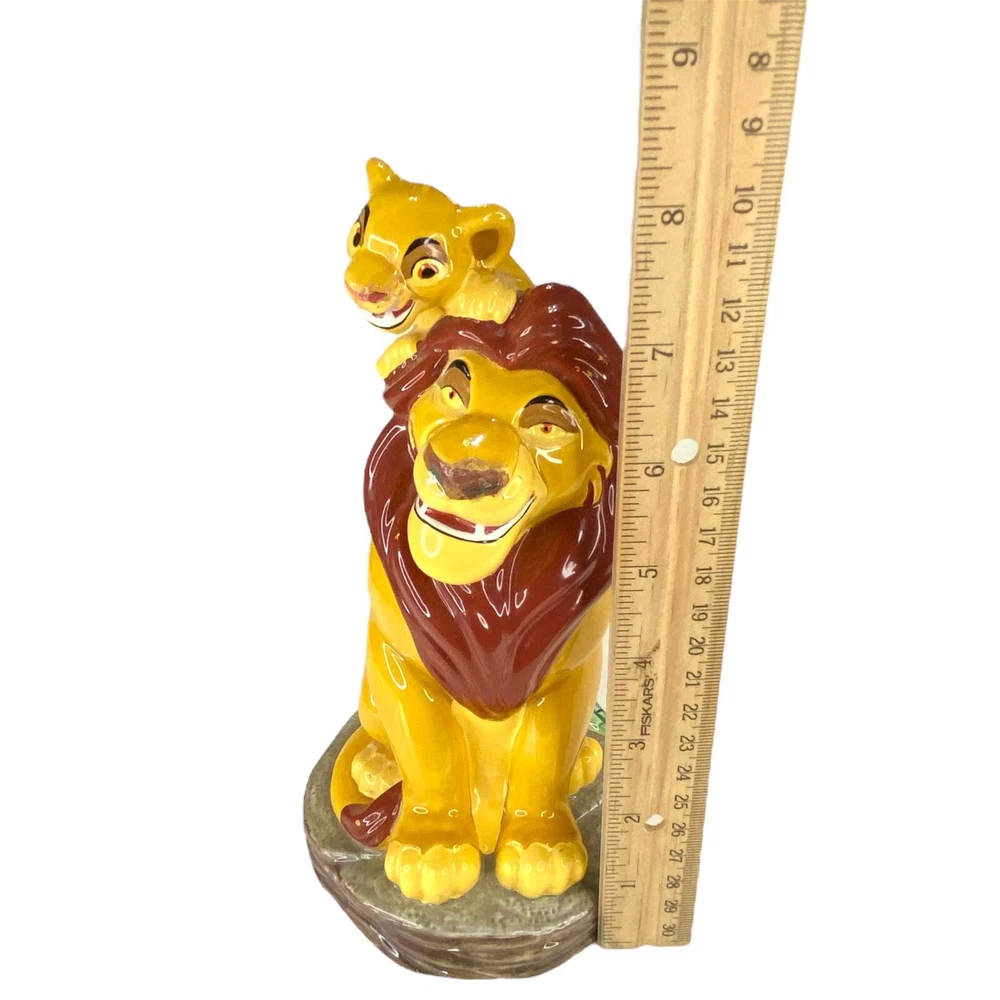 This rare Disney Lion King Mufasa and Simba ceramic coin bank is a must-have for any Disney collector. The bank features the iconic duo from the beloved movie and is in excellent shape for its age. The nose of the bank has some minor repairs, but this does not detract from the overall value of this piece.
