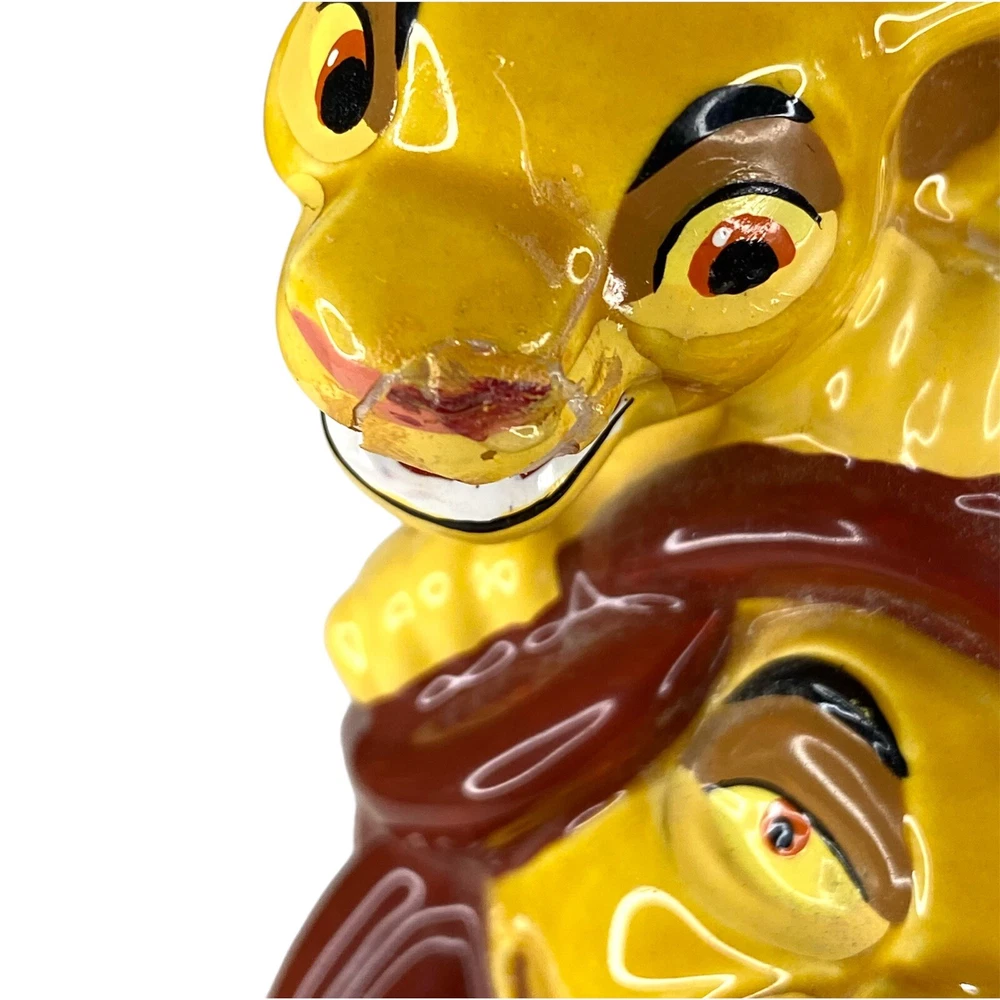This rare Disney Lion King Mufasa and Simba ceramic coin bank is a must-have for any Disney collector. The bank features the iconic duo from the beloved movie and is in excellent shape for its age. The nose of the bank has some minor repairs, but this does not detract from the overall value of this piece.