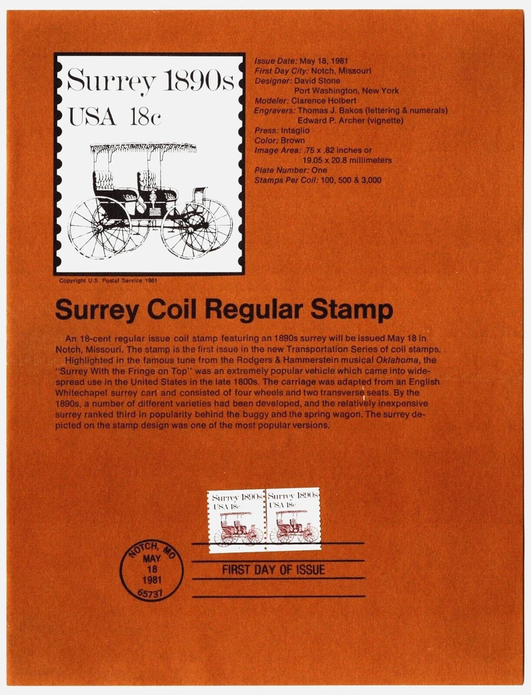 Official USPS 1981-13 Surry Souvenir Page May 18, 1981, Scott # 1907 FDC. Position 1, left is a plate # coil single, #1. Shipping cost $4.50, USPS First Class. Ship this page with any other within 3 days for an additional $1.00