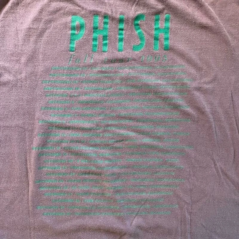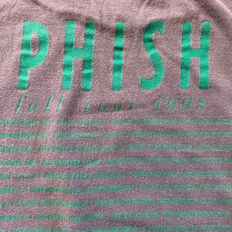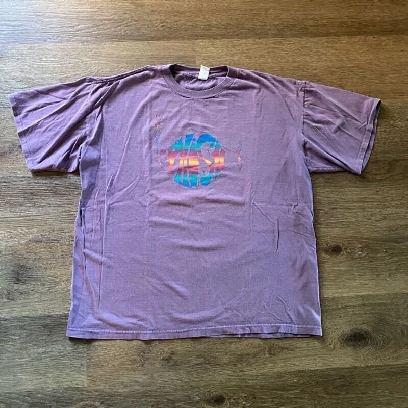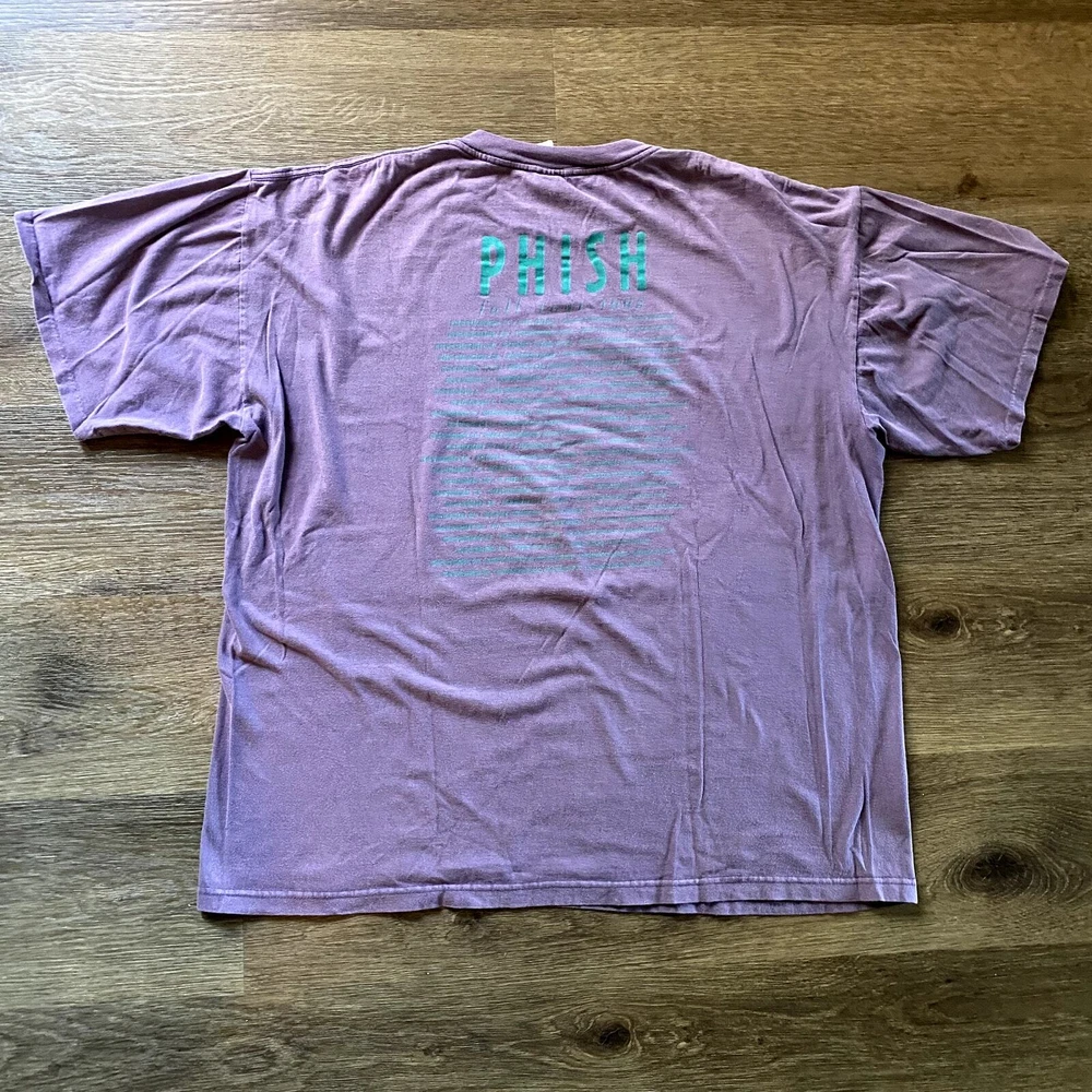 Rare vintage 1995 Phish tour tee features a vibrant rainbow graphic, capturing the spirit of the band's iconic '95 tour. Made in the USA with single stitch sleeves, it's a true piece of concert memorabilia. The tee is marked as XL and shows some light wear, but there are no major flaws. Measurements are in the photos to ensure the perfect fit.